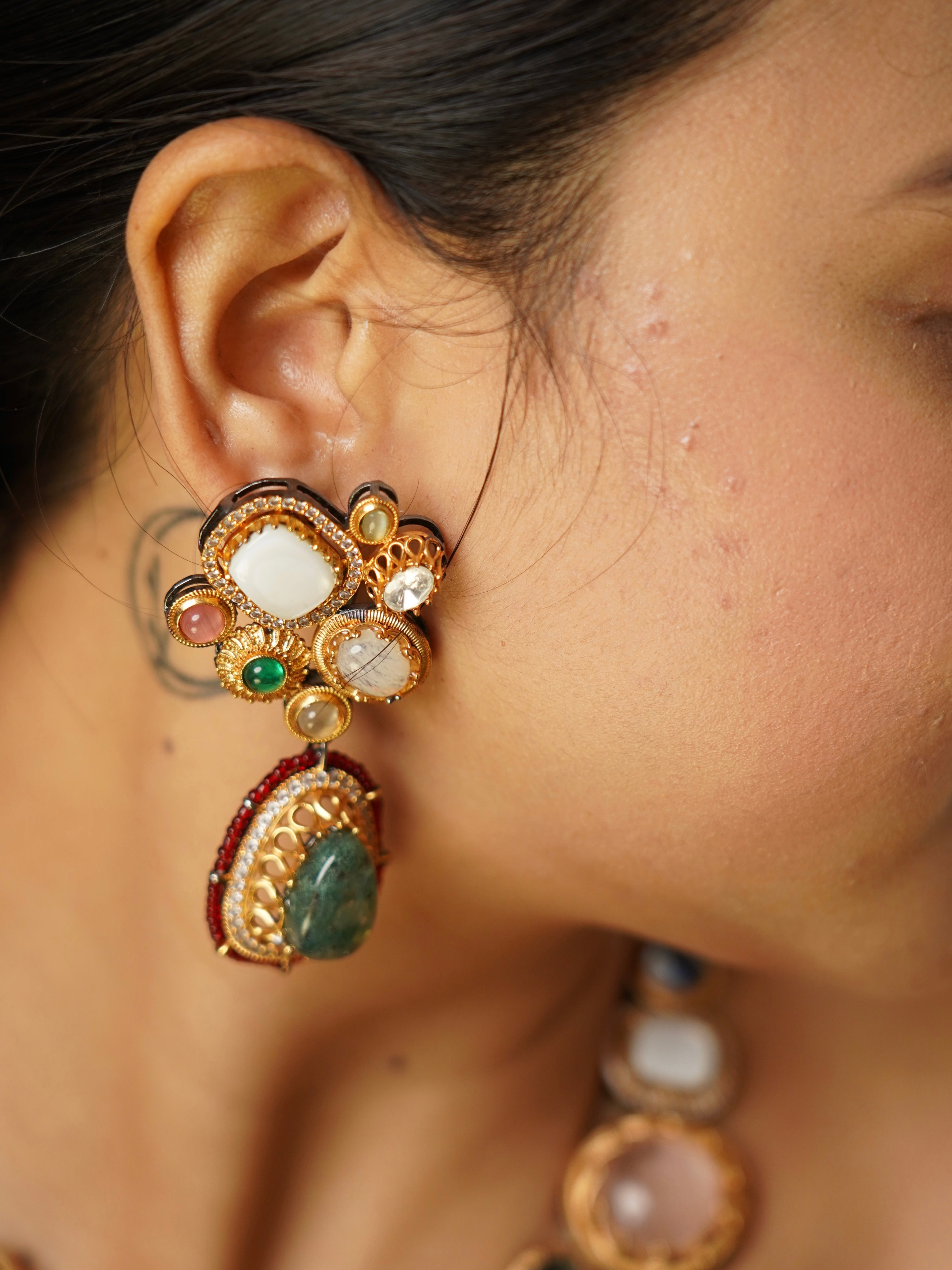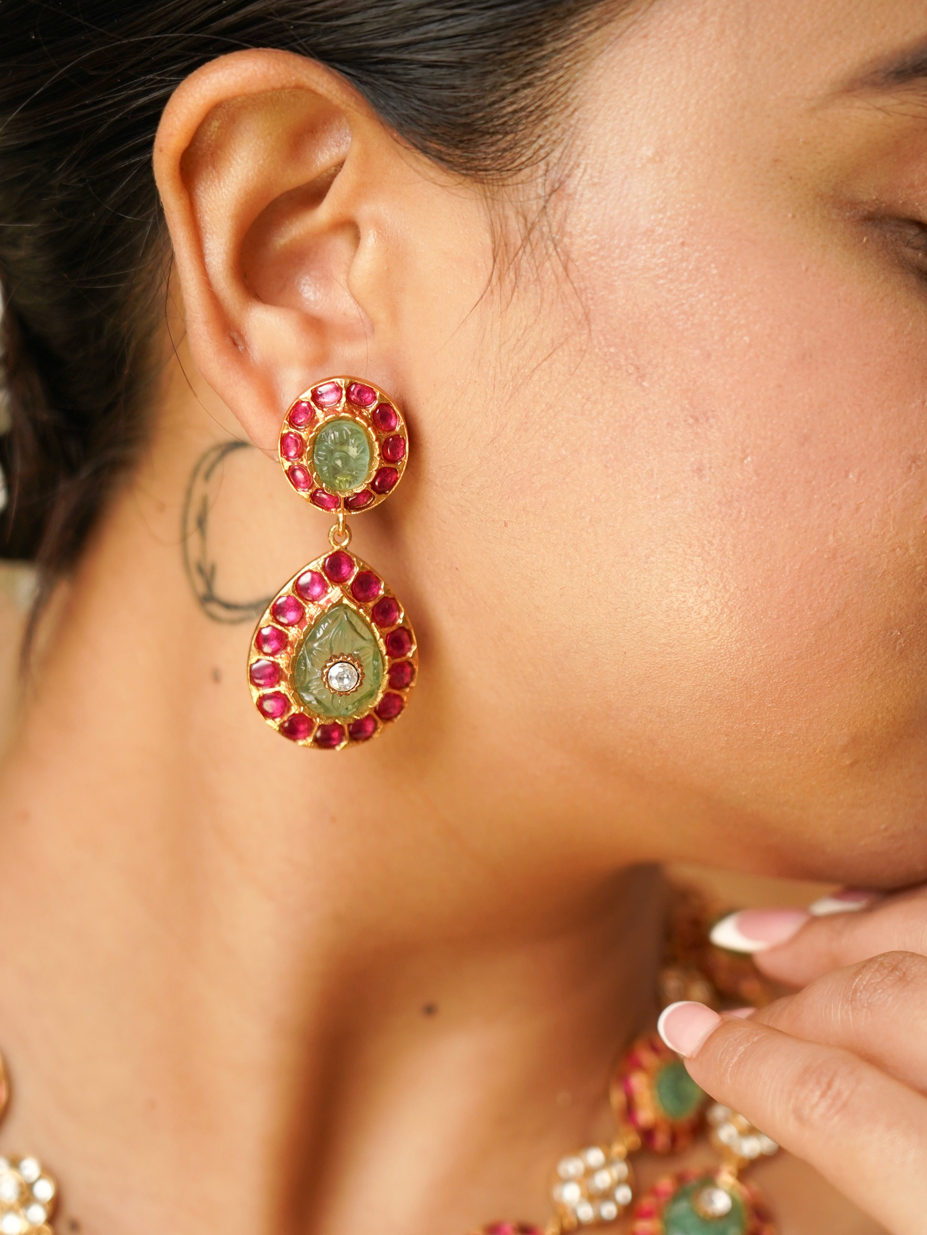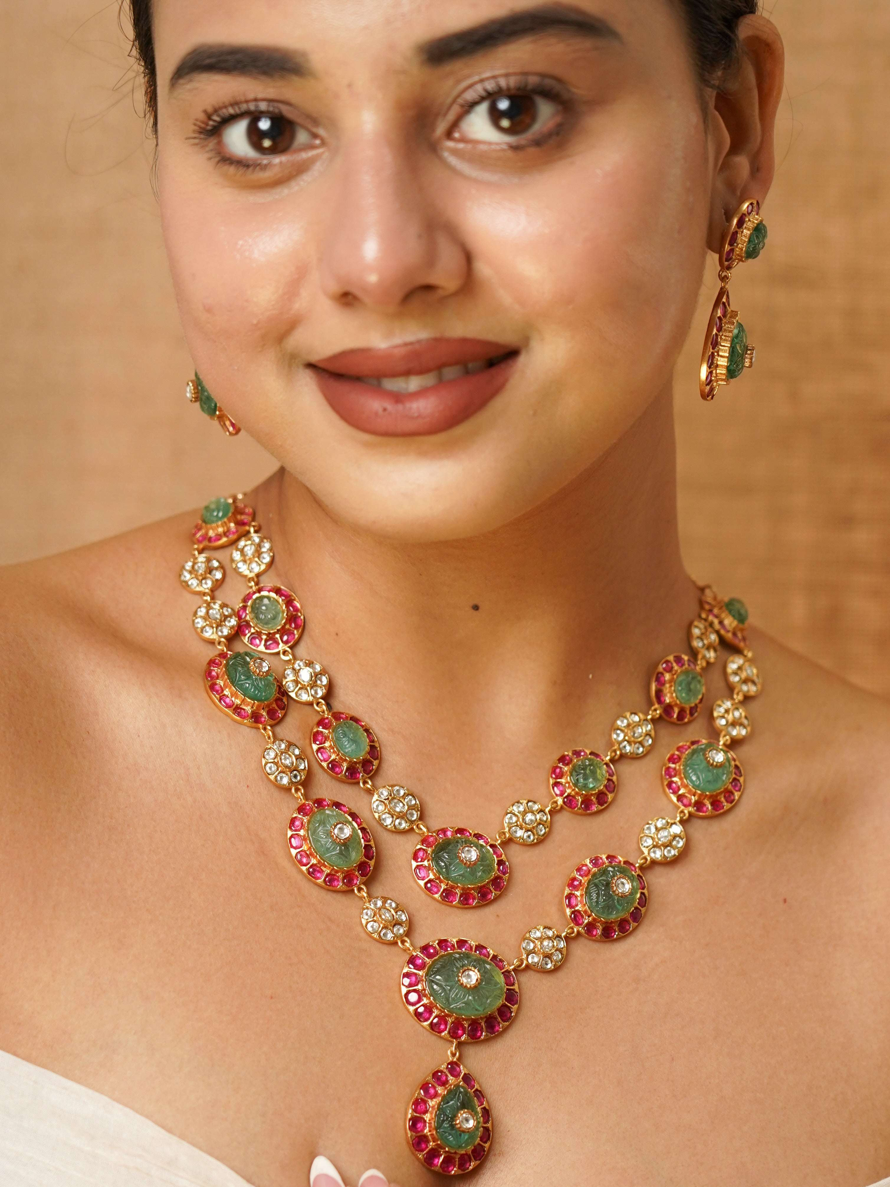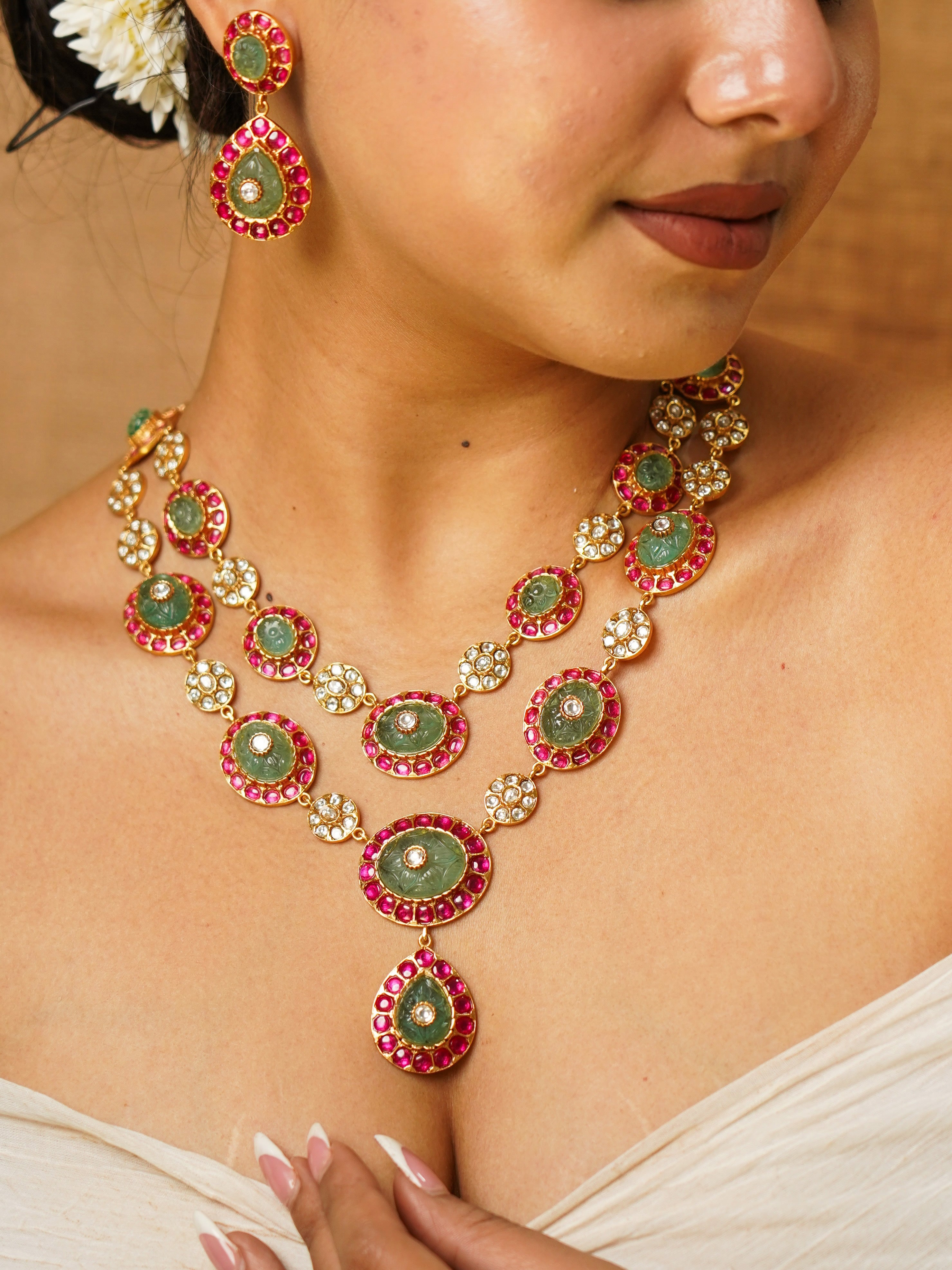Hand-Carved Green Stone & Ruby Look Heritage Set in Gold Finish