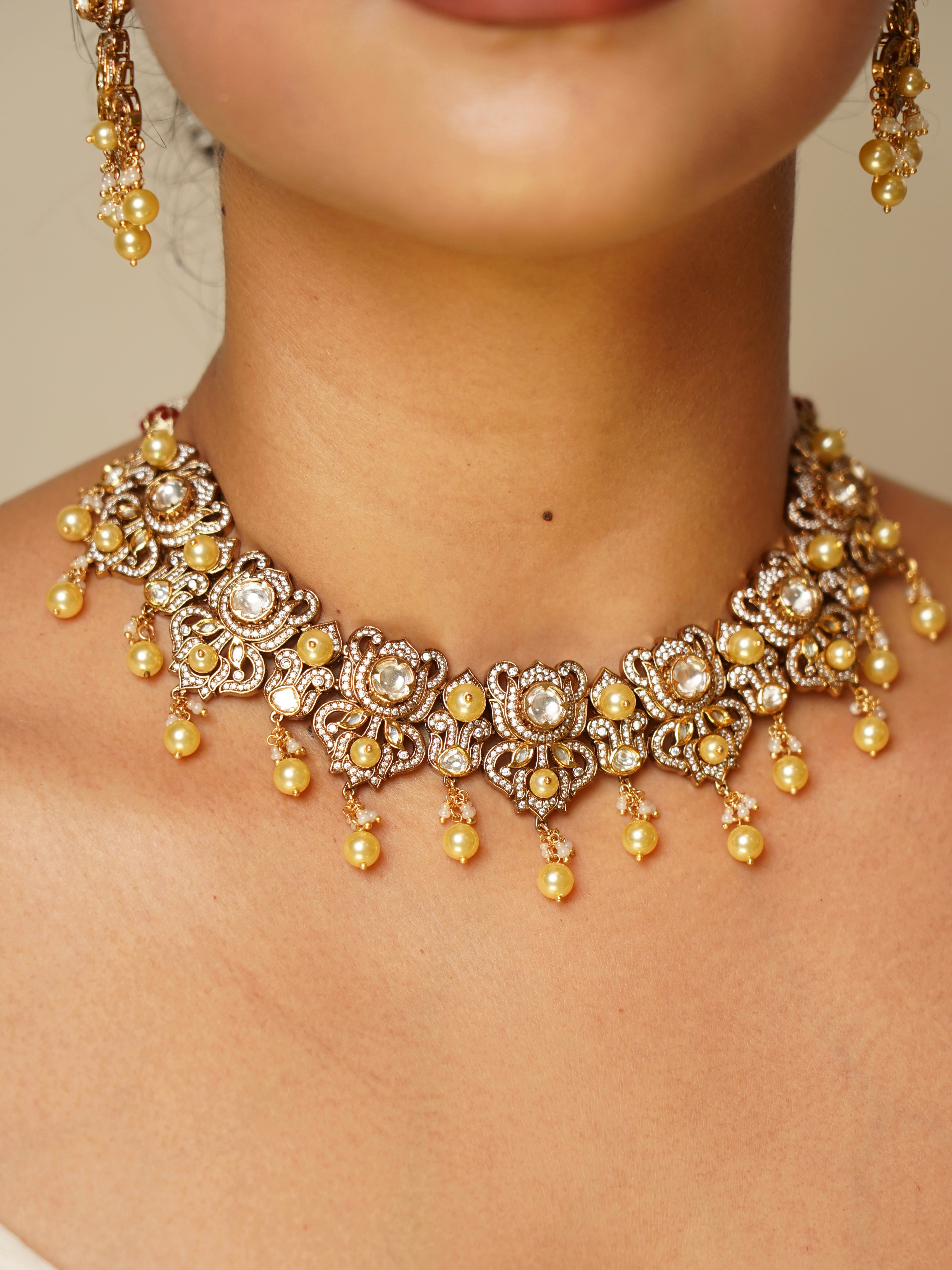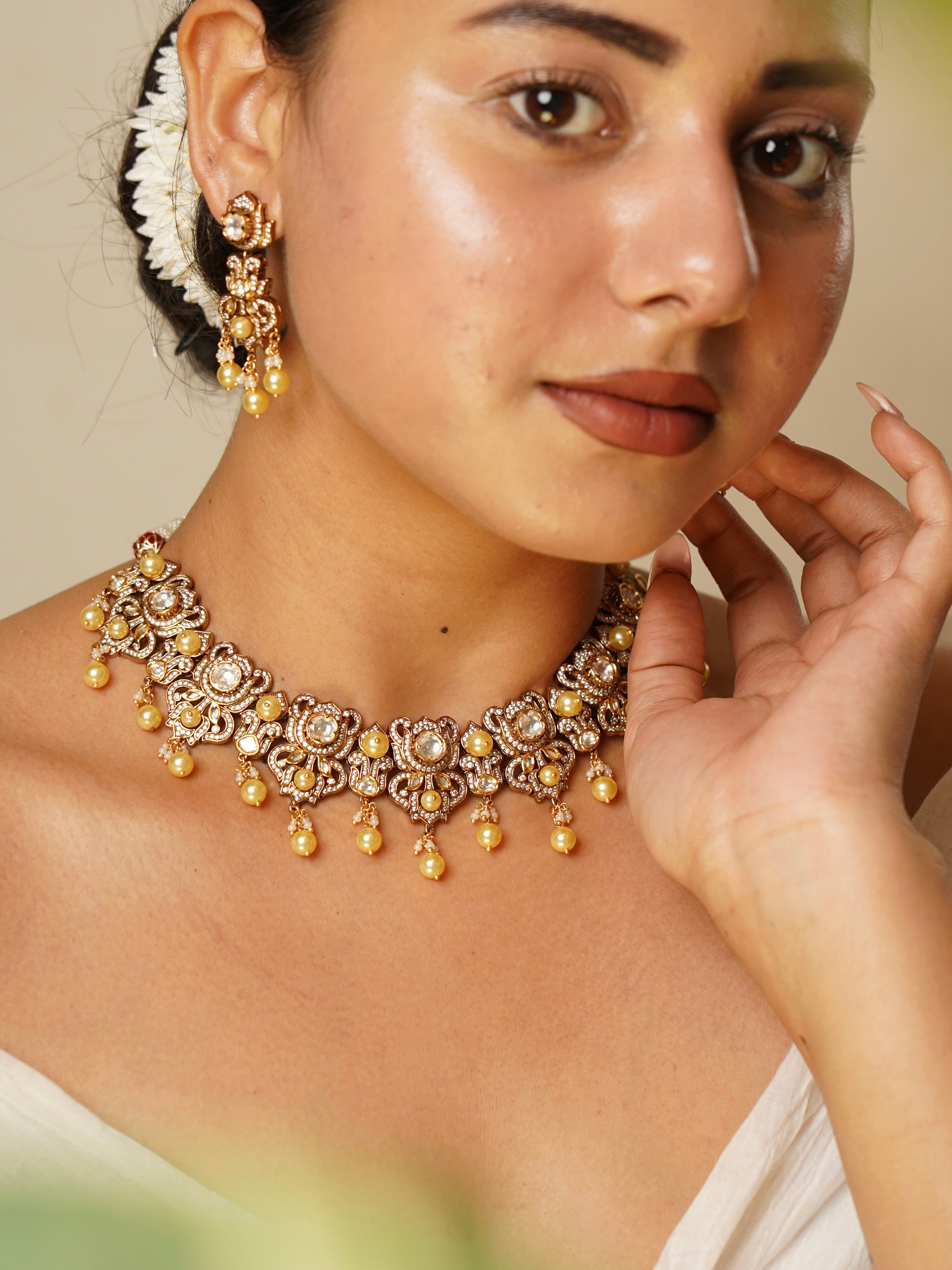 The Saanvi Vintage Pearl Polki Choker Set blends timeless artistry with royal elegance. Featuring intricate floral Polki work, gold-plated detailing, and dangling golden pearls, this statement choker exudes old-world charm. Paired with matching earrings, it’s perfect for weddings, festive occasions, and heritage-inspired looks.