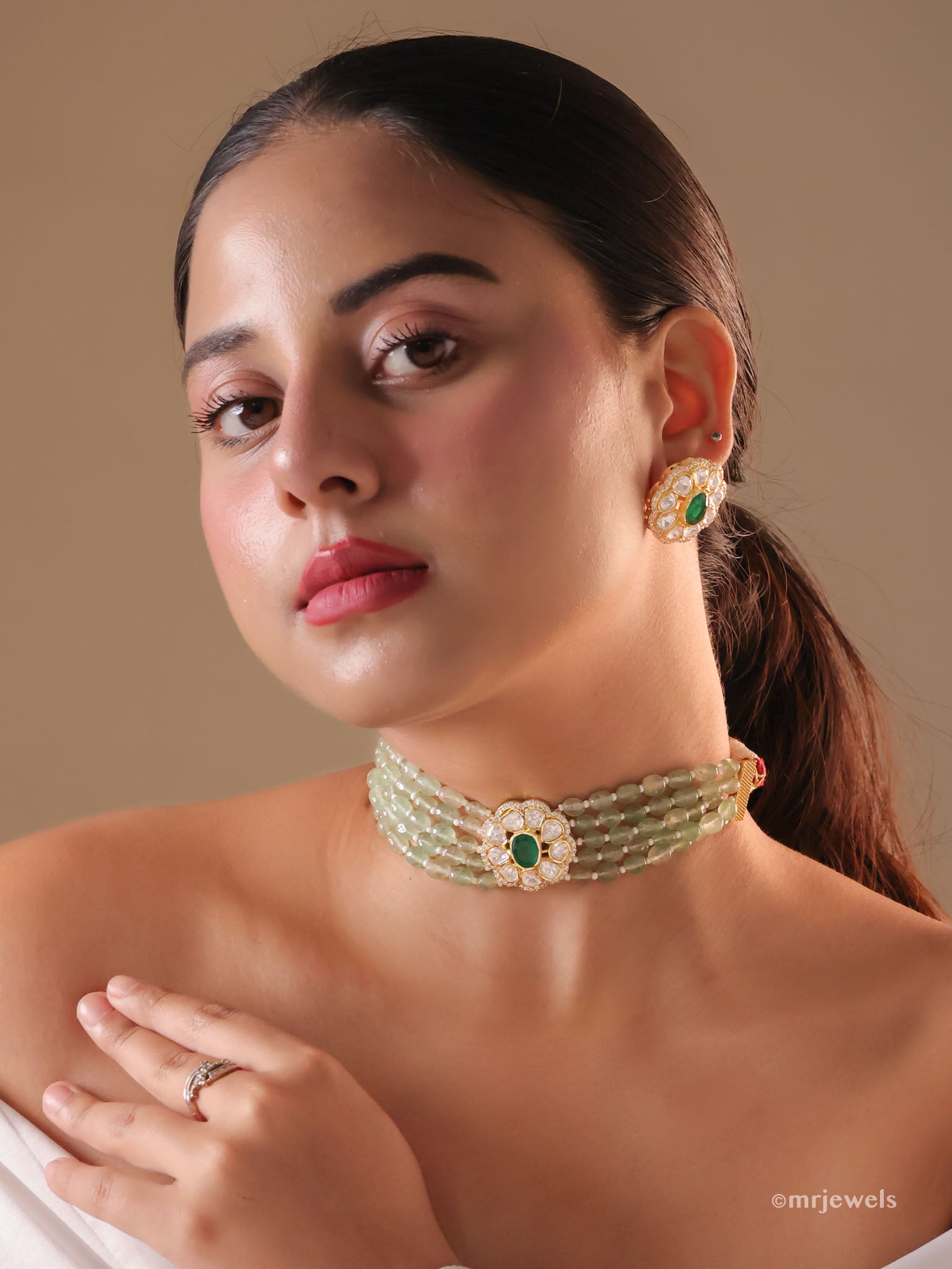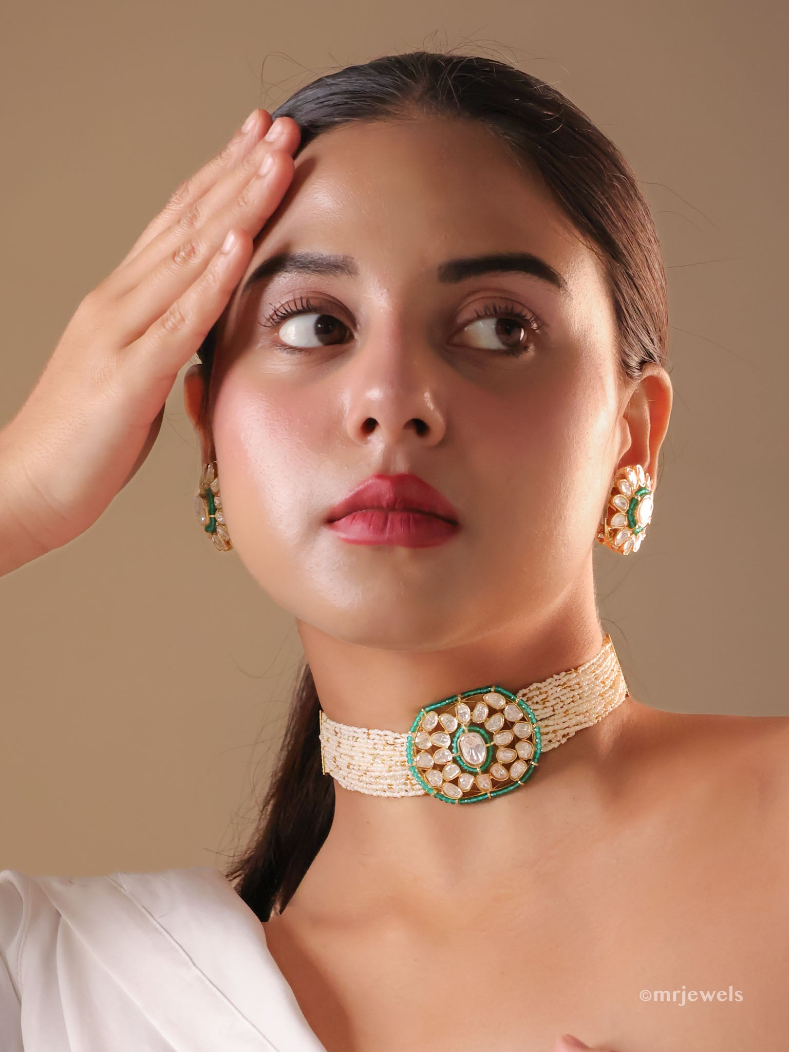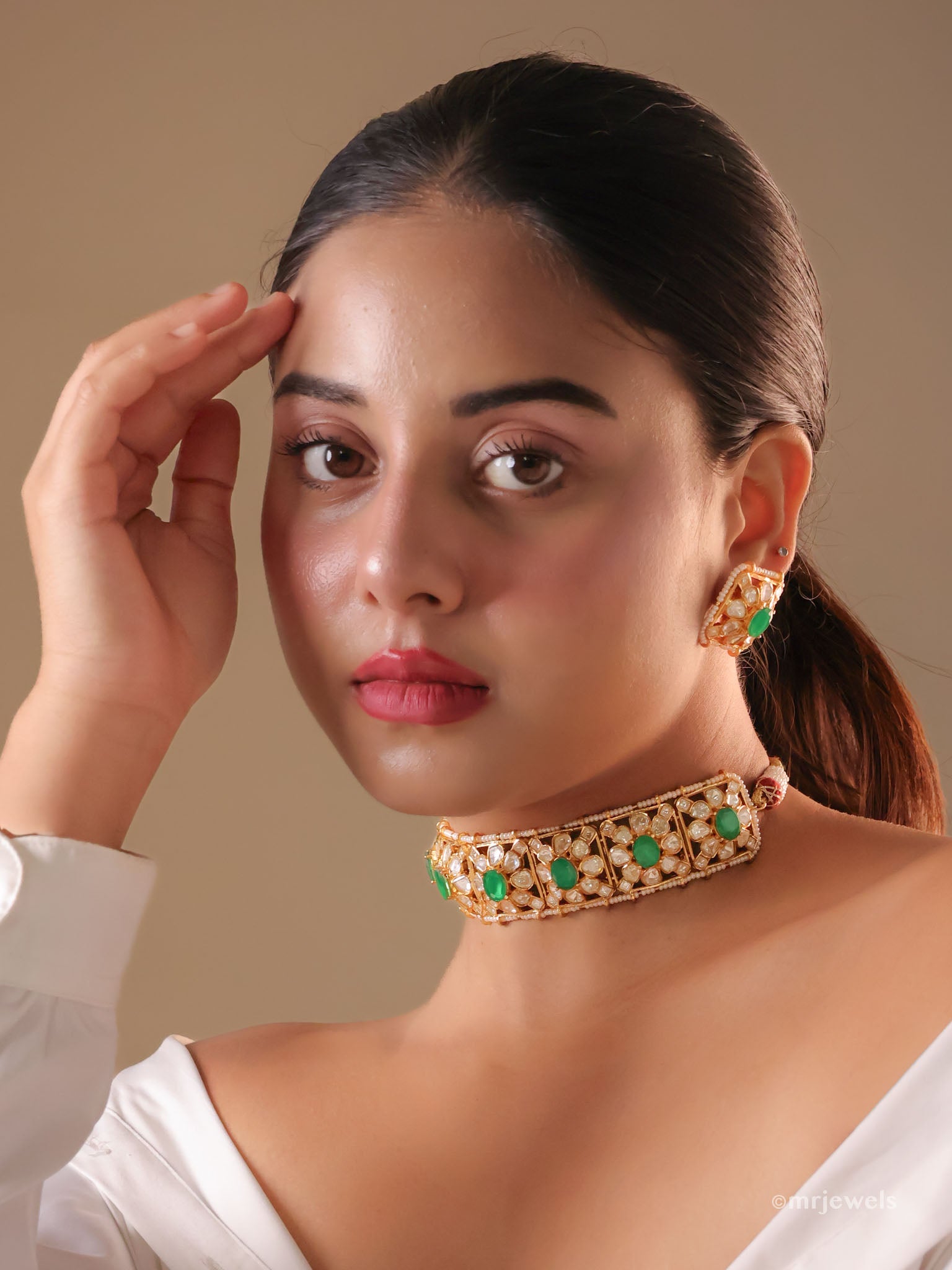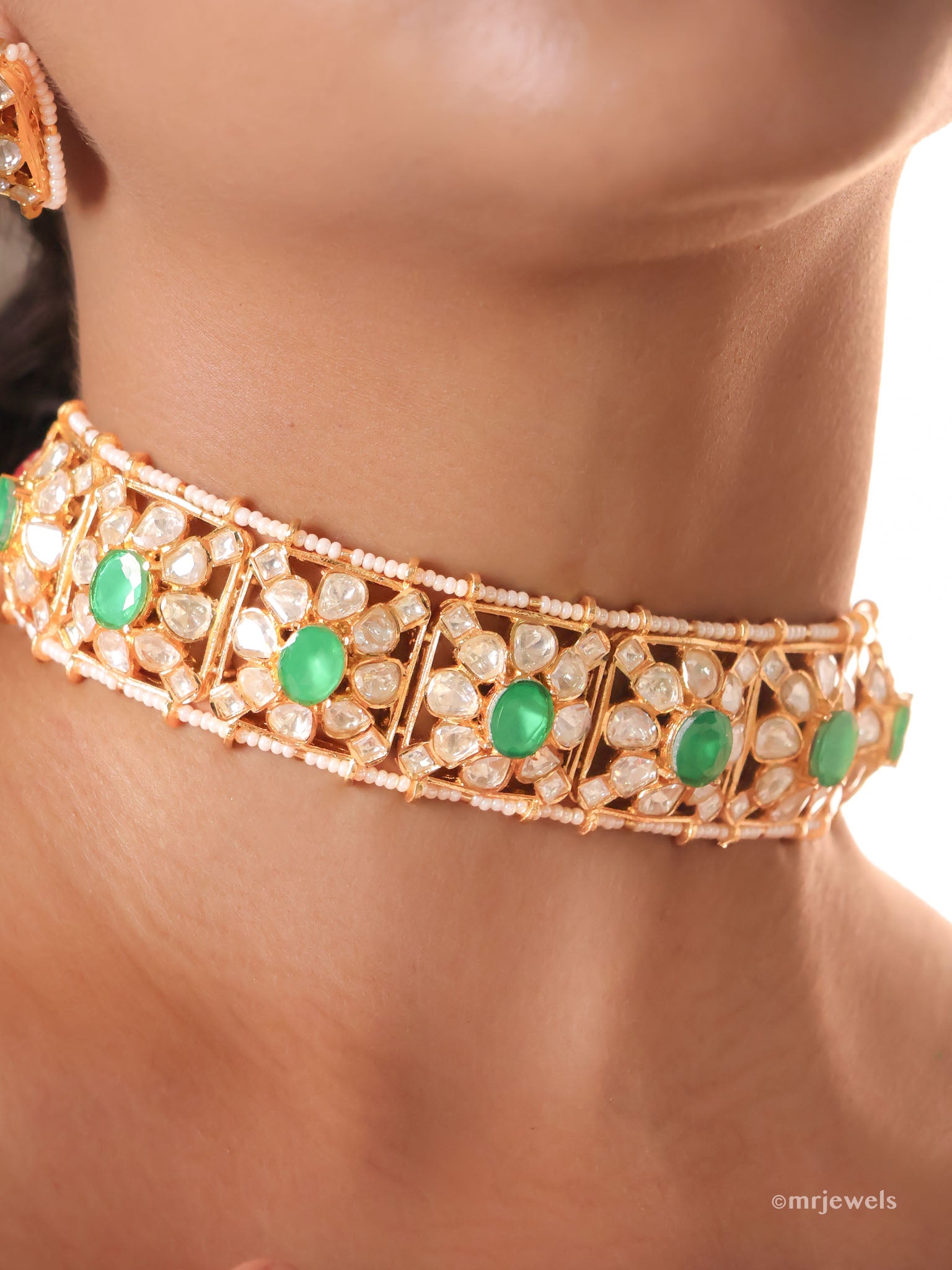 Baiza Emerald Polki Hasli Choker Set (with Studs)