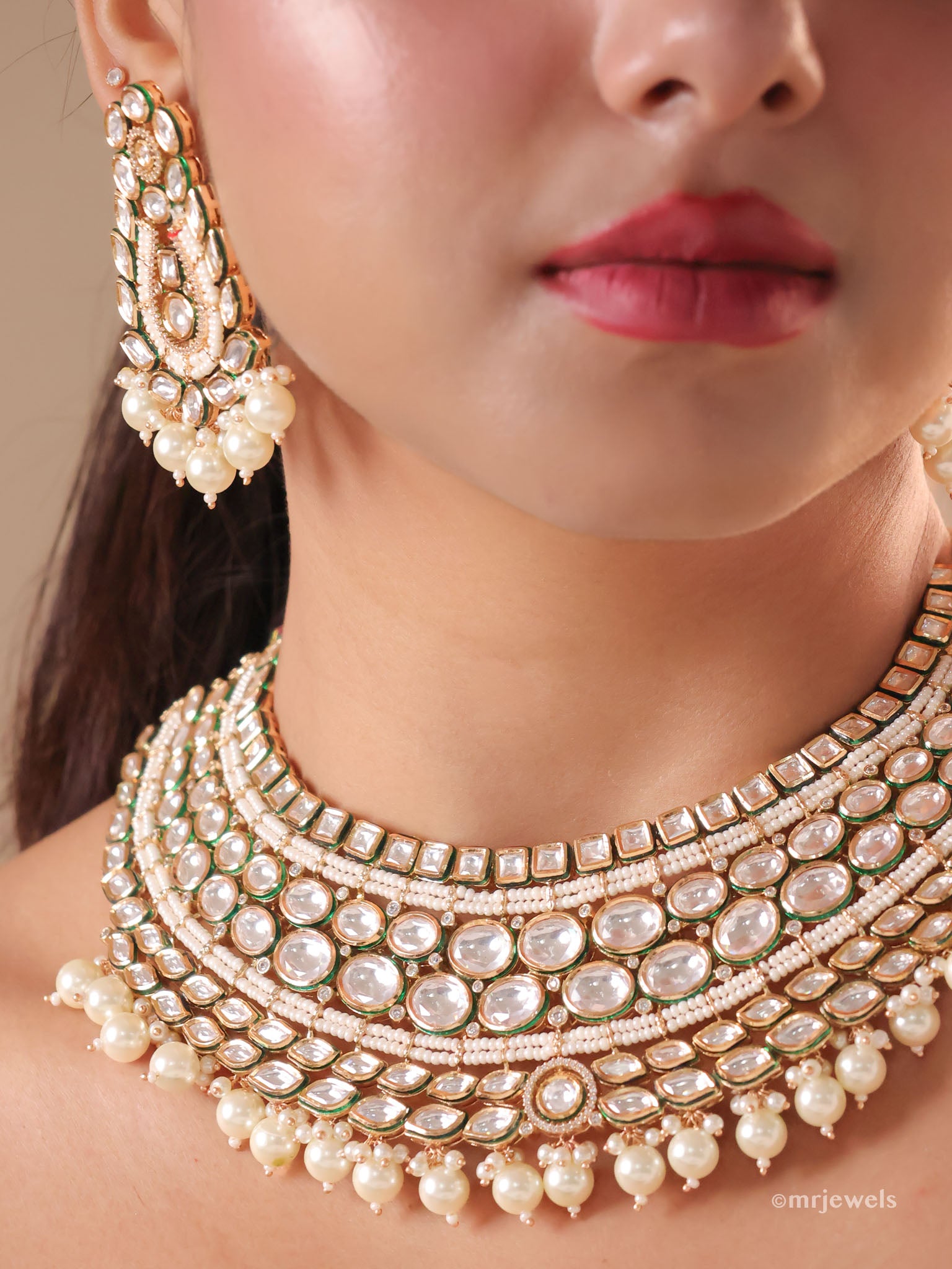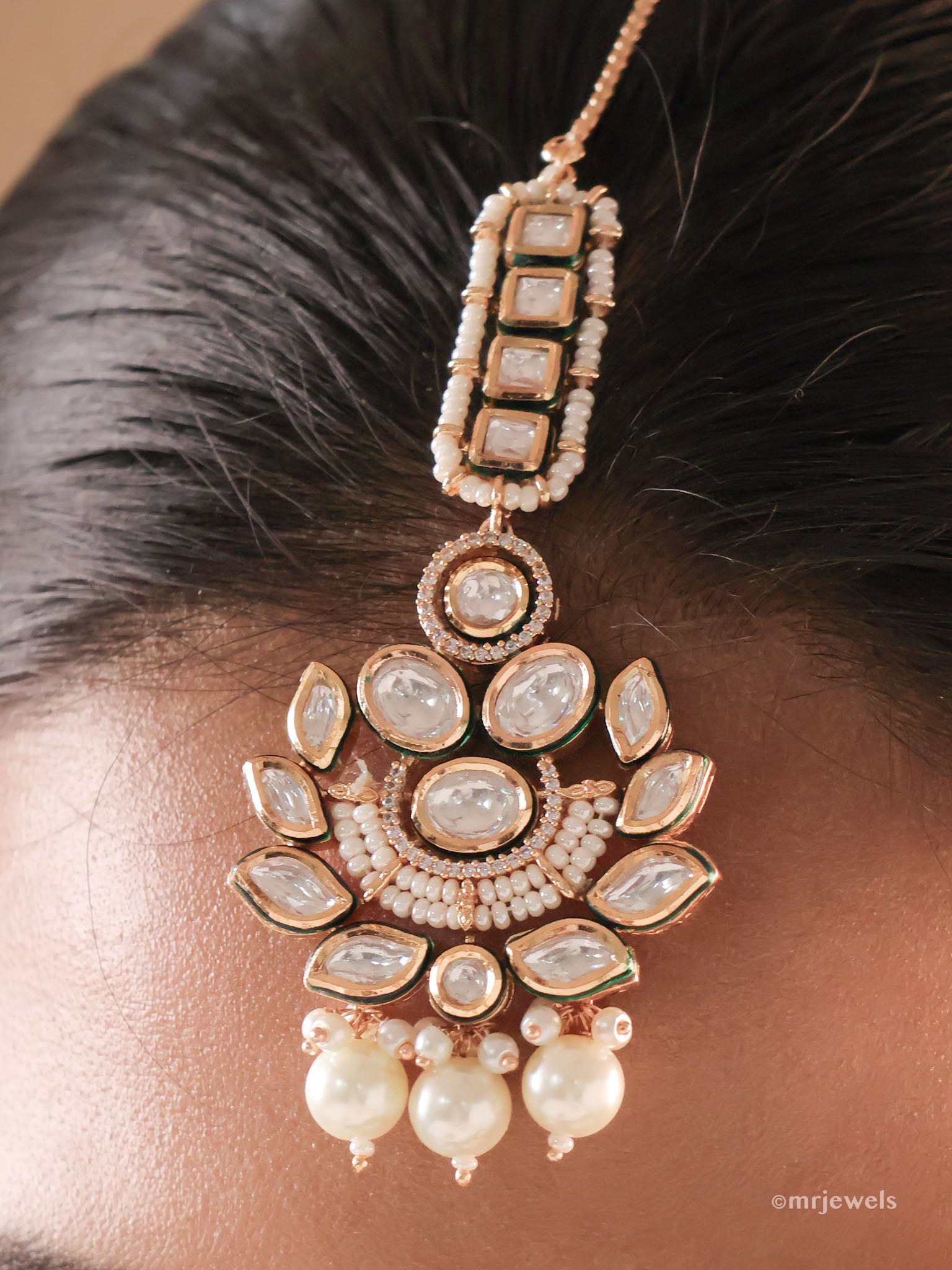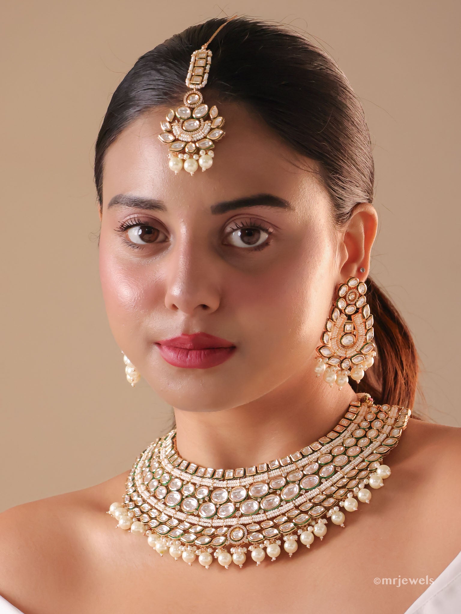 Maharani Polki Pearl Bridal Collar Set (Necklace, Earrings & Maang-Tikka)