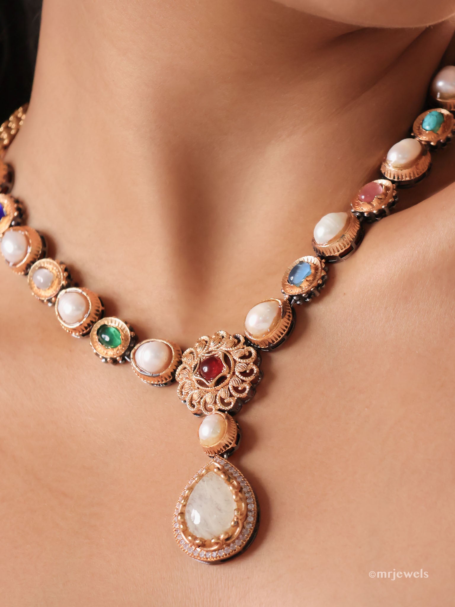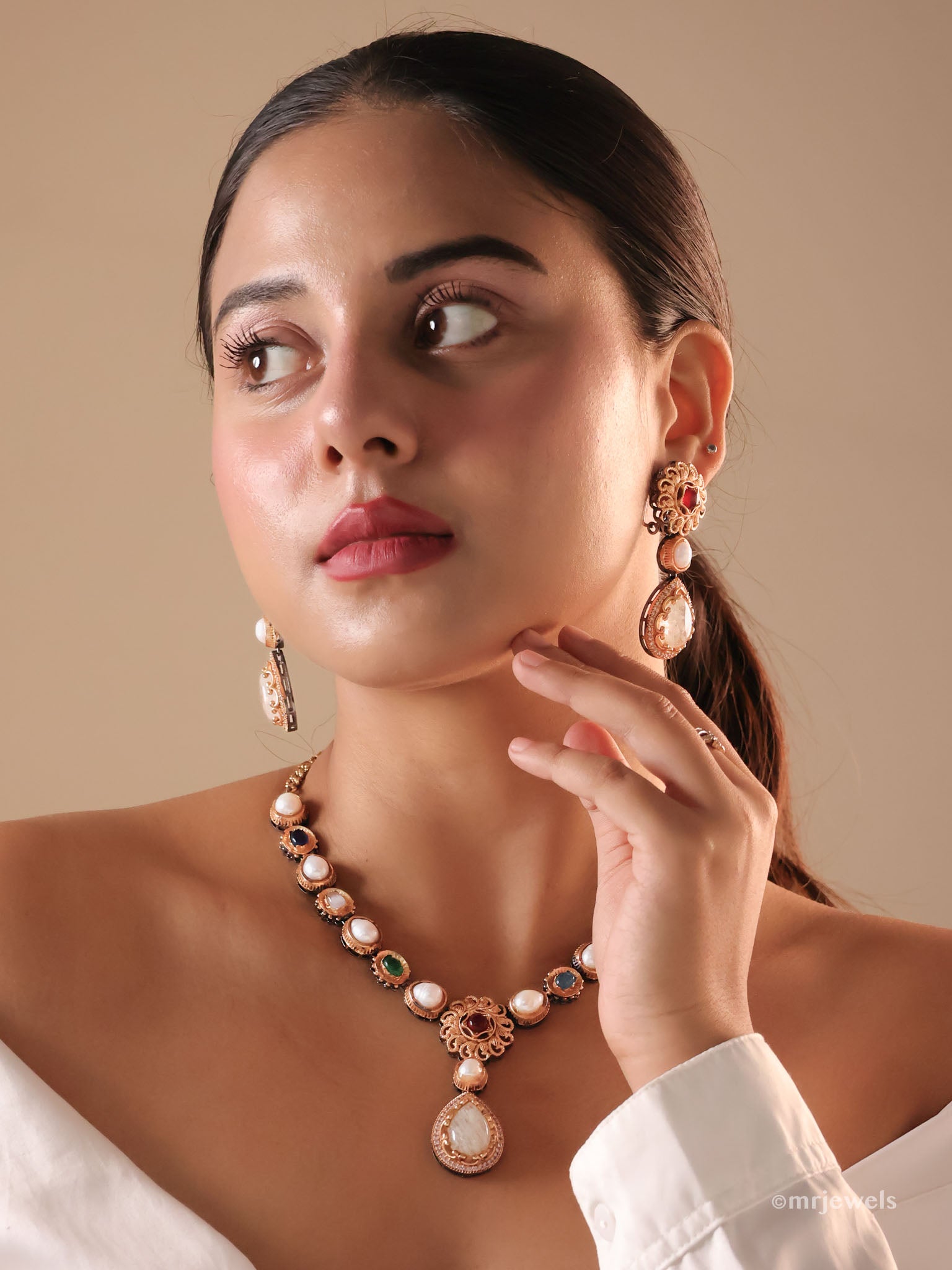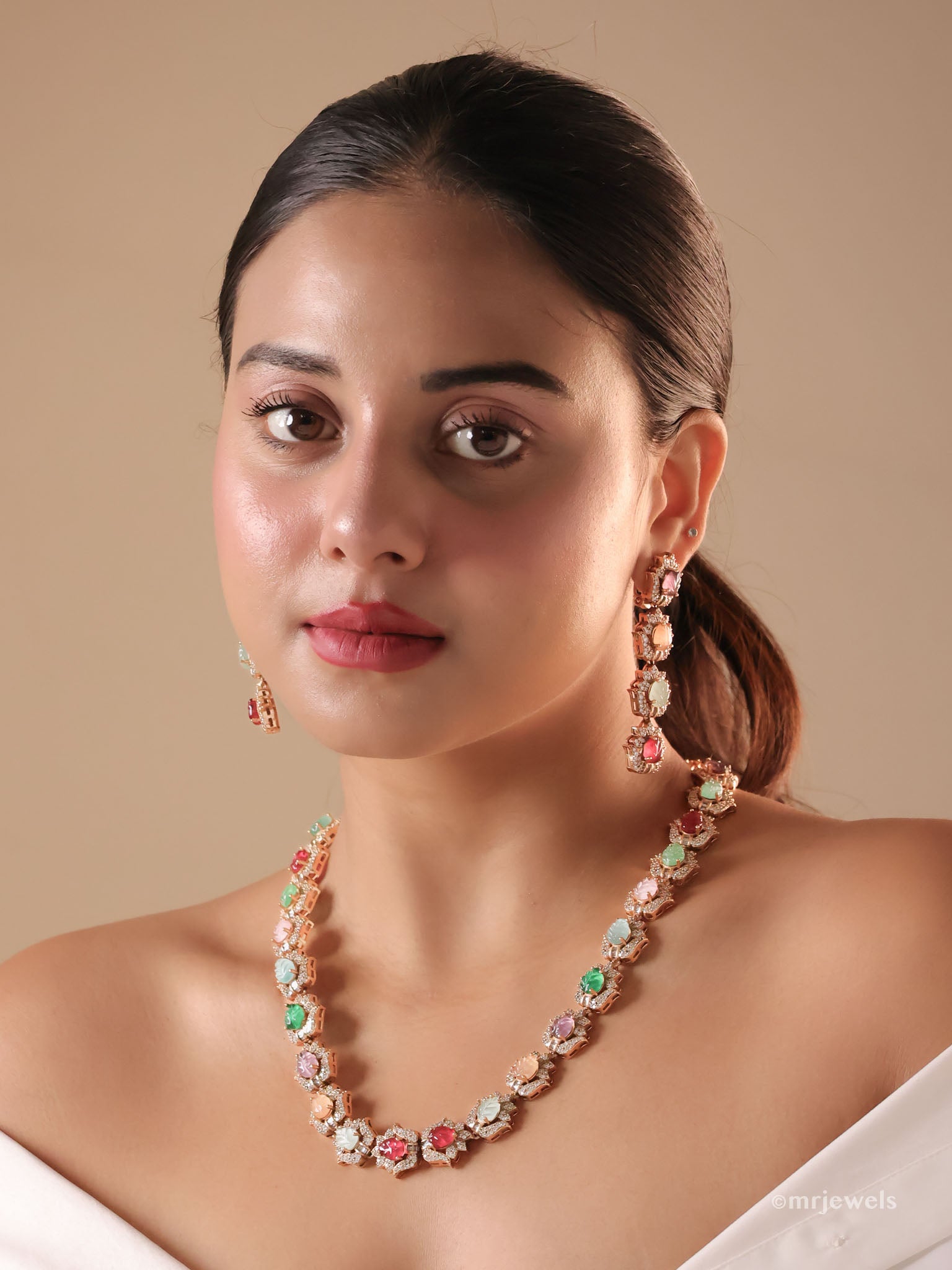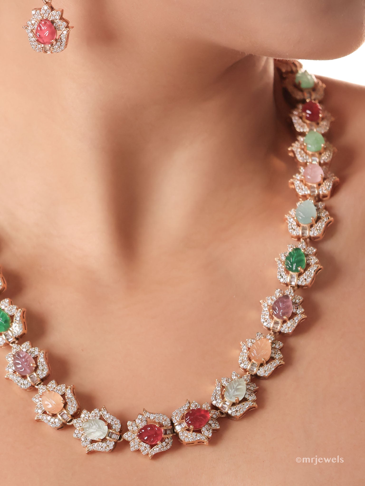 Carved Navratna Pastel Necklace Set (with Earrings)