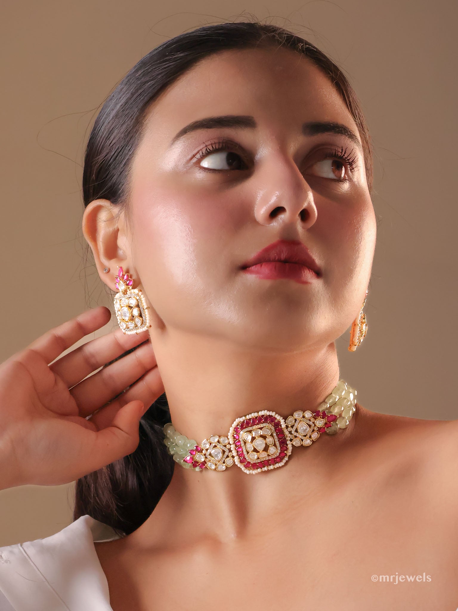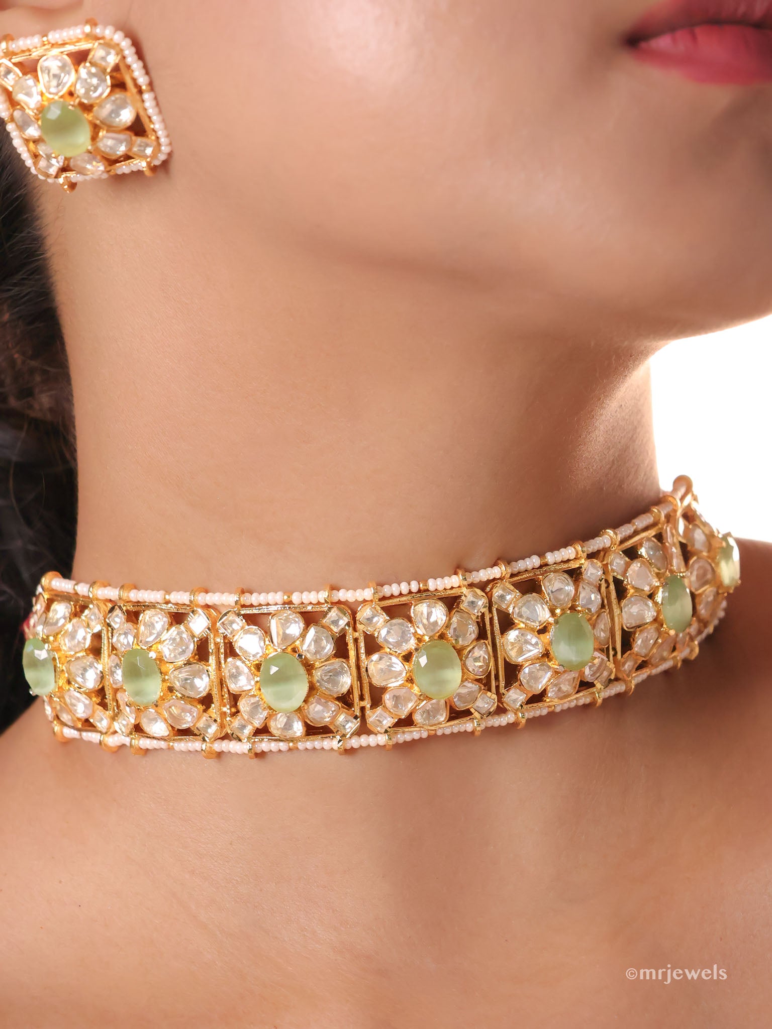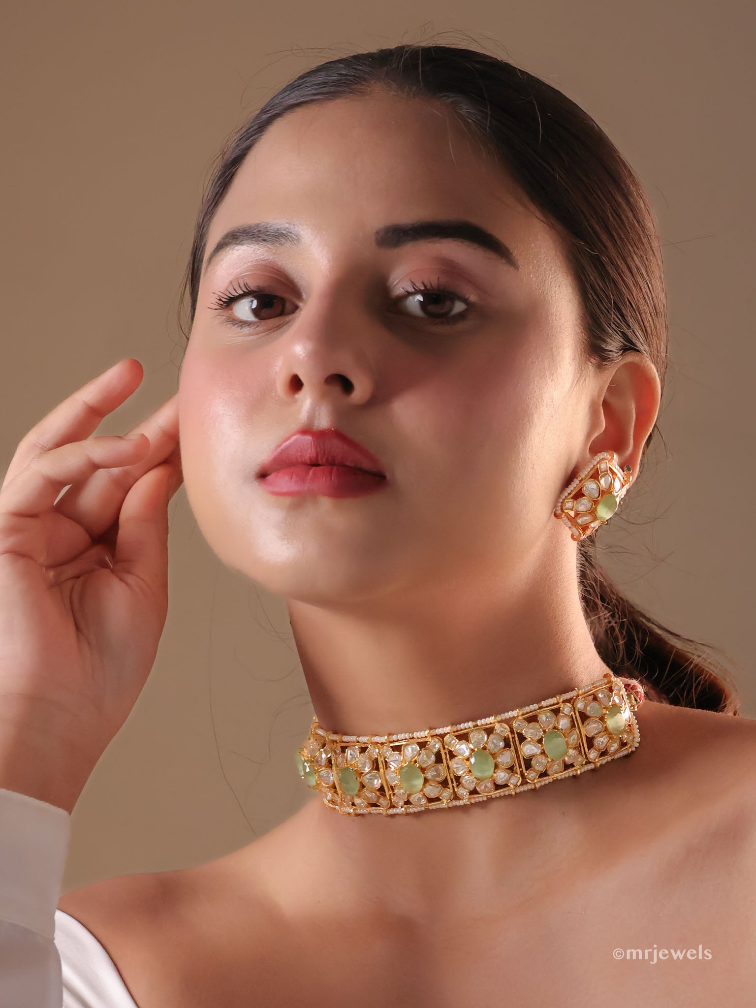 Aarzoo Emerald Polki Grid Choker Set (with Studs)