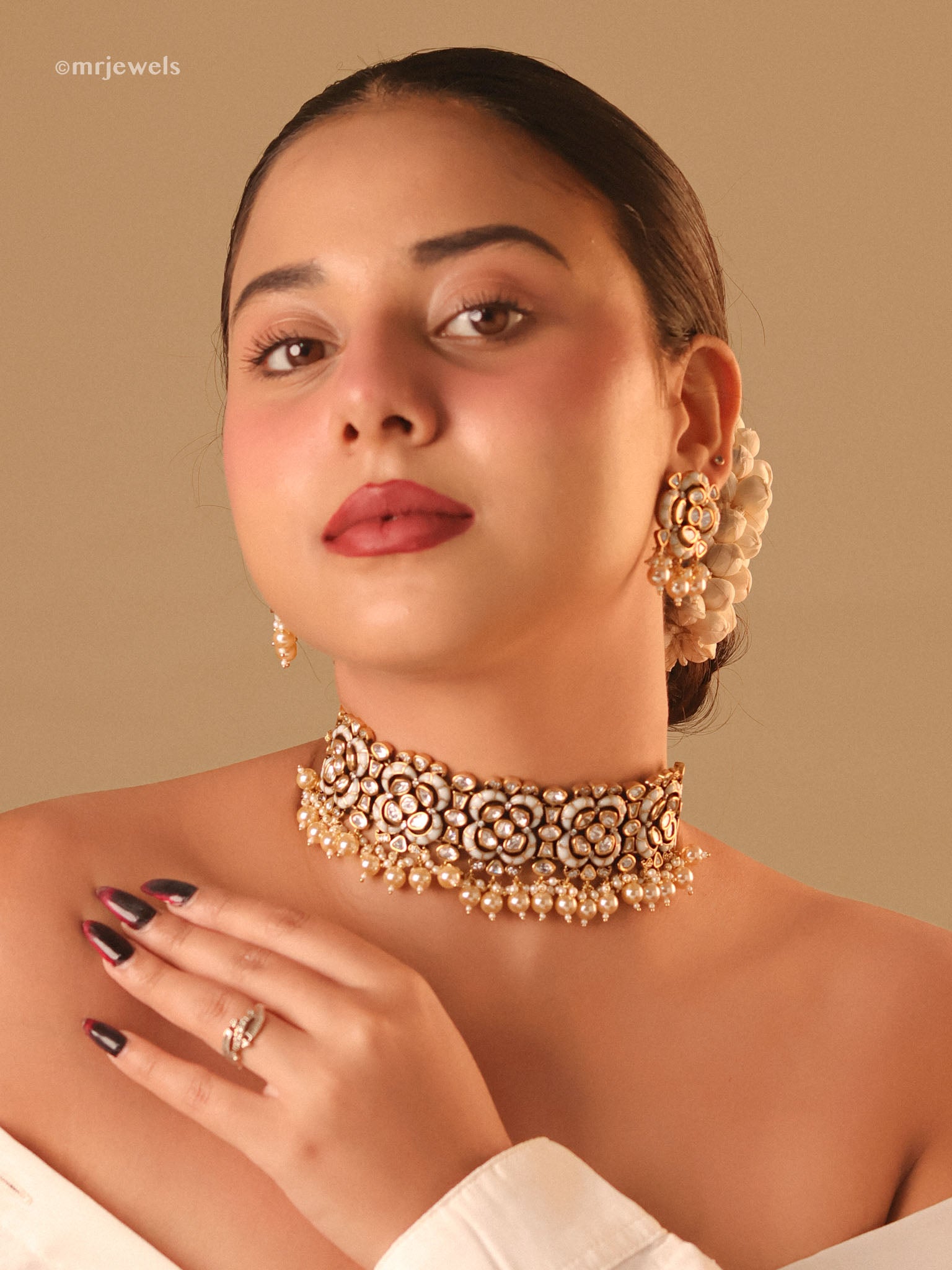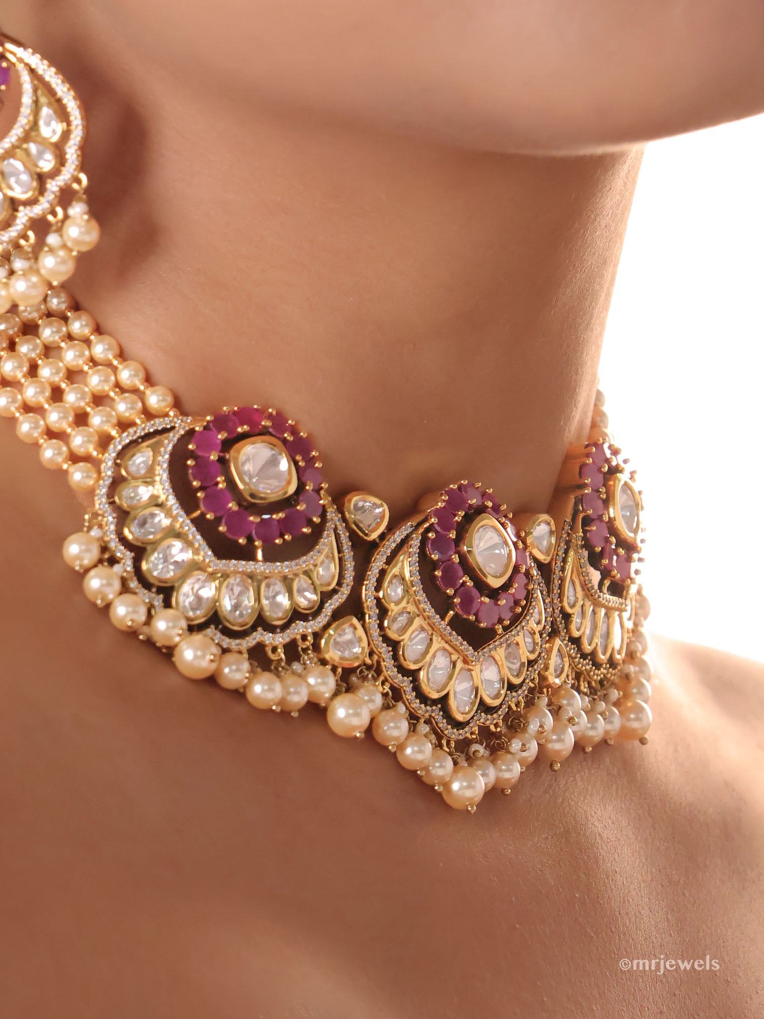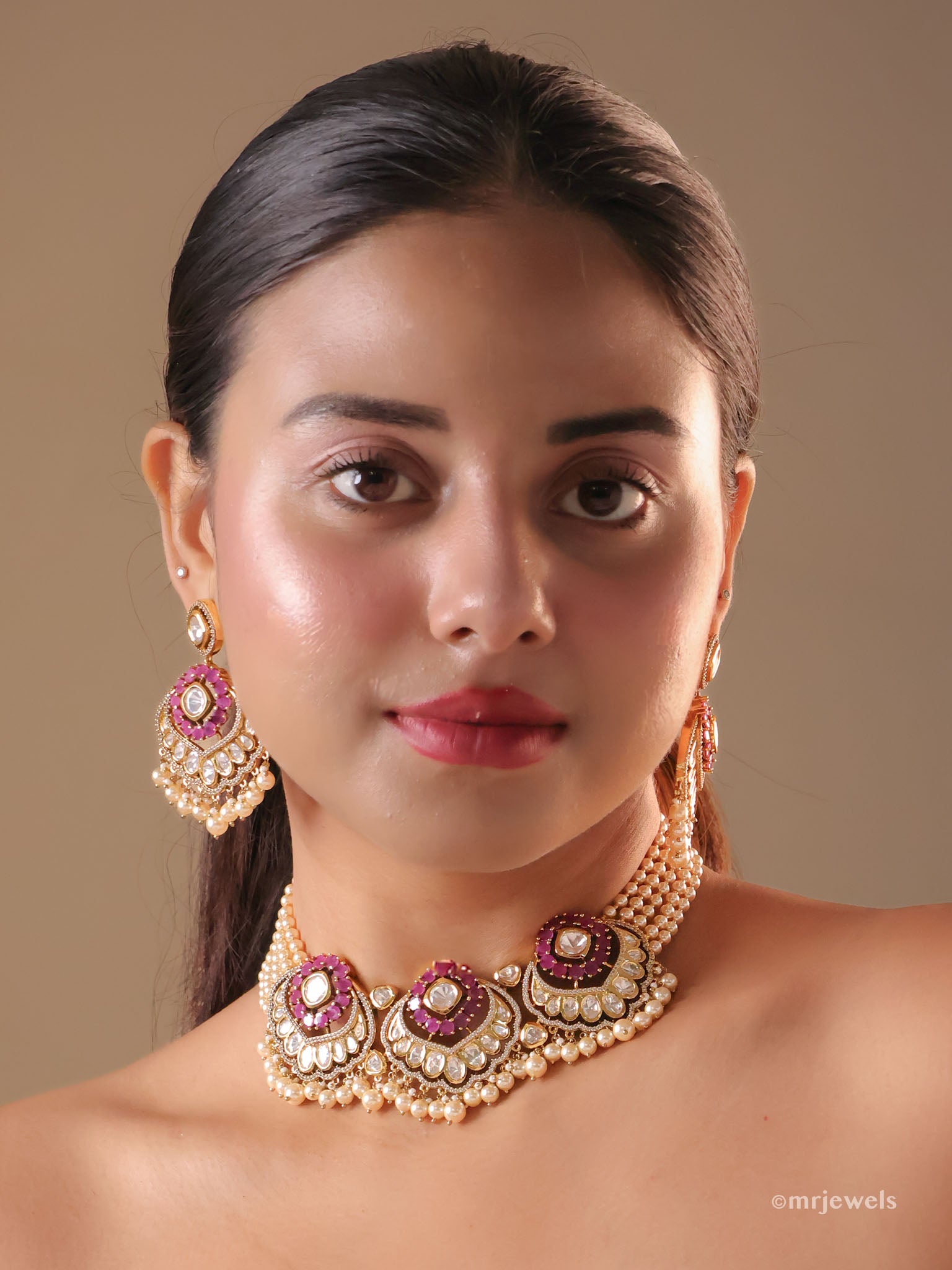 Gulabi Meenakari Polki Pearl Choker Set (with Earrings)