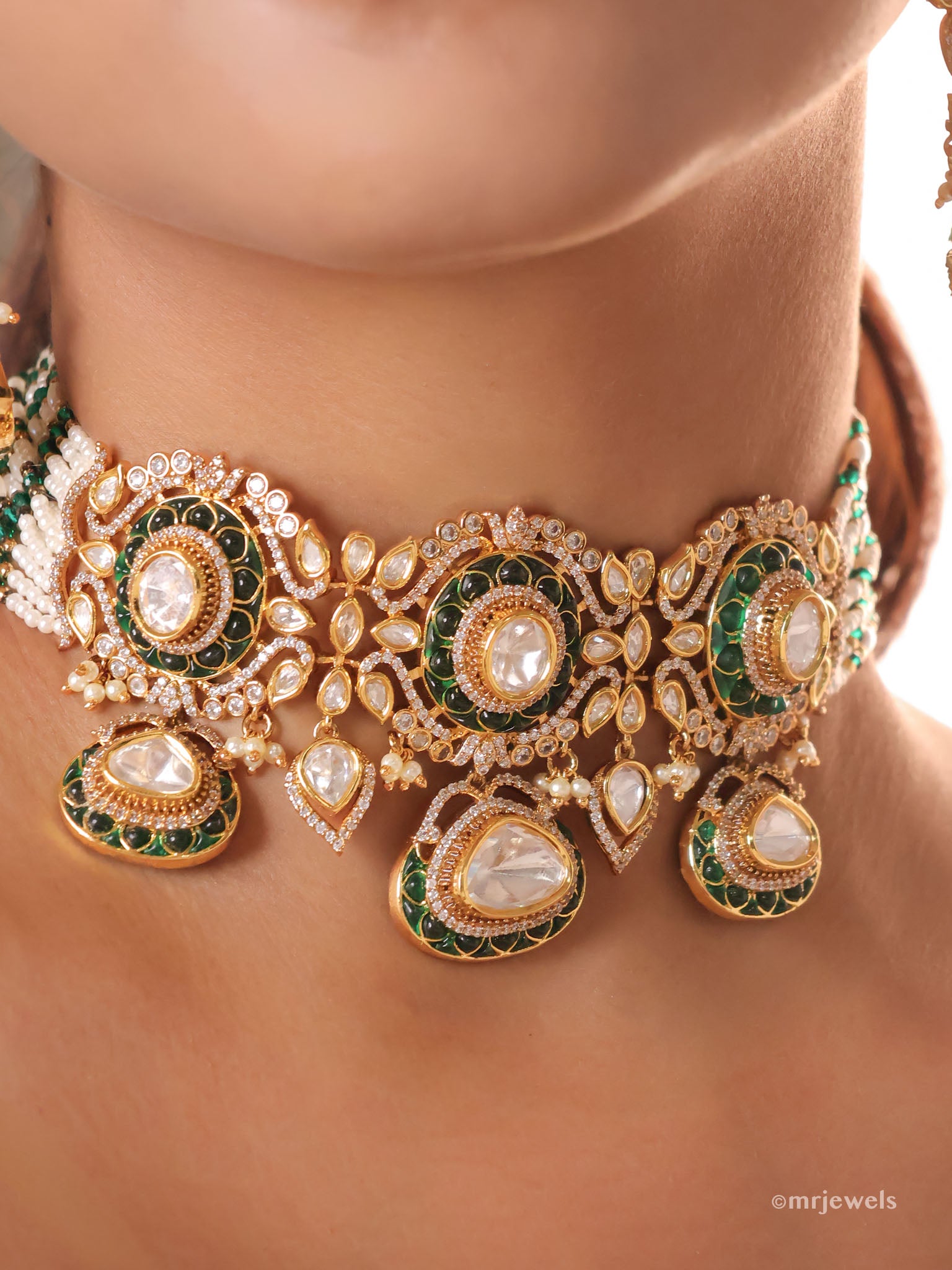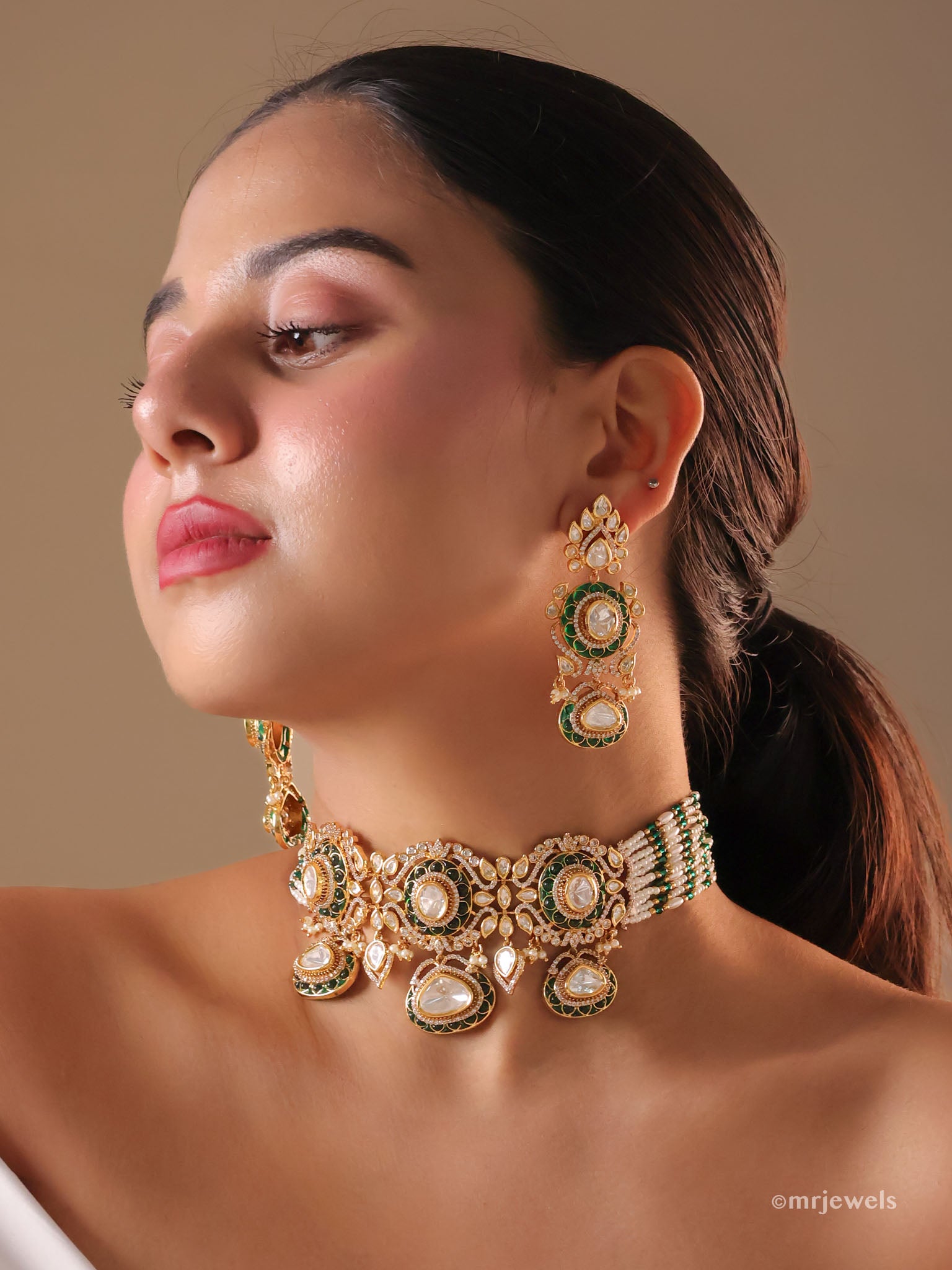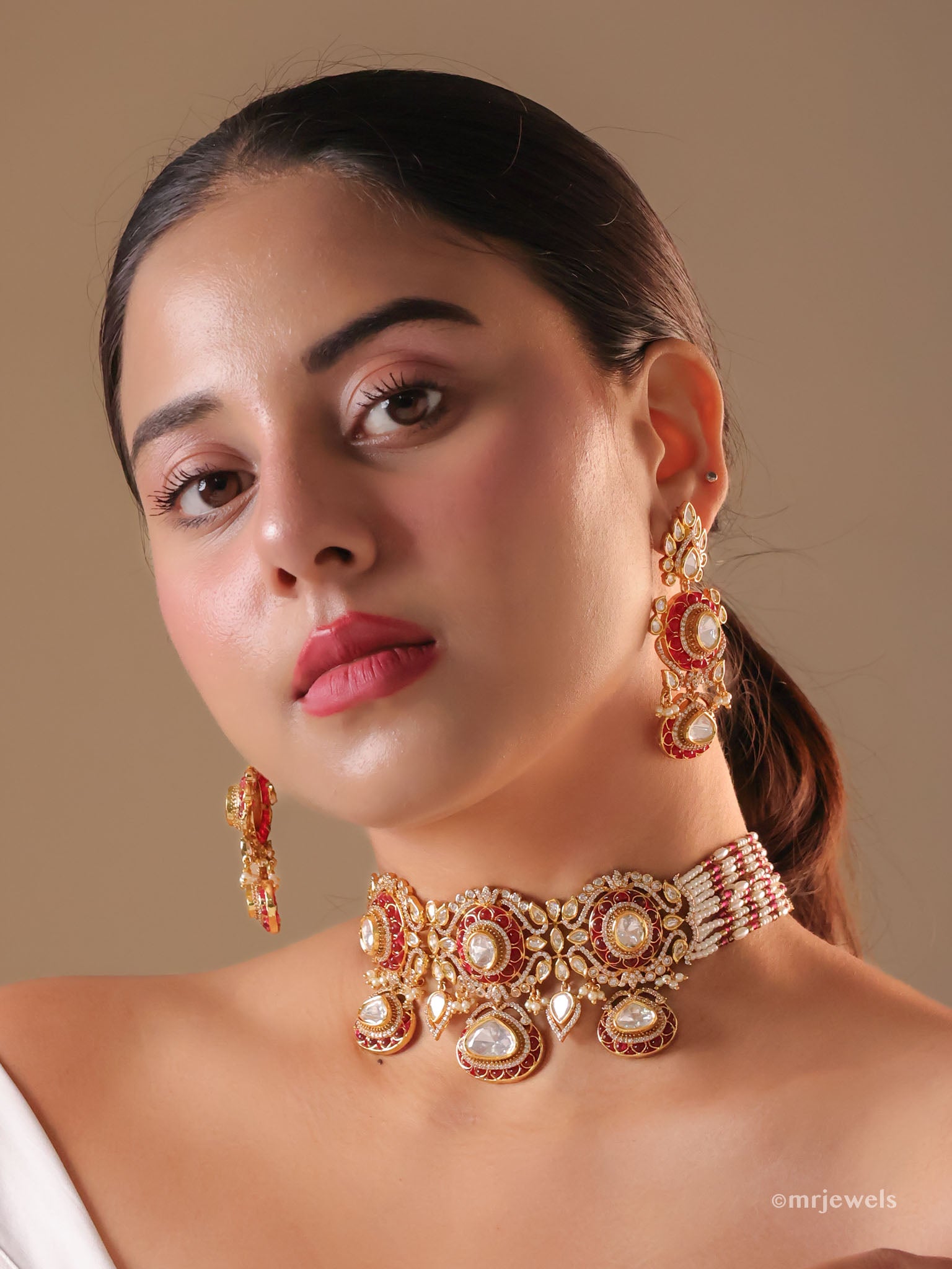 Emerald and Ruby Meenakari Polki Choker Set (with Earrings)