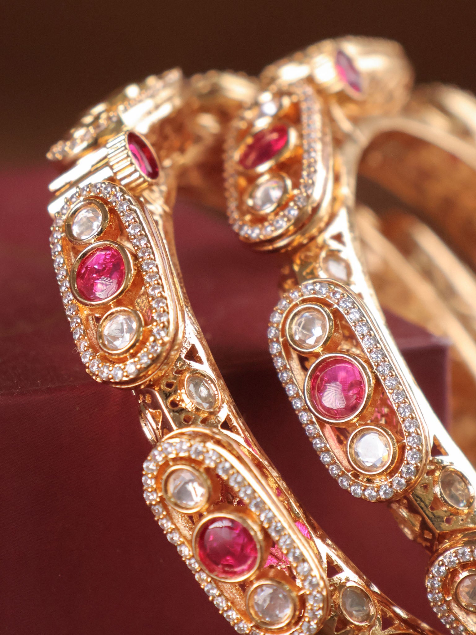 Each bangle features oval ruby cabochons framed with hand-set Polki stones, surrounded by micro-pavé brilliance that adds a rich, high-jewellery glow. The sculpted gold base, detailed with intricate carving and a glossy antique finish, reflects the finesse of bespoke atelier craftsmanship.