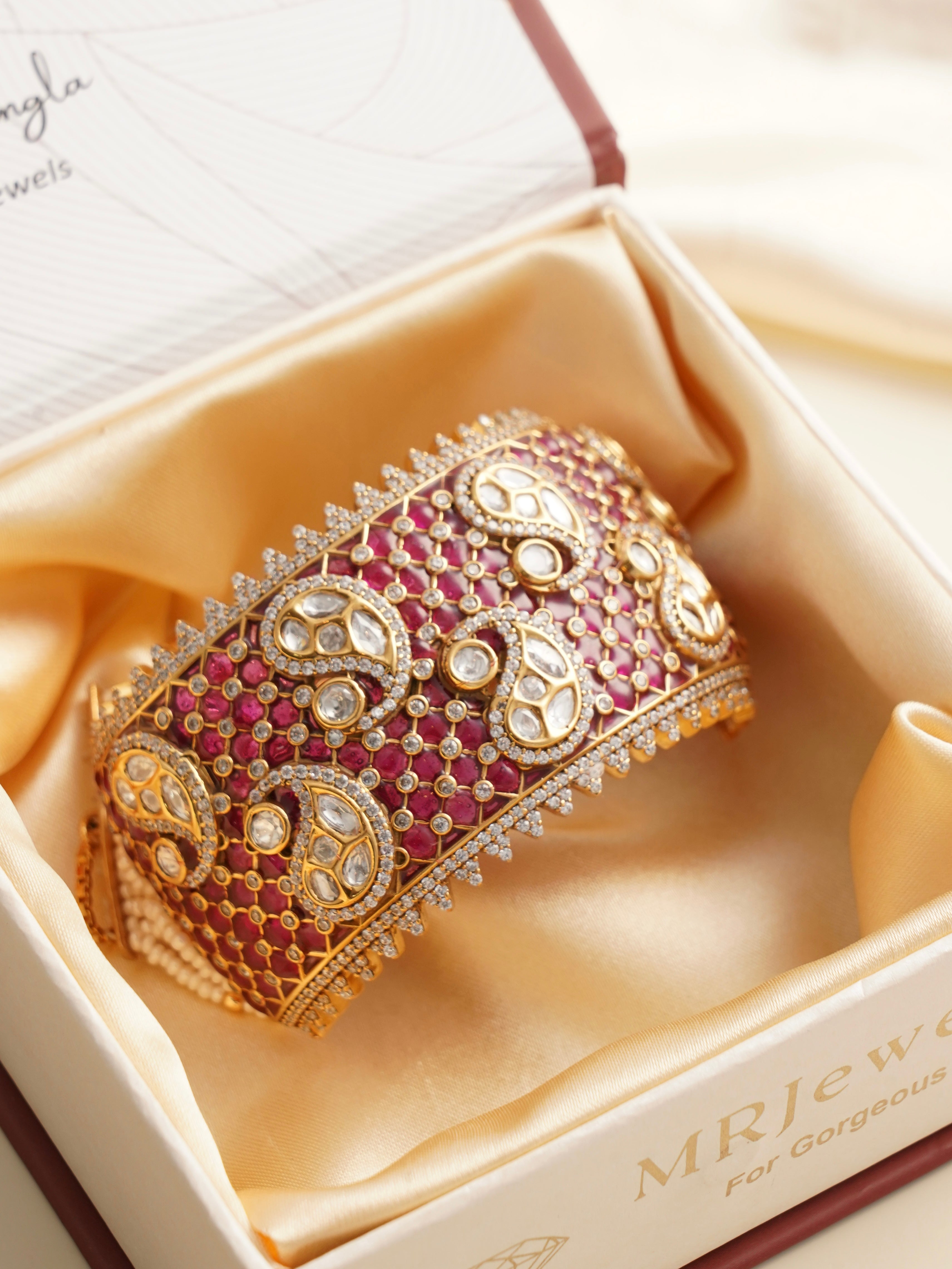 Turn every gaze with our handcrafted Royal Prism Cuff, featuring a bold faceted gemstone centerpiece and intricate diamond-cut latticework. Available in vibrant emerald green and radiant yellow, this designer bracelet redefines luxury with its openable design and high-shine finish. Ideal for cocktail soirées, bridal glamour, or festive royalty looks.