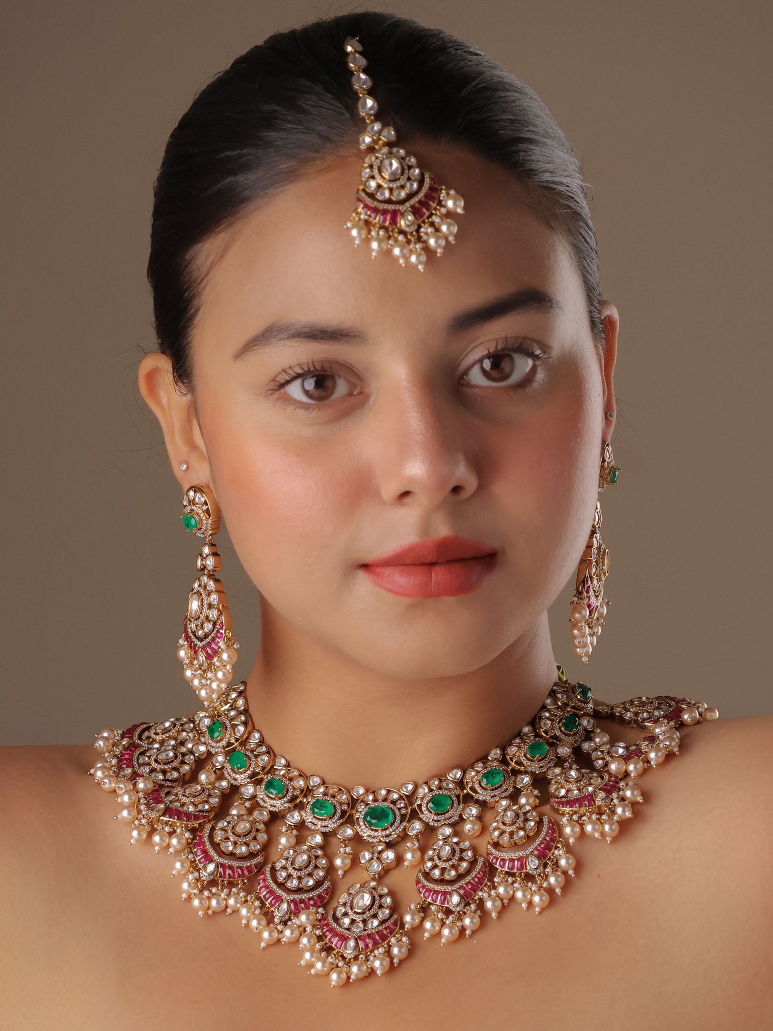 Royal Emerald Polki Bridal Choker Set with Earrings & Maang Tikka