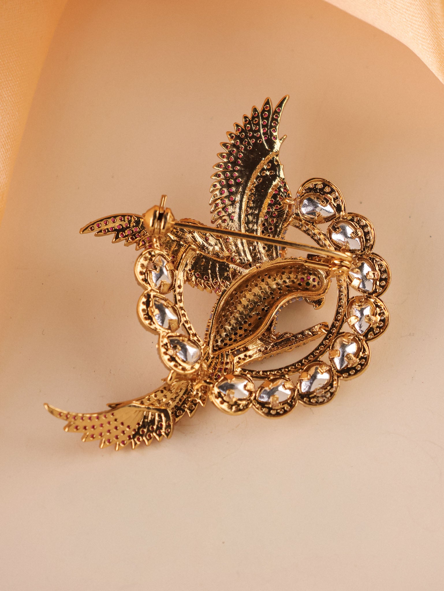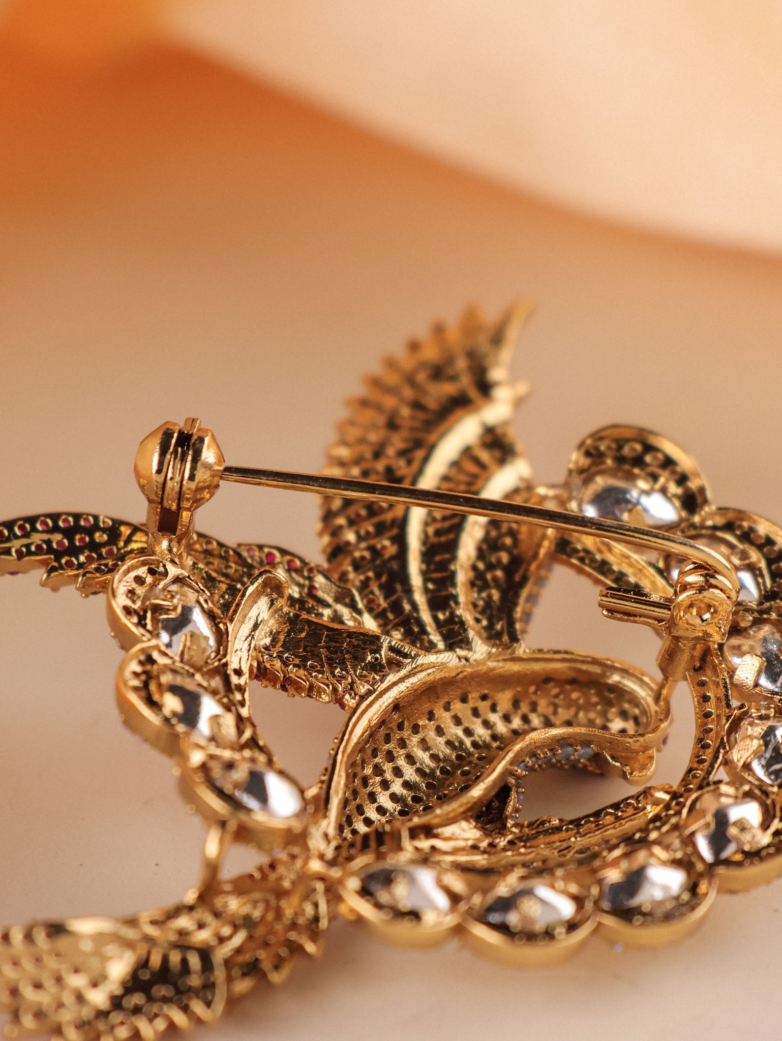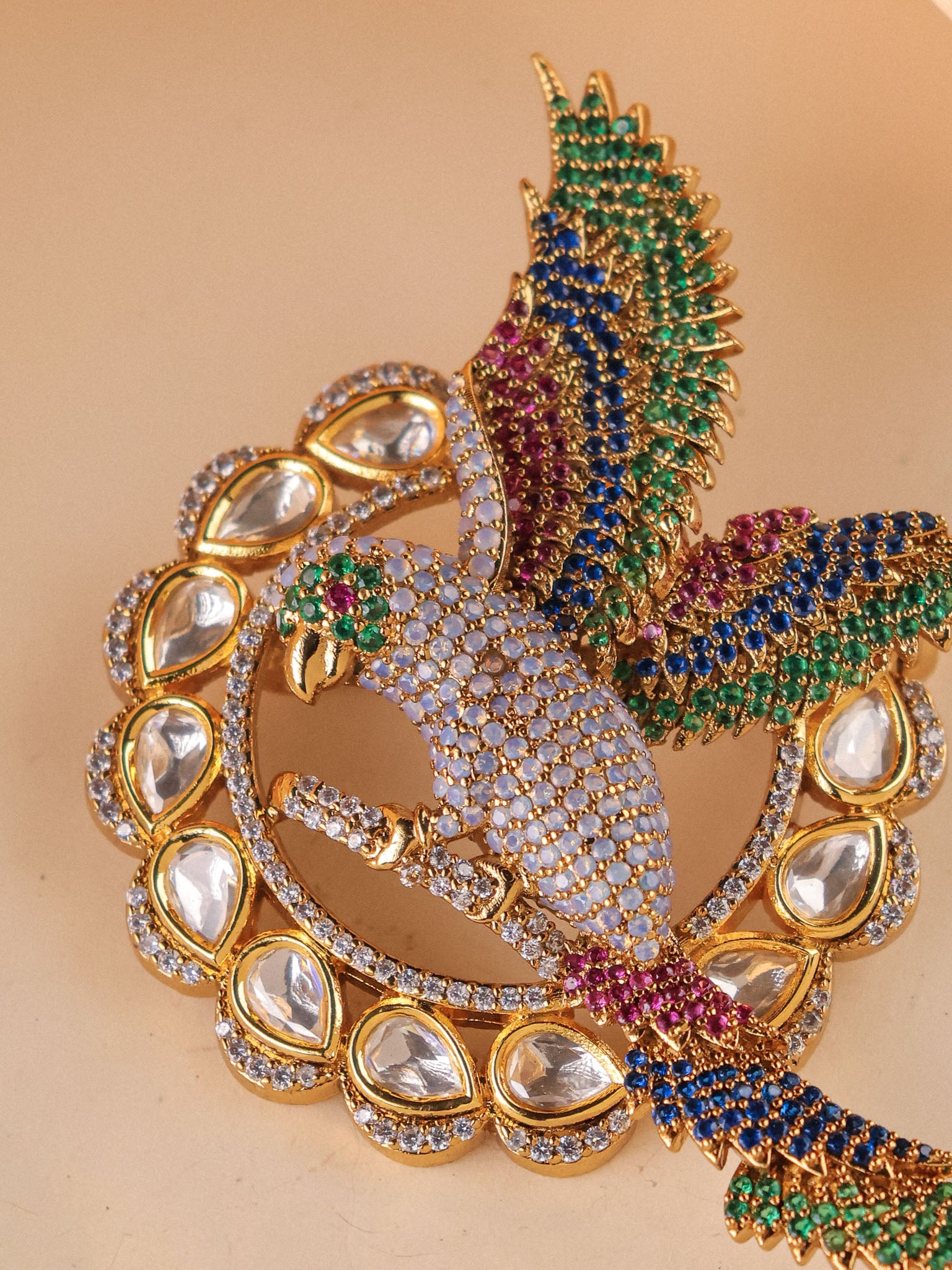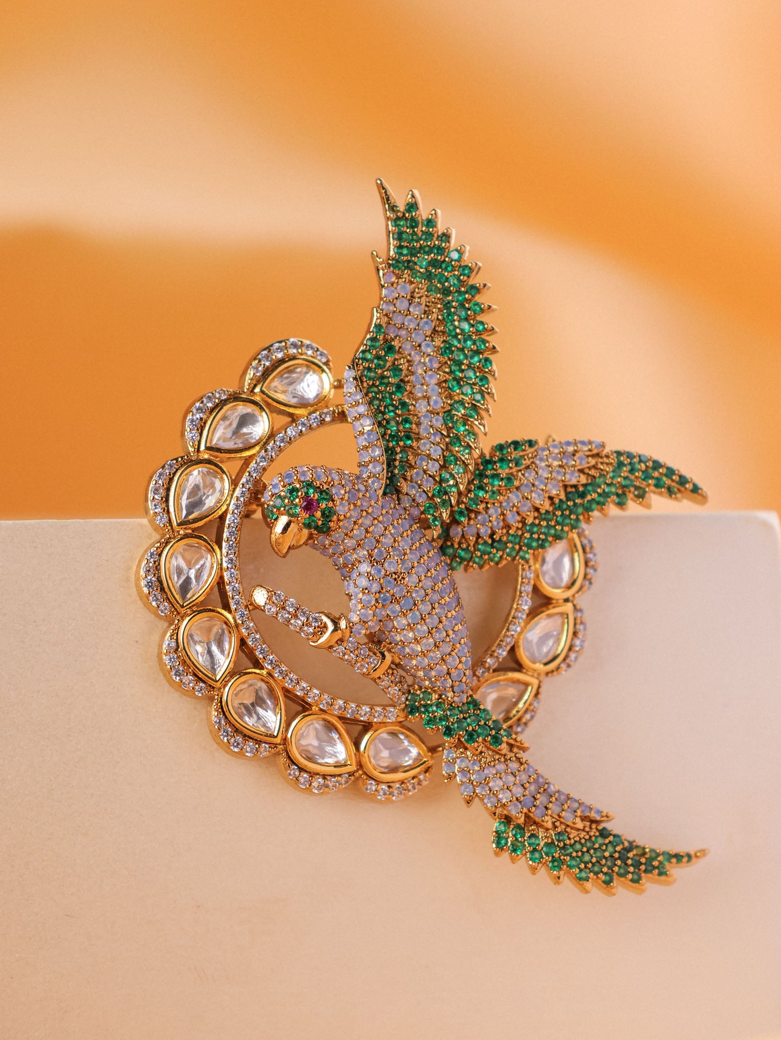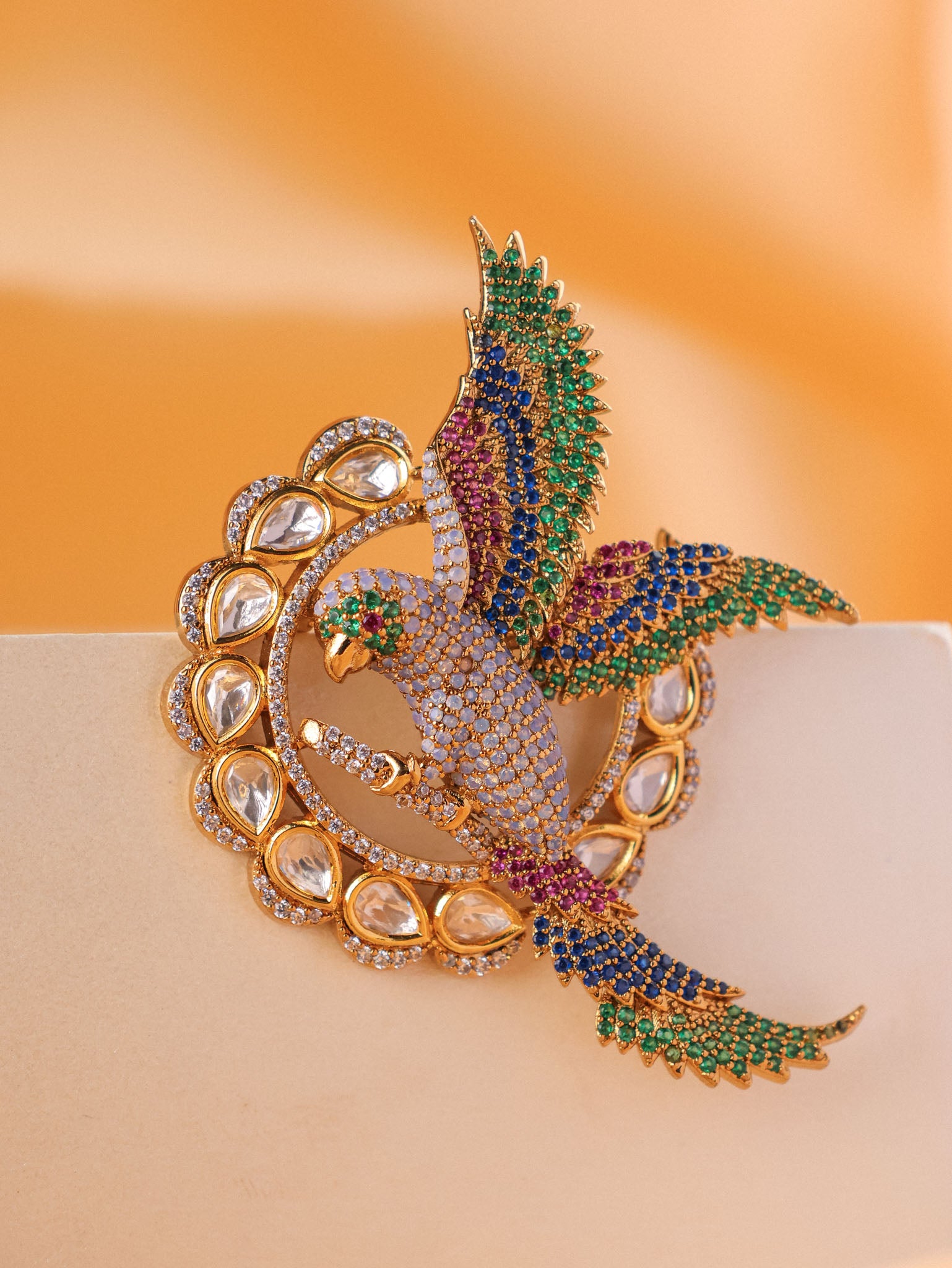 An opulent expression of artistry, the Mayura Luxe Brooch is crafted as a sculptural jewel inspired by the regal peacock. Adorned with hand-set kundan stones, fluid pavé detailing, and refined gold-tone accents, this statement brooch captures movement, grace, and timeless grandeur.