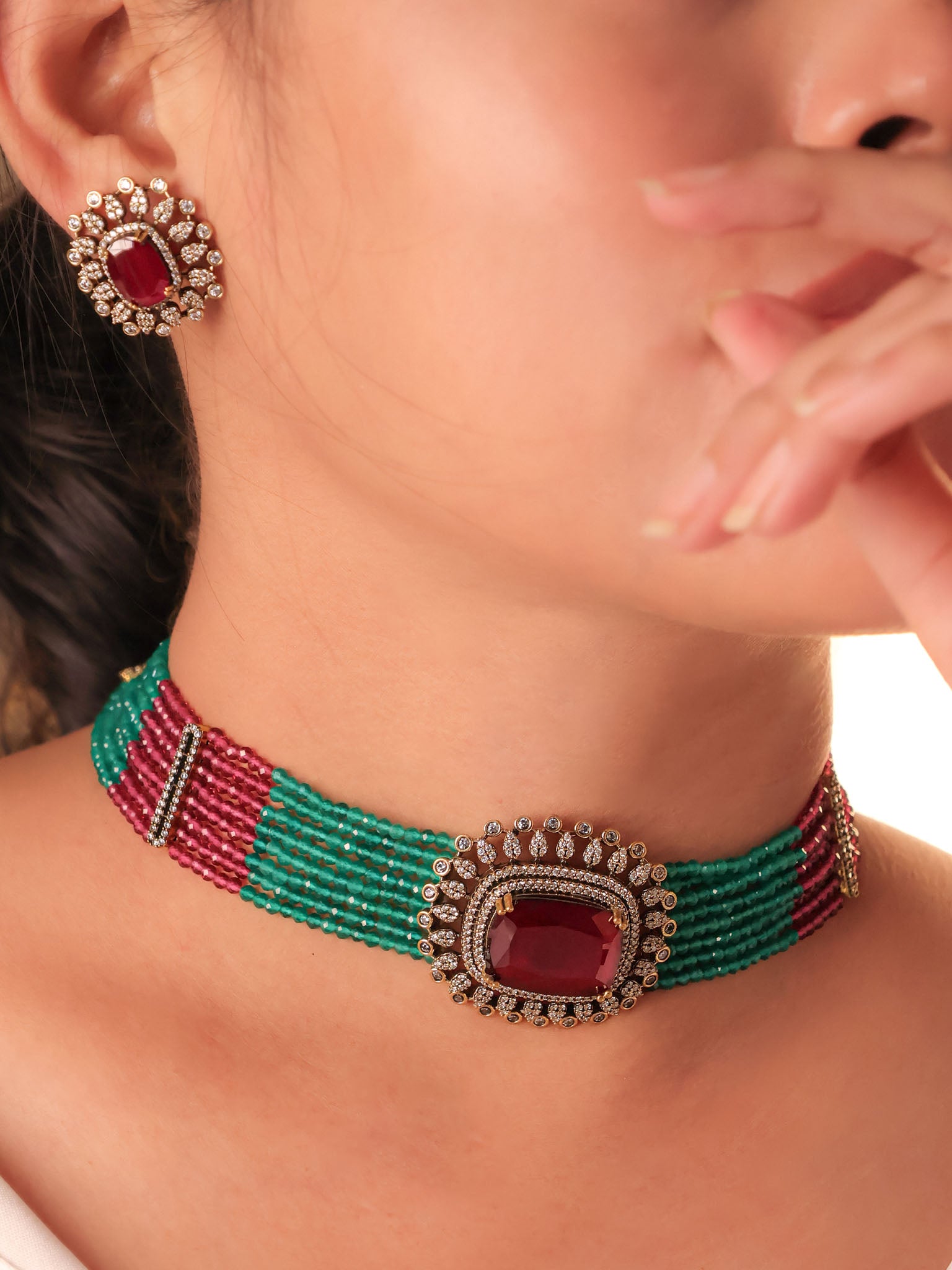 Emerald Ruby Beaded Choker Set