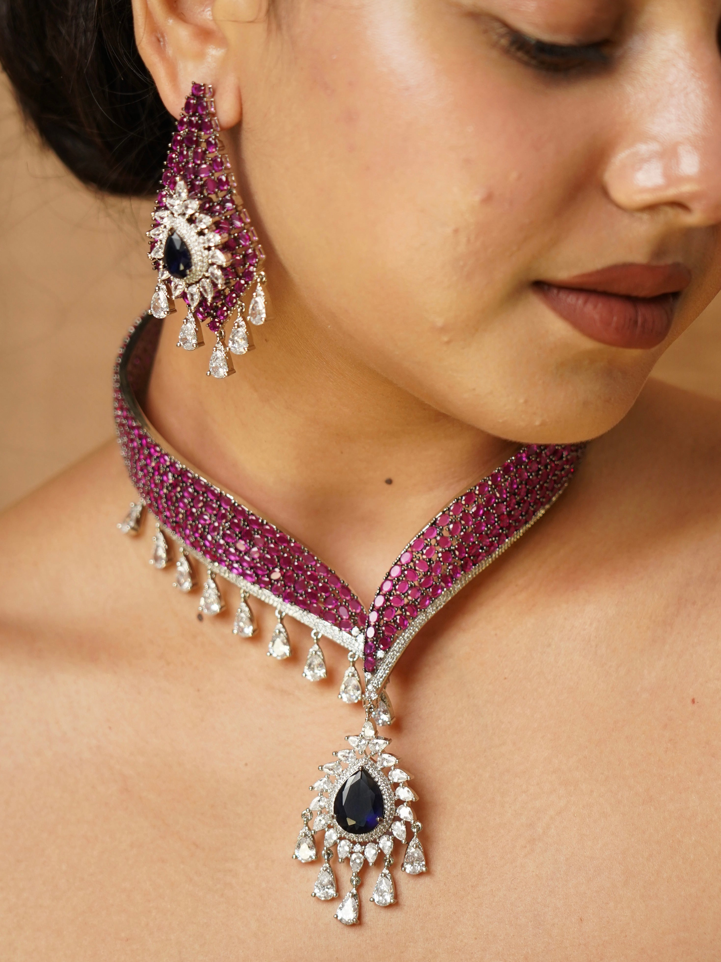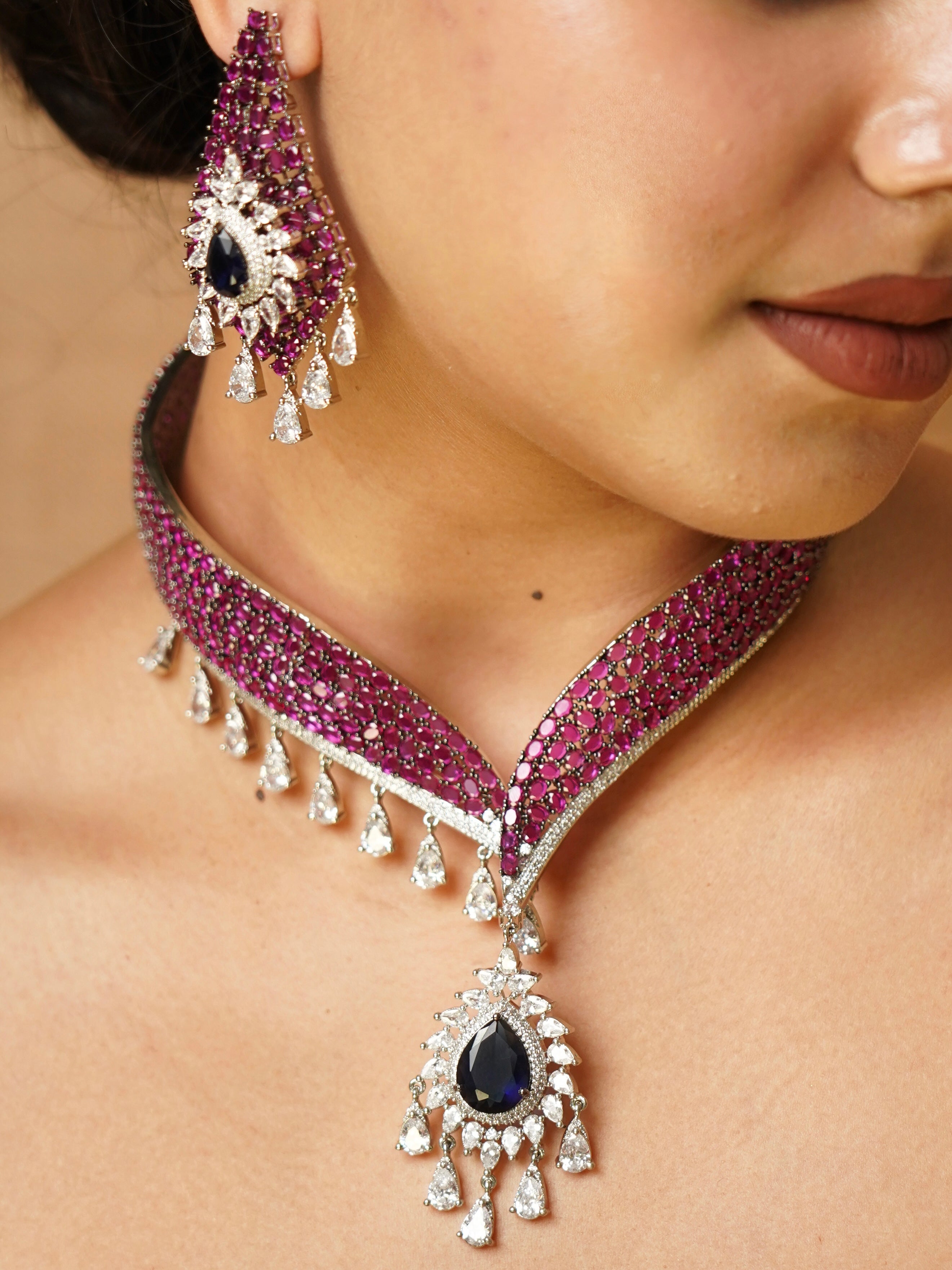 Introducing the Navara Noir Set, where classic grandeur meets modern edge. This meticulously crafted designer choker is woven with hand-set ruby stones in a rich crimson lattice, finished with delicate tear-drop cubic zirconia charms that sway with elegance. The pièce de résistance is a bold noir sapphire centre pendant, framed in a burst of brilliant-cut stones — an ode to powerful femininity and timeless drama.