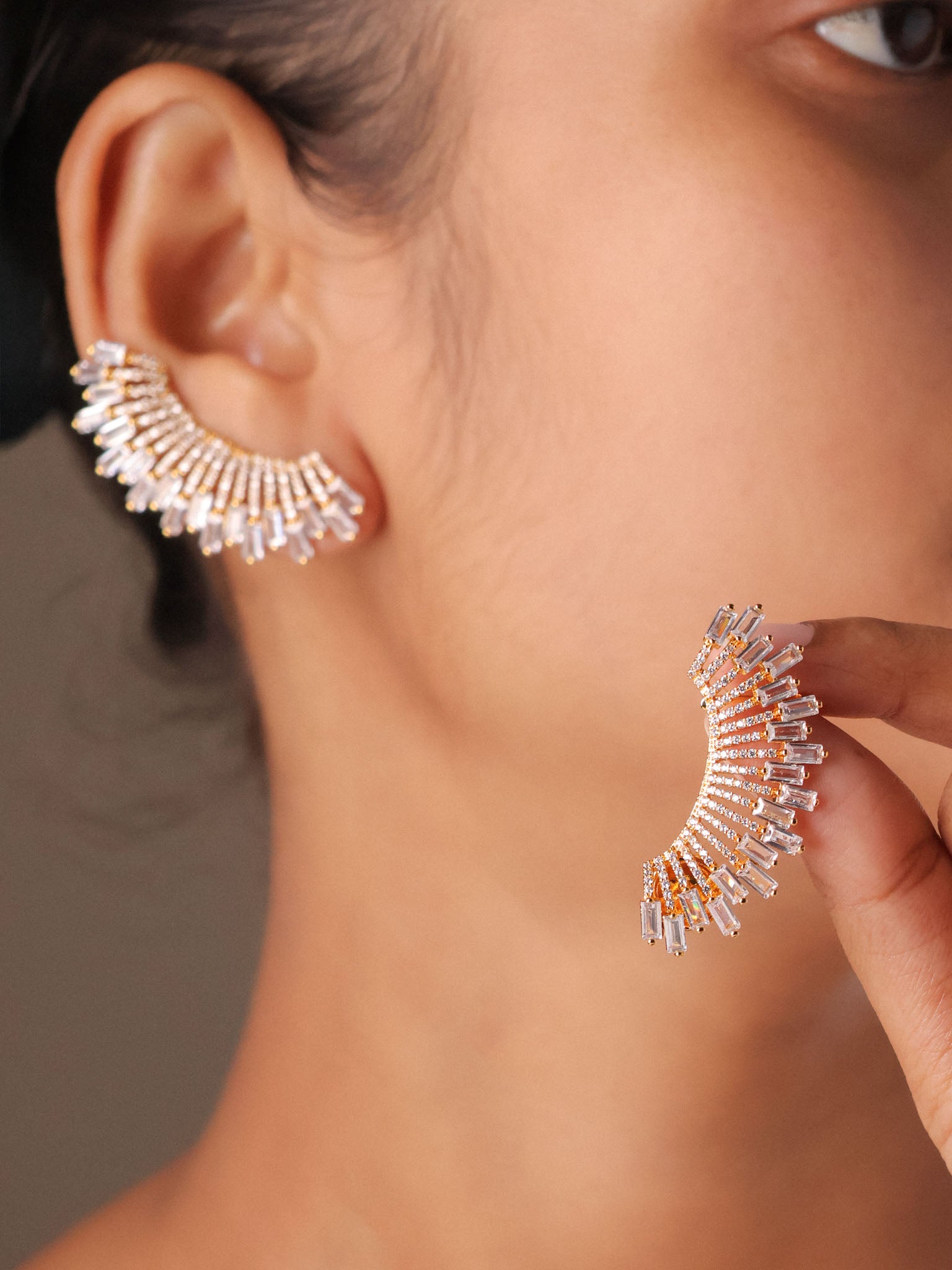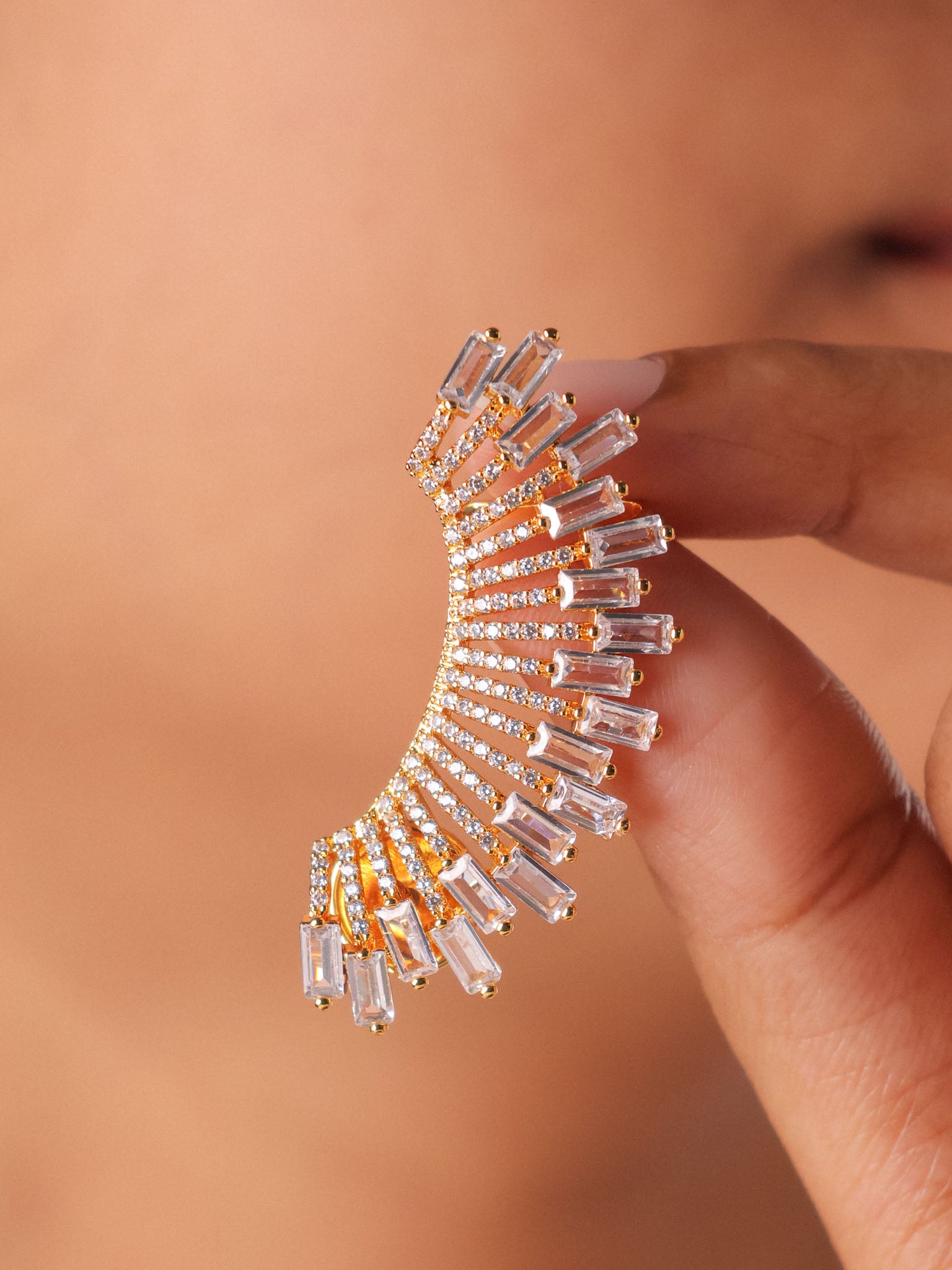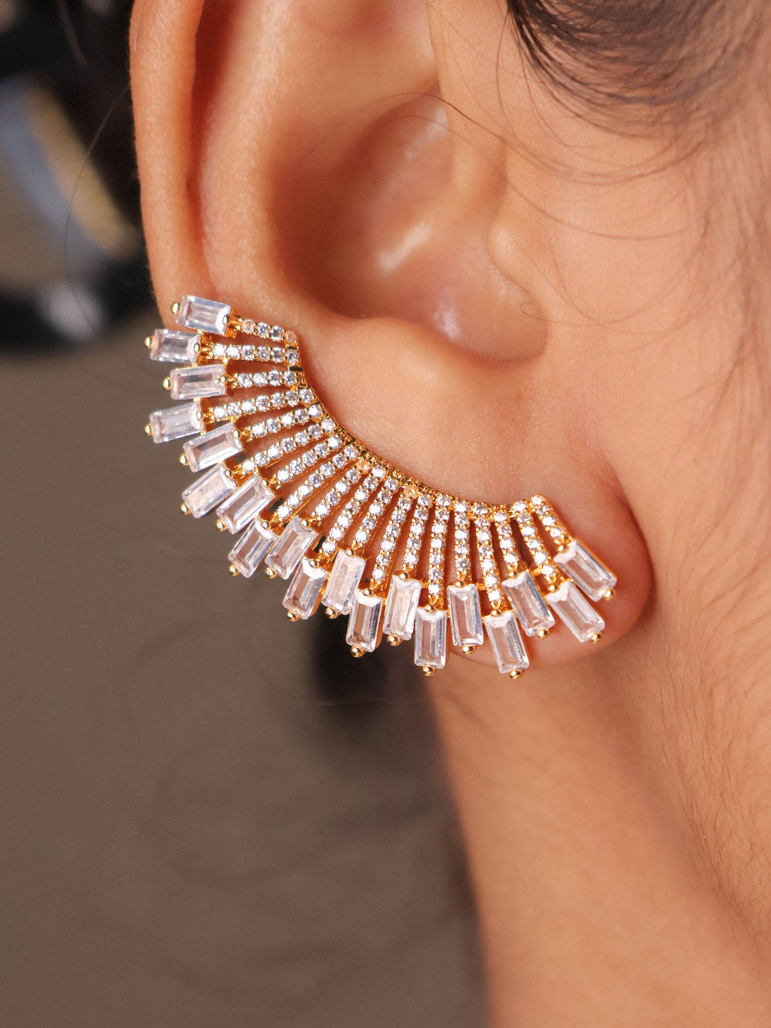 The Radiance Ear Cuff is a striking blend of modern elegance and high-fashion drama. Designed in a radiant crescent silhouette, this statement ear cuff features meticulously set baguette-cut crystals that fan out like rays of light, creating a bold yet refined look.