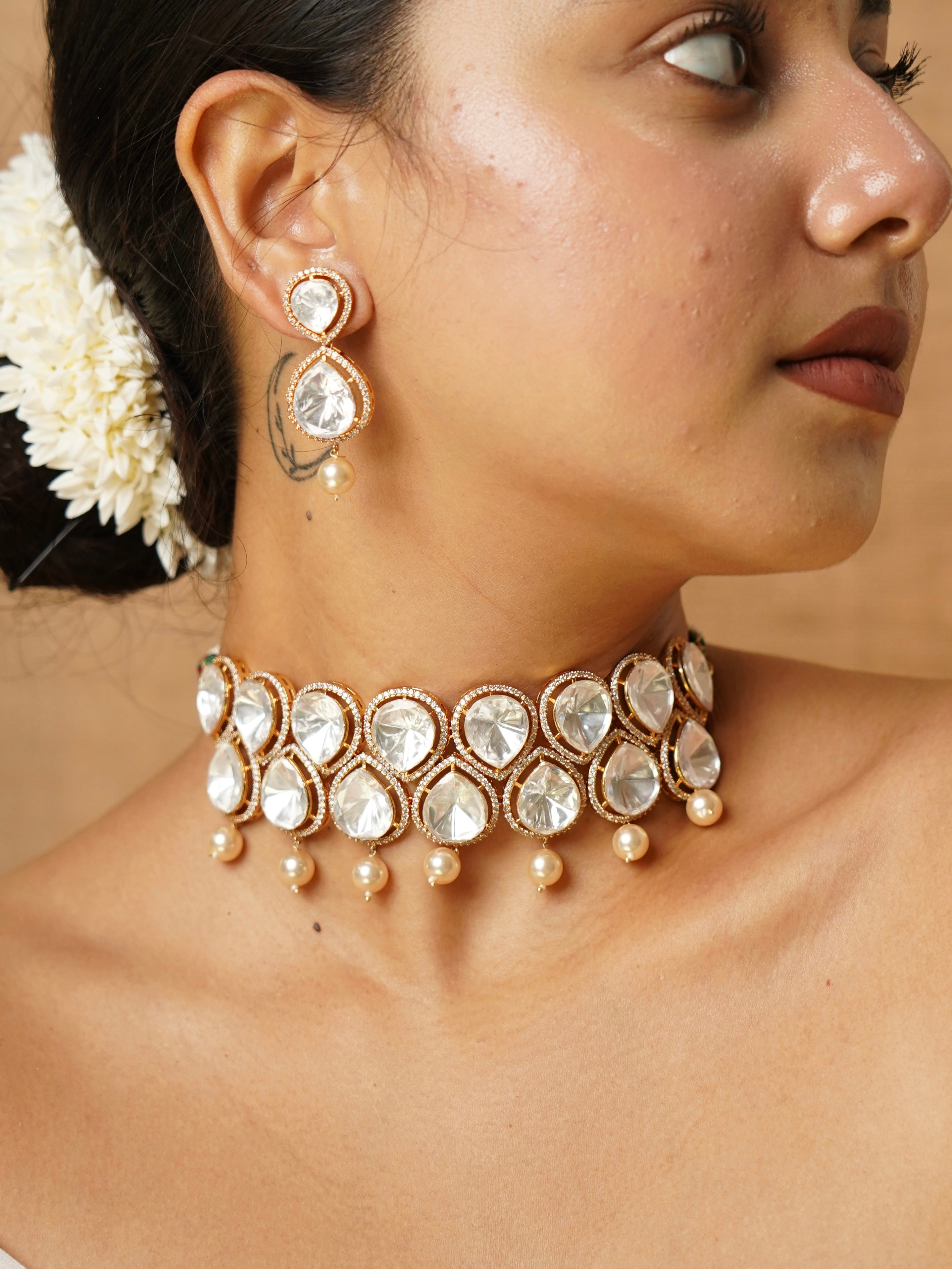 Elevate your celebration style with the Aabroo Polki Pearl Choker Set – a majestic fusion of traditional Kundan craftsmanship and modern finesse. This luxurious choker features high-polish uncut-style Polki stones in teardrop frames, delicately rimmed with zirconia accents and finished with graceful pearl danglers. Paired with matching earrings, the set is crafted on a premium gold-plated base for enduring brilliance.