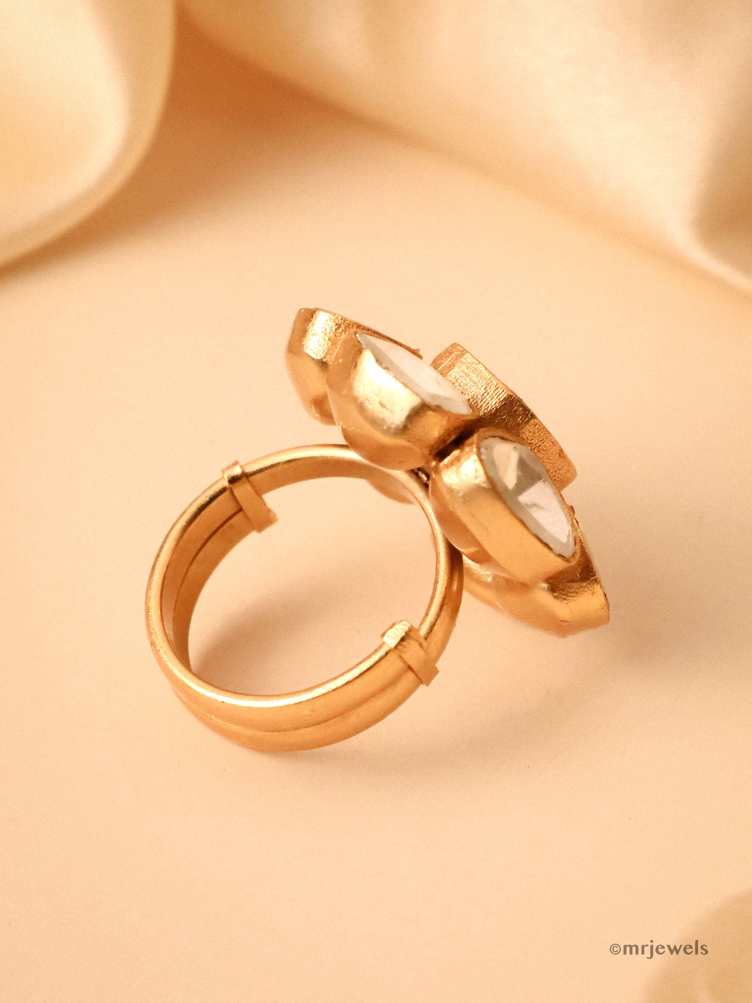 timeless elegance in this floral-inspired adjustable Polki ring, featuring seven hand-set white kundan stones in a radiant flower design. Crafted with a gold-plated finish, this statement piece is both lightweight and versatile, making it the perfect accessory for weddings, festive occasions, or everyday glamour.