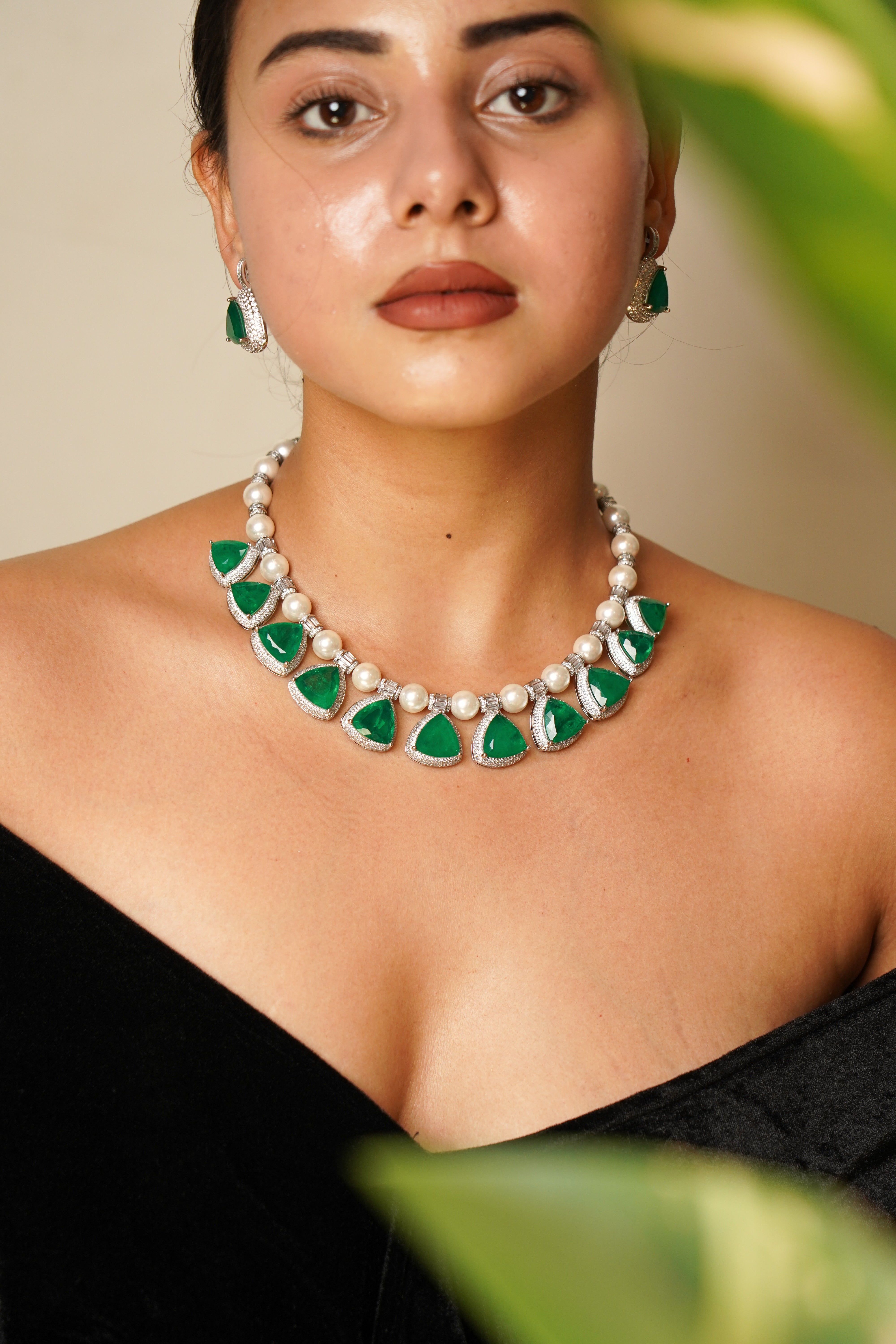 A luxurious necklace featuring alternating white pearls and triangular green gemstones, surrounded by diamond accents. Matching earrings with diamond halos complete the set. Anti- tarnish plated and premium quality to elevate all your glam looks.