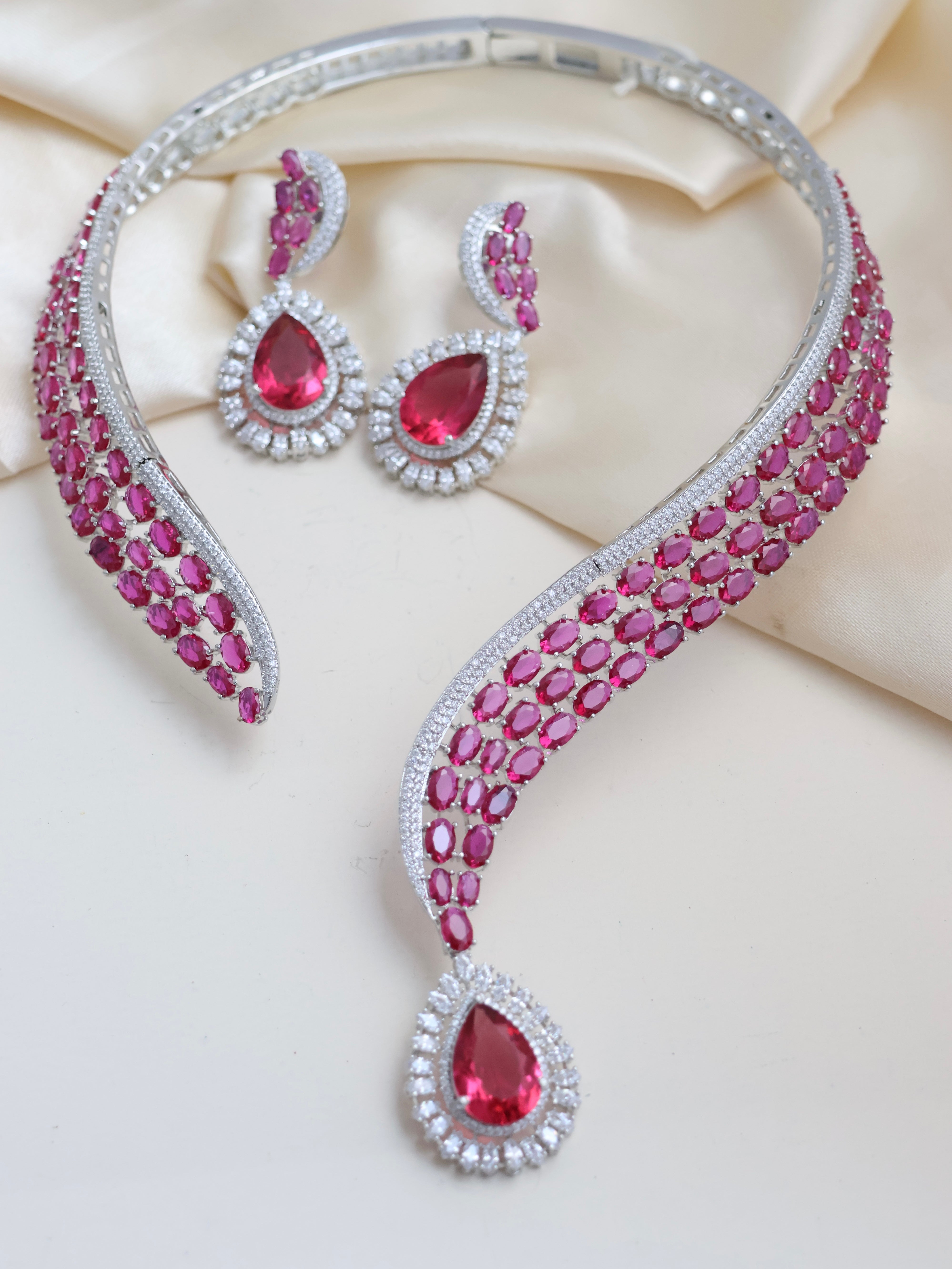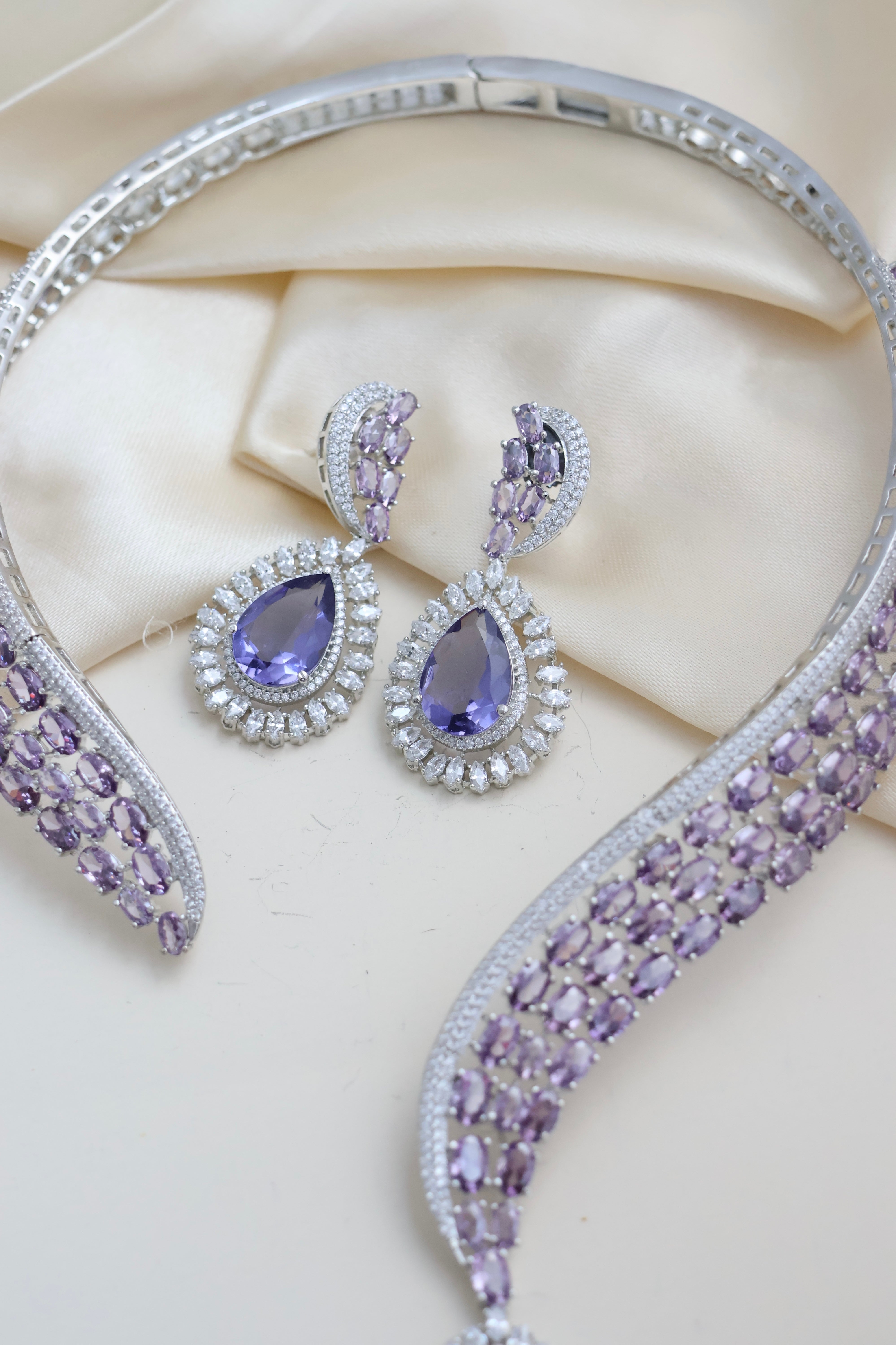 Indulge in the epitome of elegance with this Exquisite Designer Luxury Jewelry Set, a masterpiece of fine craftsmanship and opulence. Featuring a mesmerizing blend of lustrous gemstones and shimmering diamonds, this set is designed to captivate. The asymmetric choker, encrusted with meticulously placed stones, gracefully embraces the neckline, leading to a stunning teardrop pendant that exudes sophistication. The matching earrings, adorned with cascading gems, complete the regal allure.