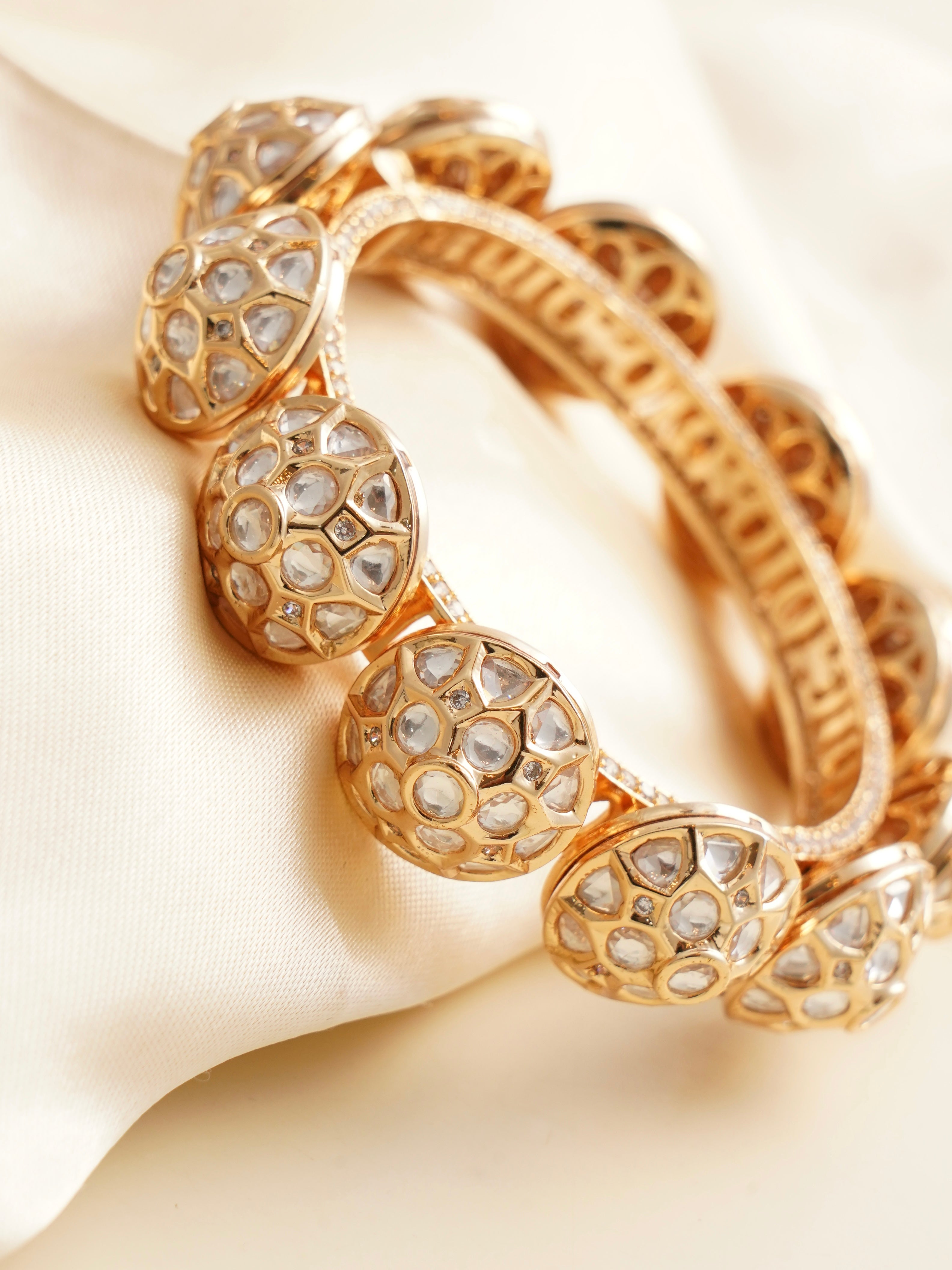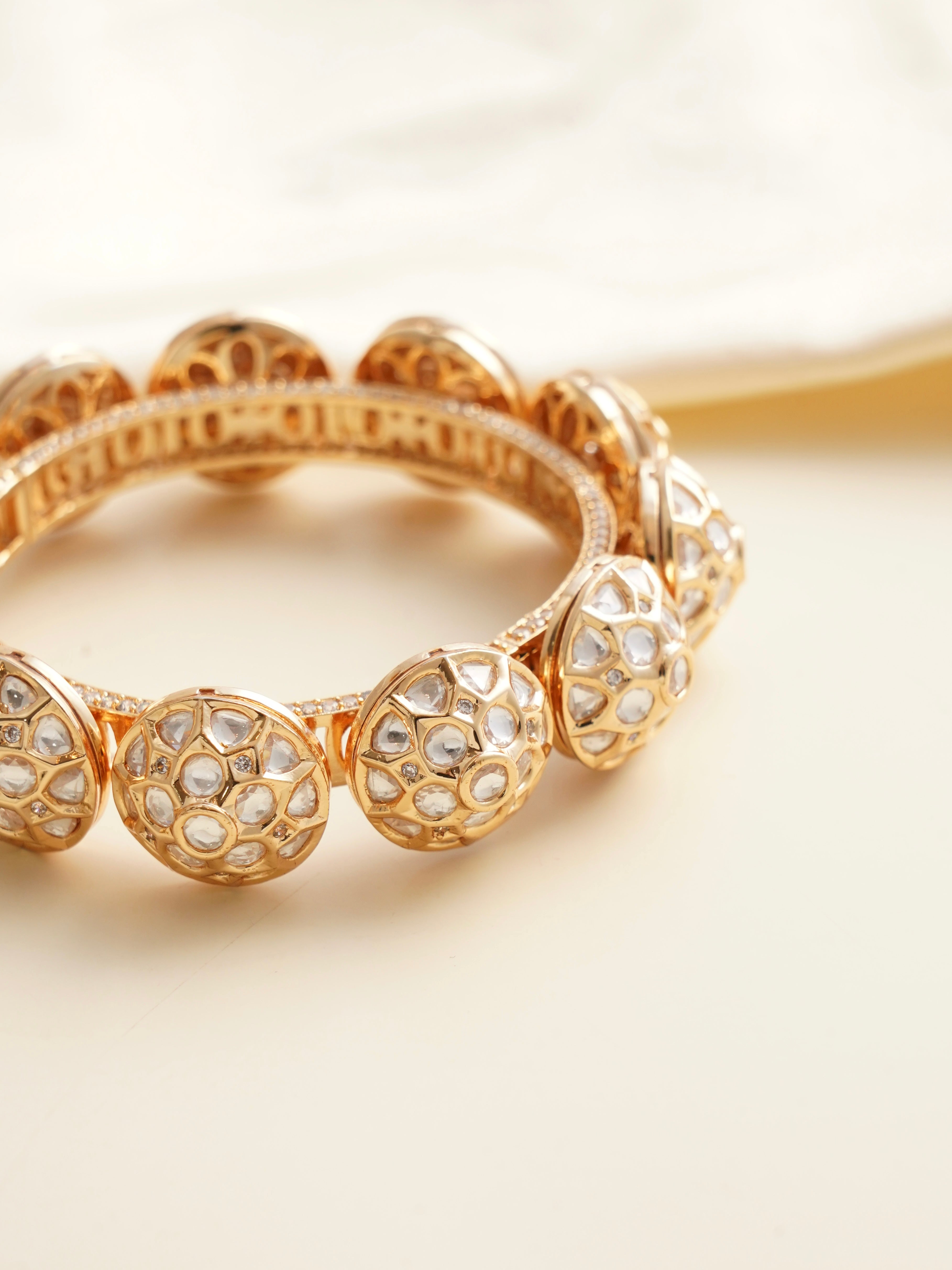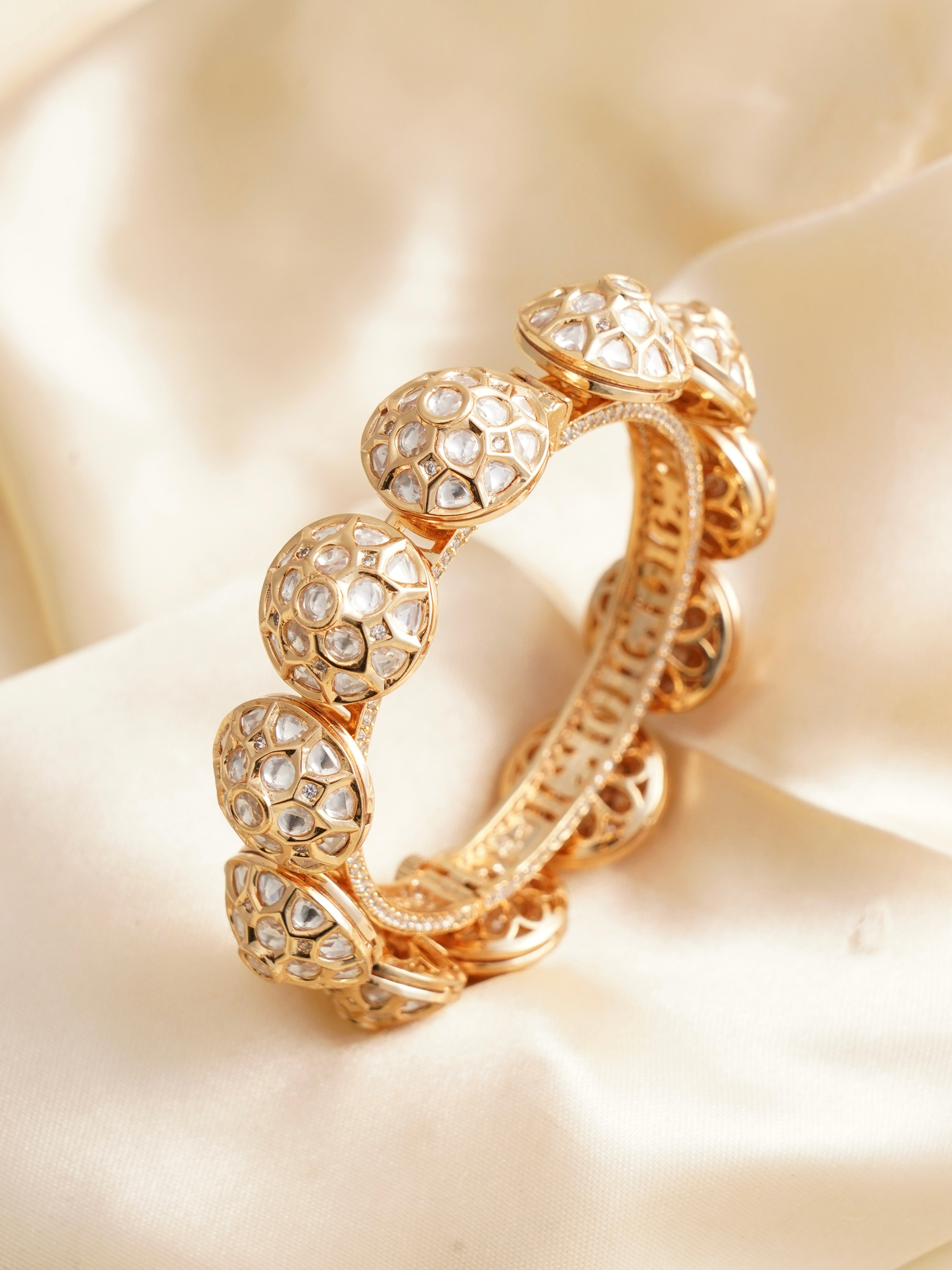 The Mehreen Luxe Polki Bangle is designed for those who love statement jewelry. Featuring exquisite uncut diamonds in raised kundan settings, this bangle is framed with shimmering crystals for added brilliance. Its secure openable mechanism ensures a comfortable fit, making it a must-have for special occasions.