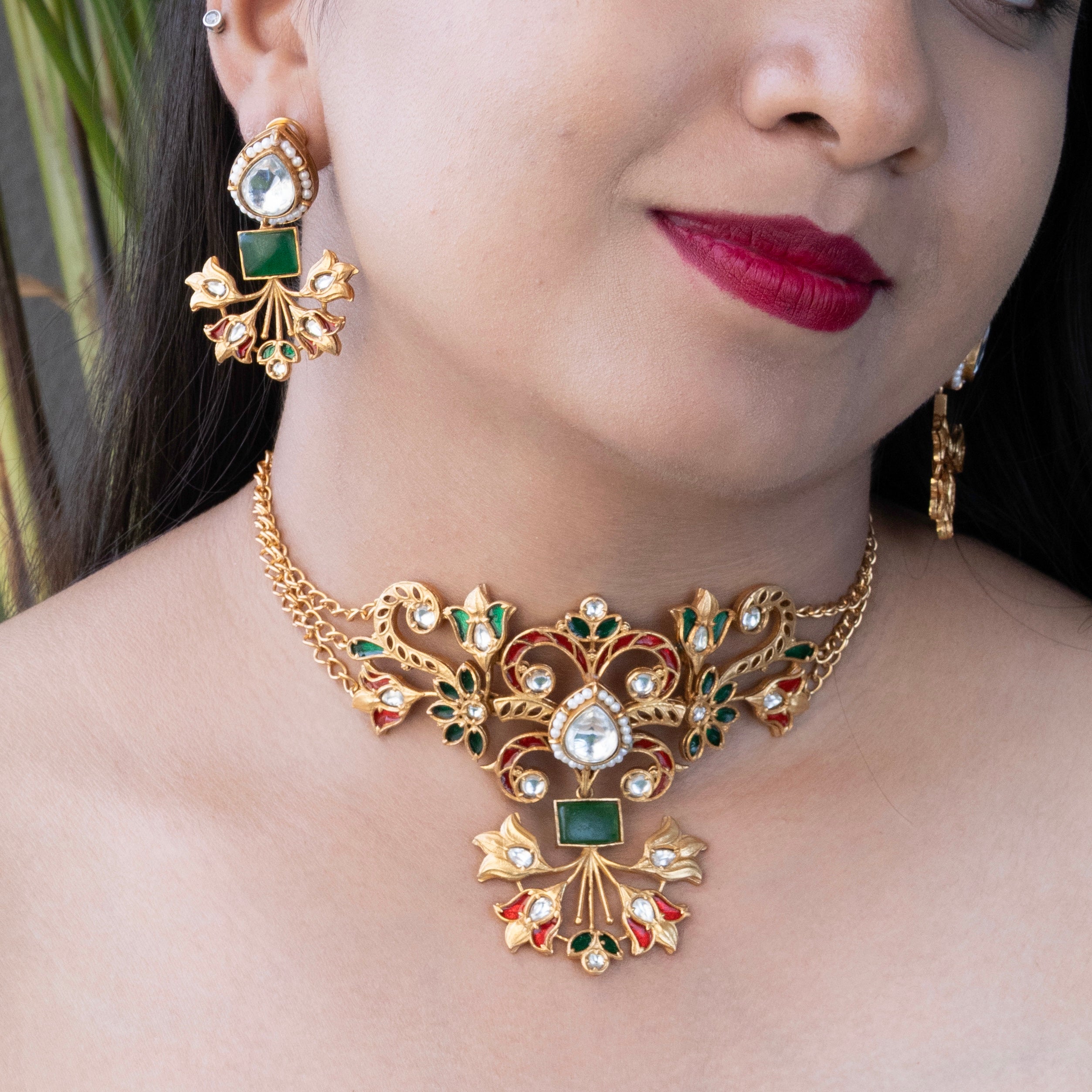 Channel royal elegance with the Noor Amrapali-Inspired Choker Set, meticulously handcrafted with antique gold finish, kundan stones, and bold turquoise enamel. Perfect for festive or bridal wear, it captures timeless heritage with a modern statement.