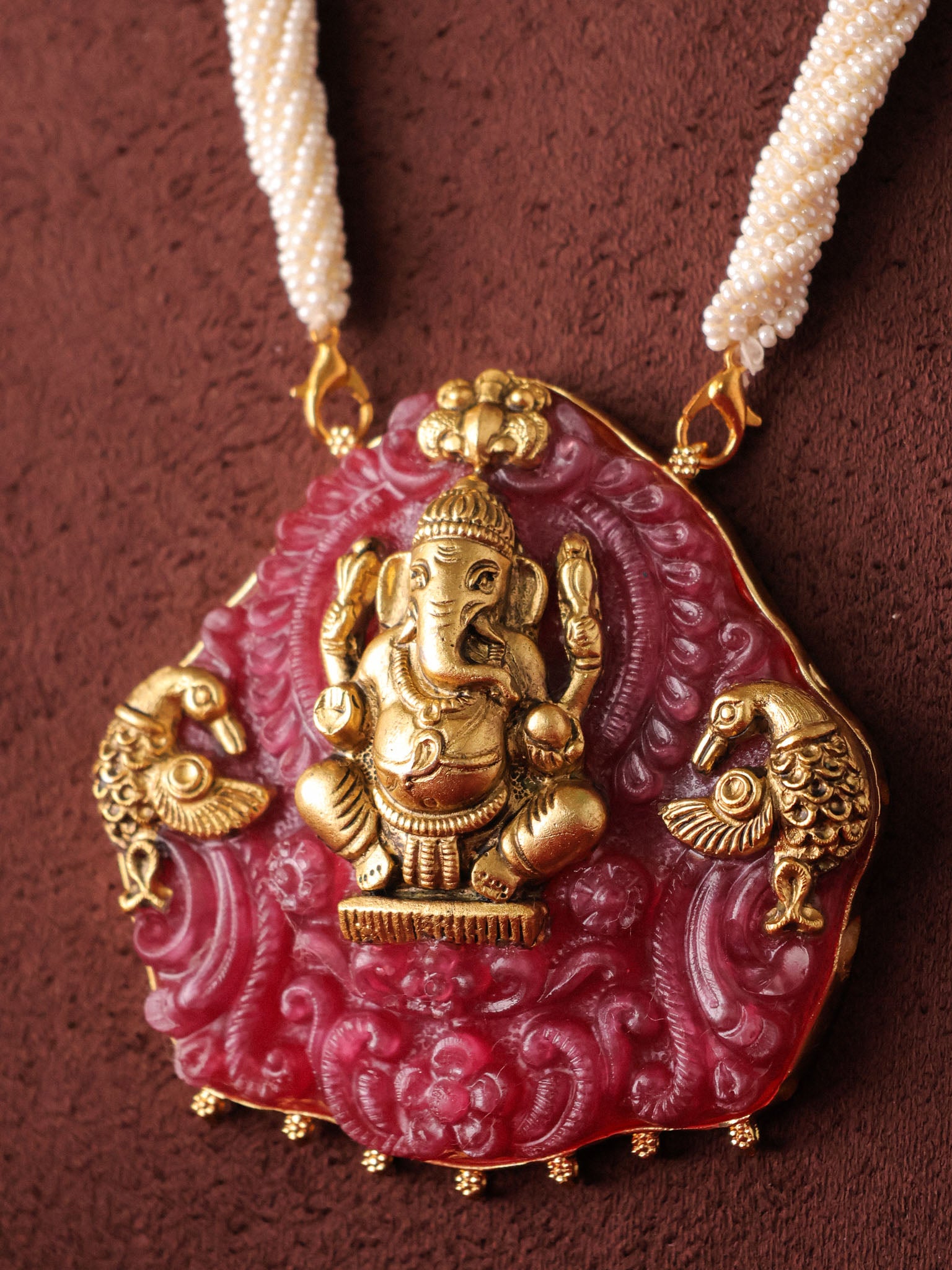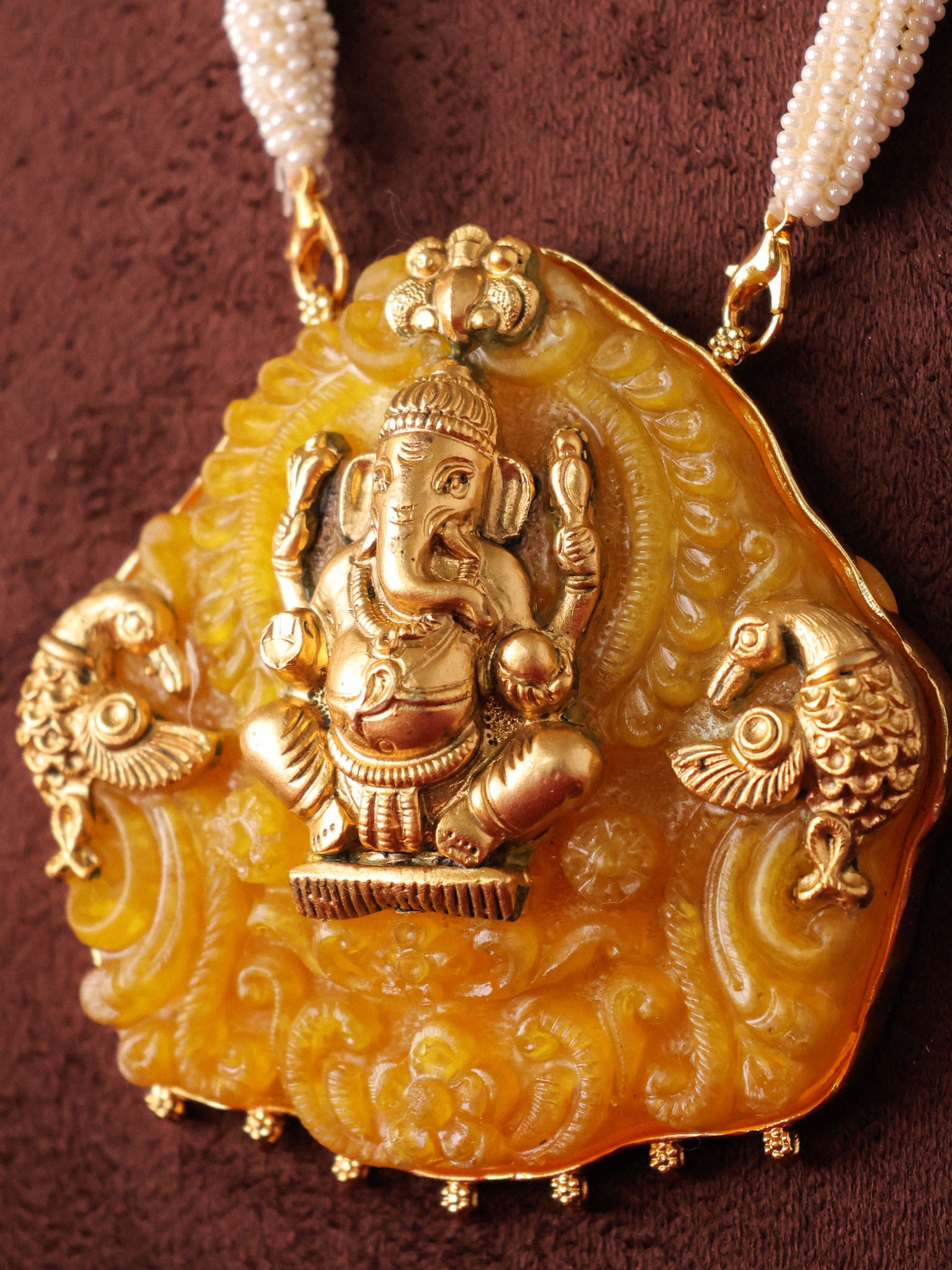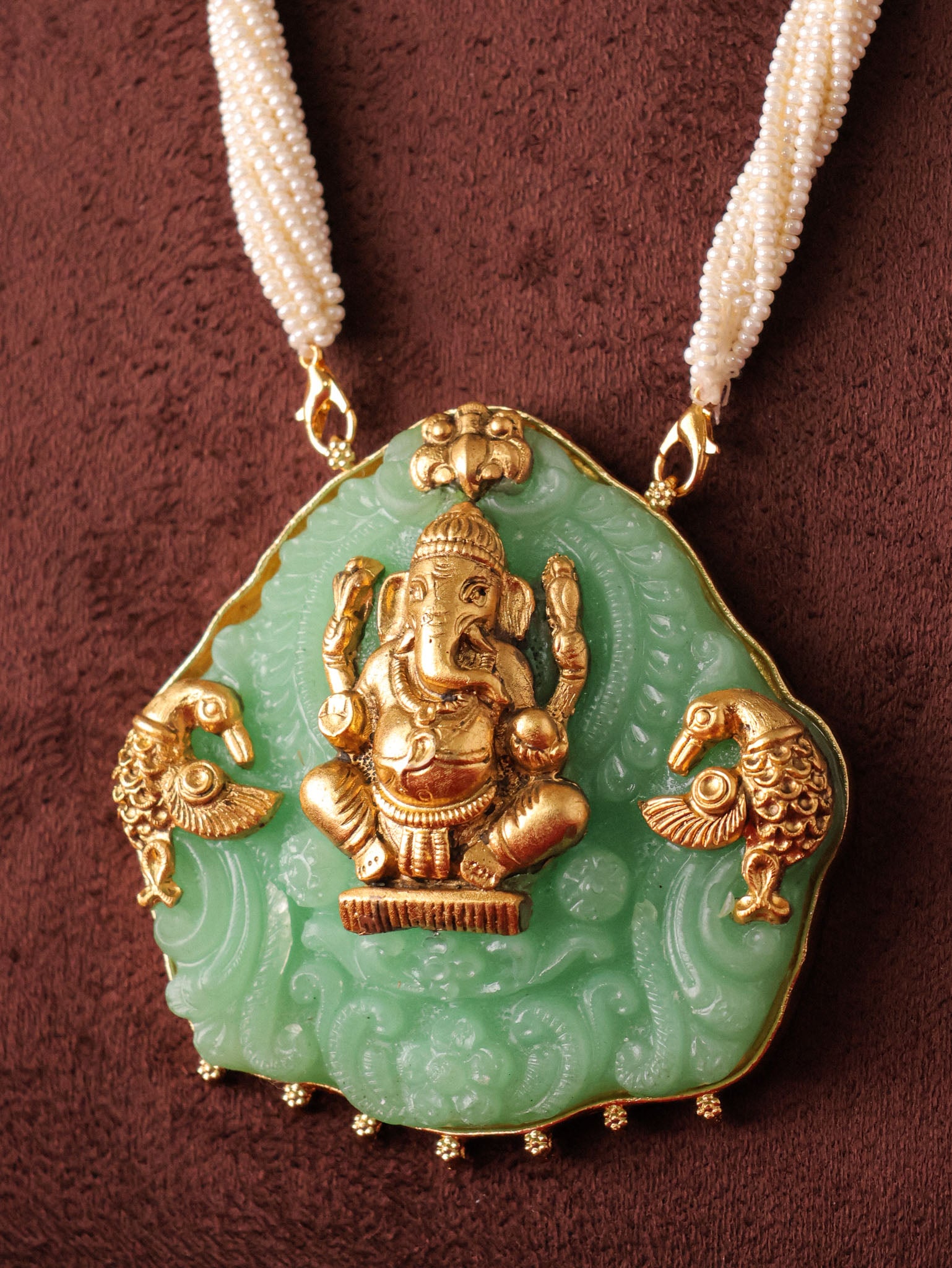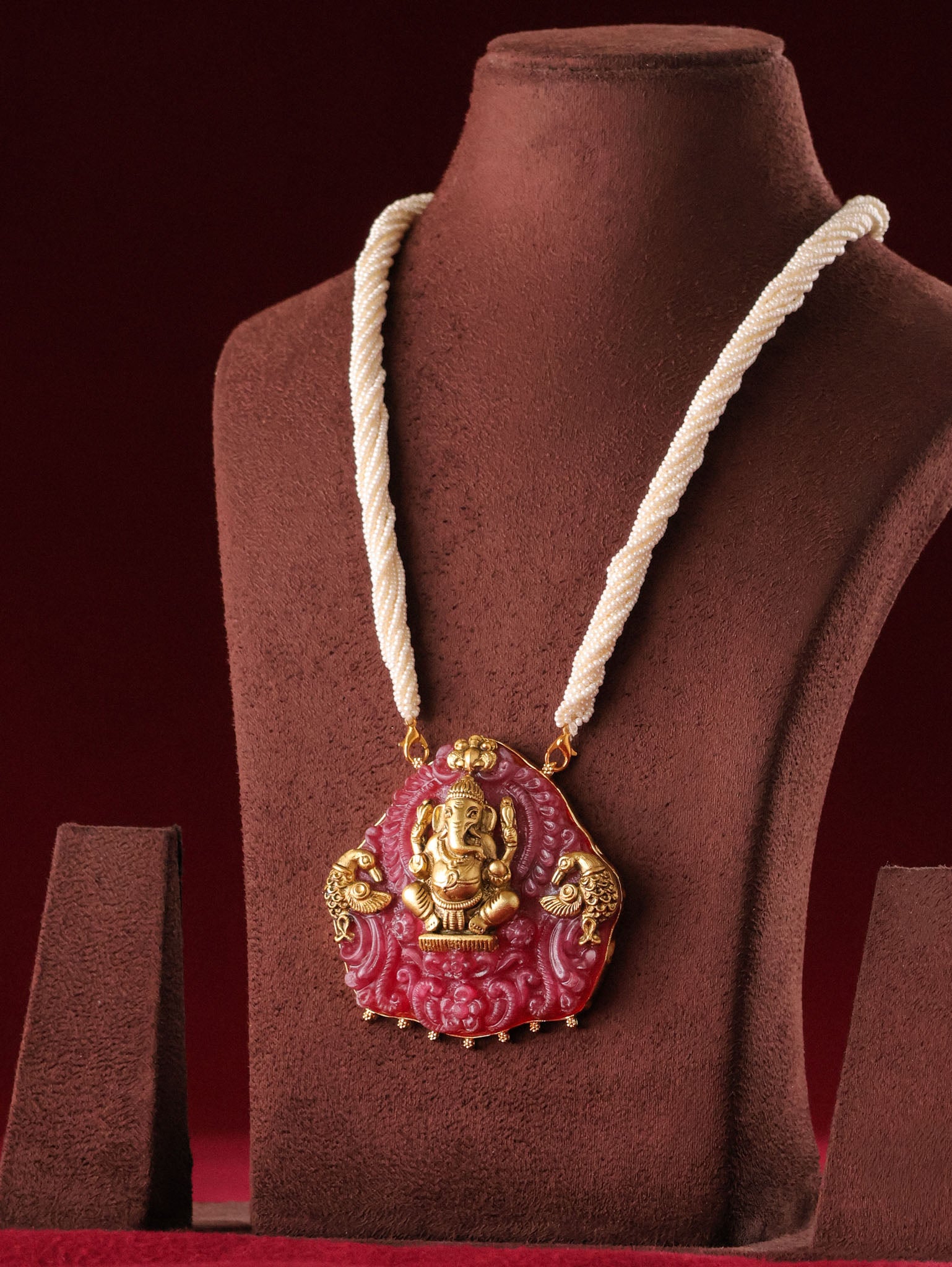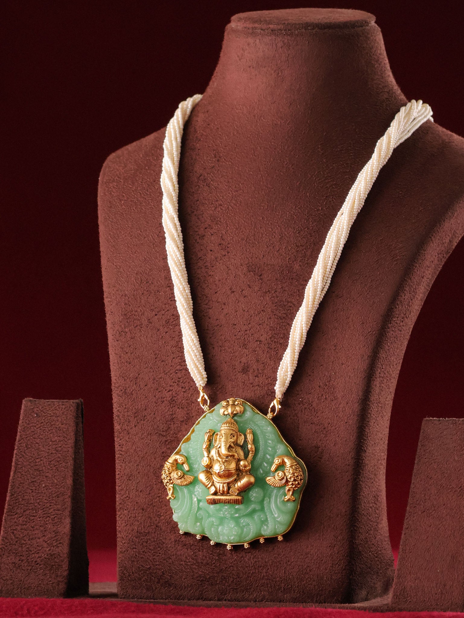 Crafted with devotion and precision, the Carved Stone Ganesh Pendant features Lord Ganesha intricately sculpted in natural stone, symbolising wisdom, protection, and new beginnings. Accented with heritage-inspired gold detailing, this sacred piece blends spiritual depth with timeless craftsmanship.