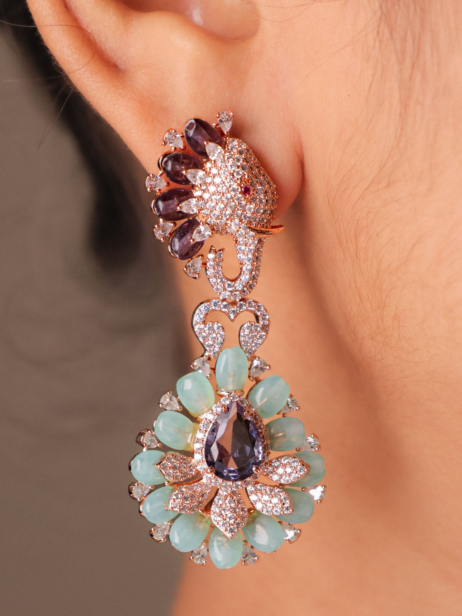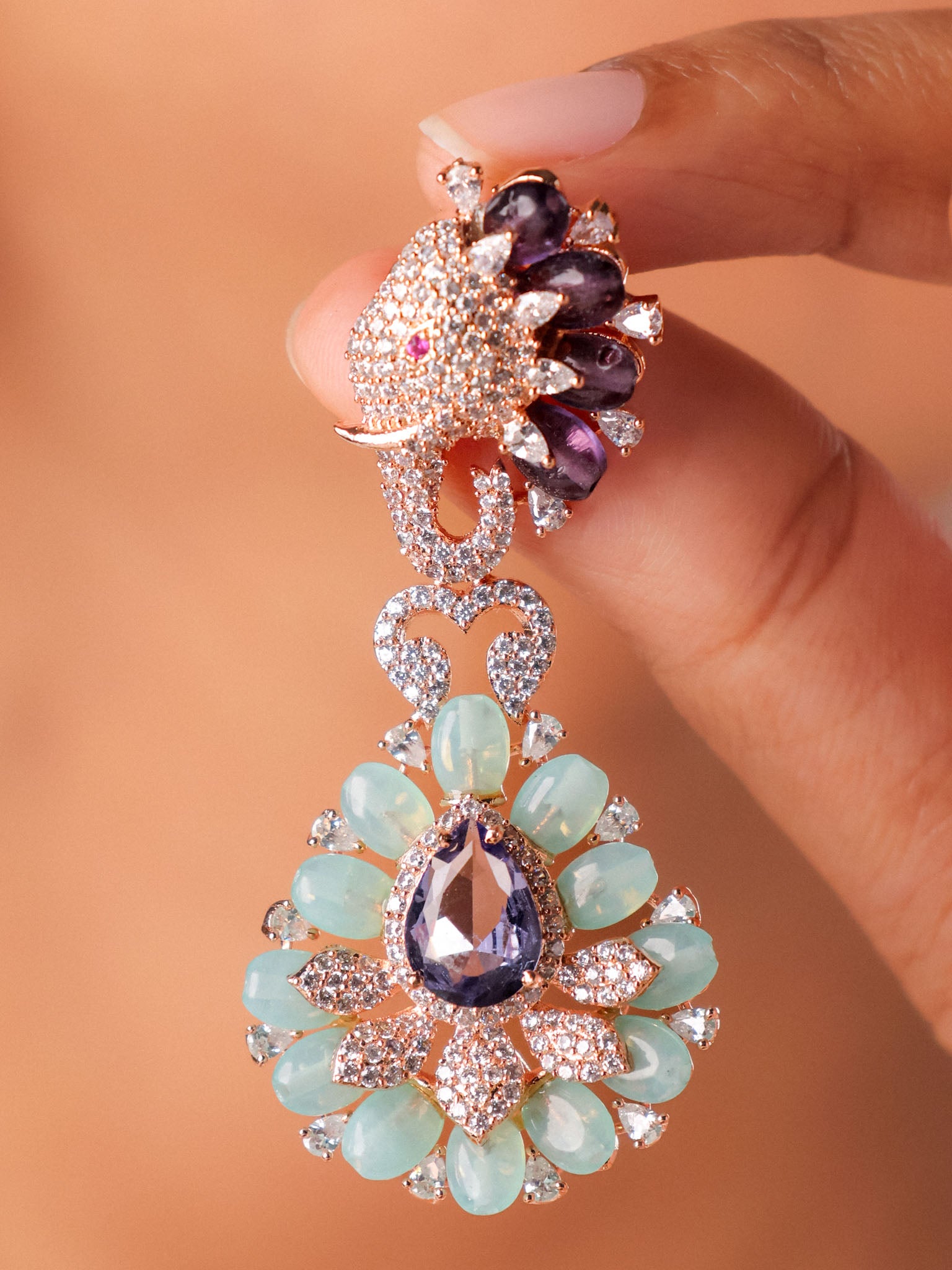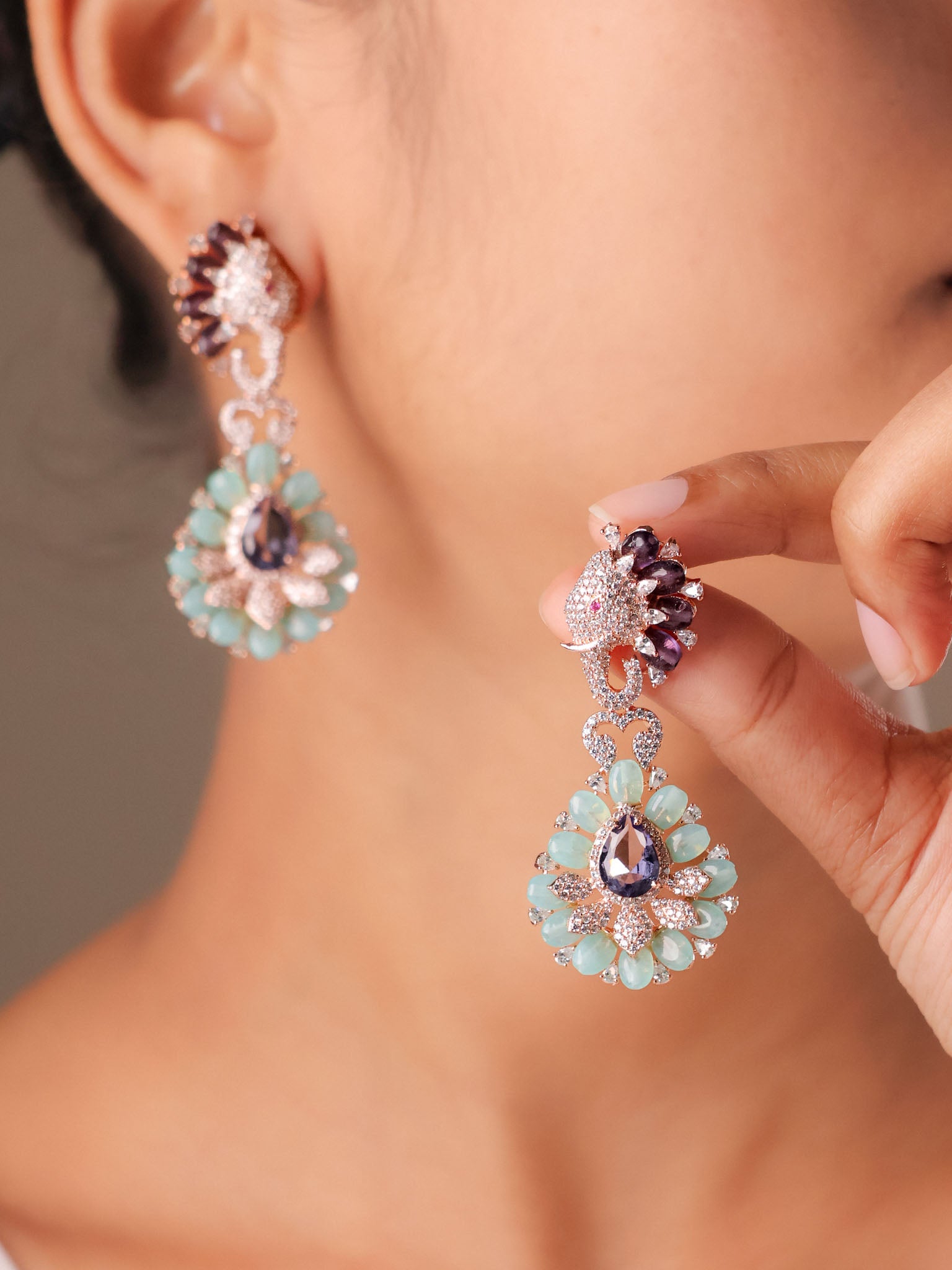 Symbolising wisdom, strength, and auspicious beginnings, the Gajraj Bloom Statement Earrings blend heritage symbolism with contemporary elegance. Featuring a finely detailed elephant motif at the top, the design flows into a dramatic floral chandelier adorned with soft aqua-toned stones and a faceted teardrop centre.