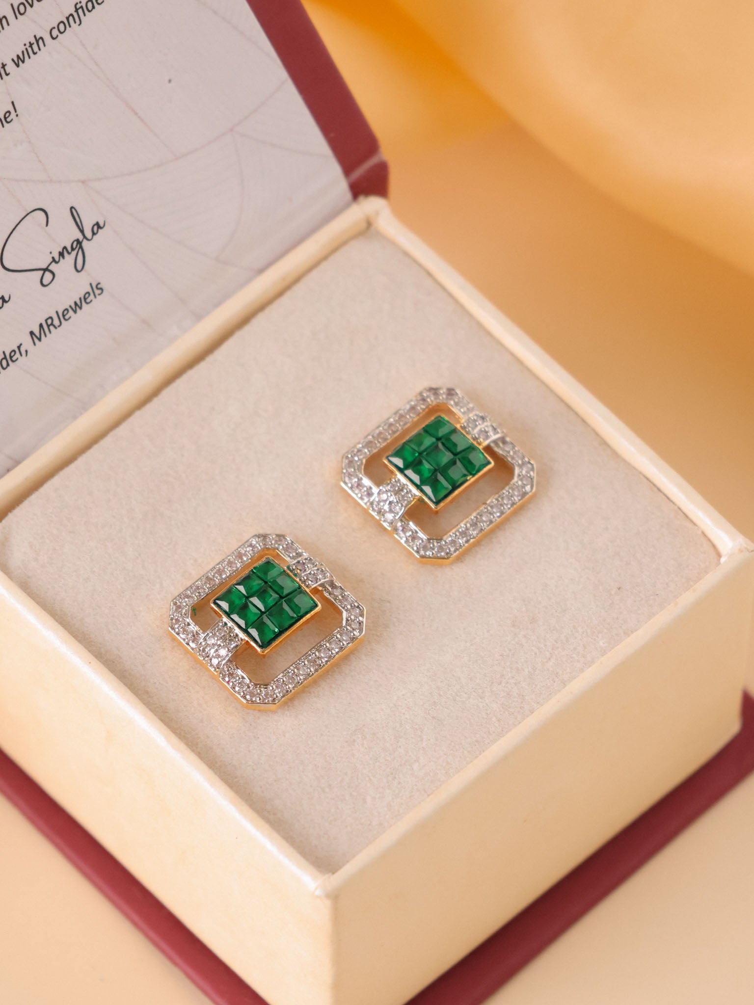 Refined, radiant, and effortlessly elegant — the Scarlet Éclat Studs are crafted for modern luxury lovers. Featuring a cushion-shaped ruby-toned centerpiece arranged in a geometric grid, these studs are framed with a shimmering halo of brilliant stones, creating a perfect balance of bold colour and timeless sparkle.
