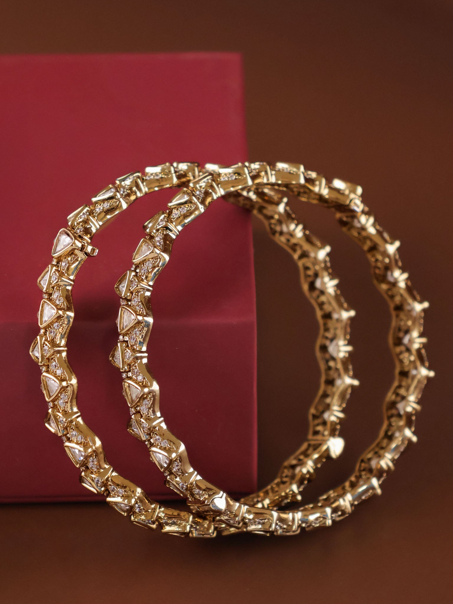 Inspired by old-world Victorian elegance, the Victorian Lumière Openable Bangles are crafted to make a refined yet powerful statement. Featuring intricately set triangular-cut stones framed with fine brilliance detailing, these bangles reflect timeless artistry with a contemporary silhouette.