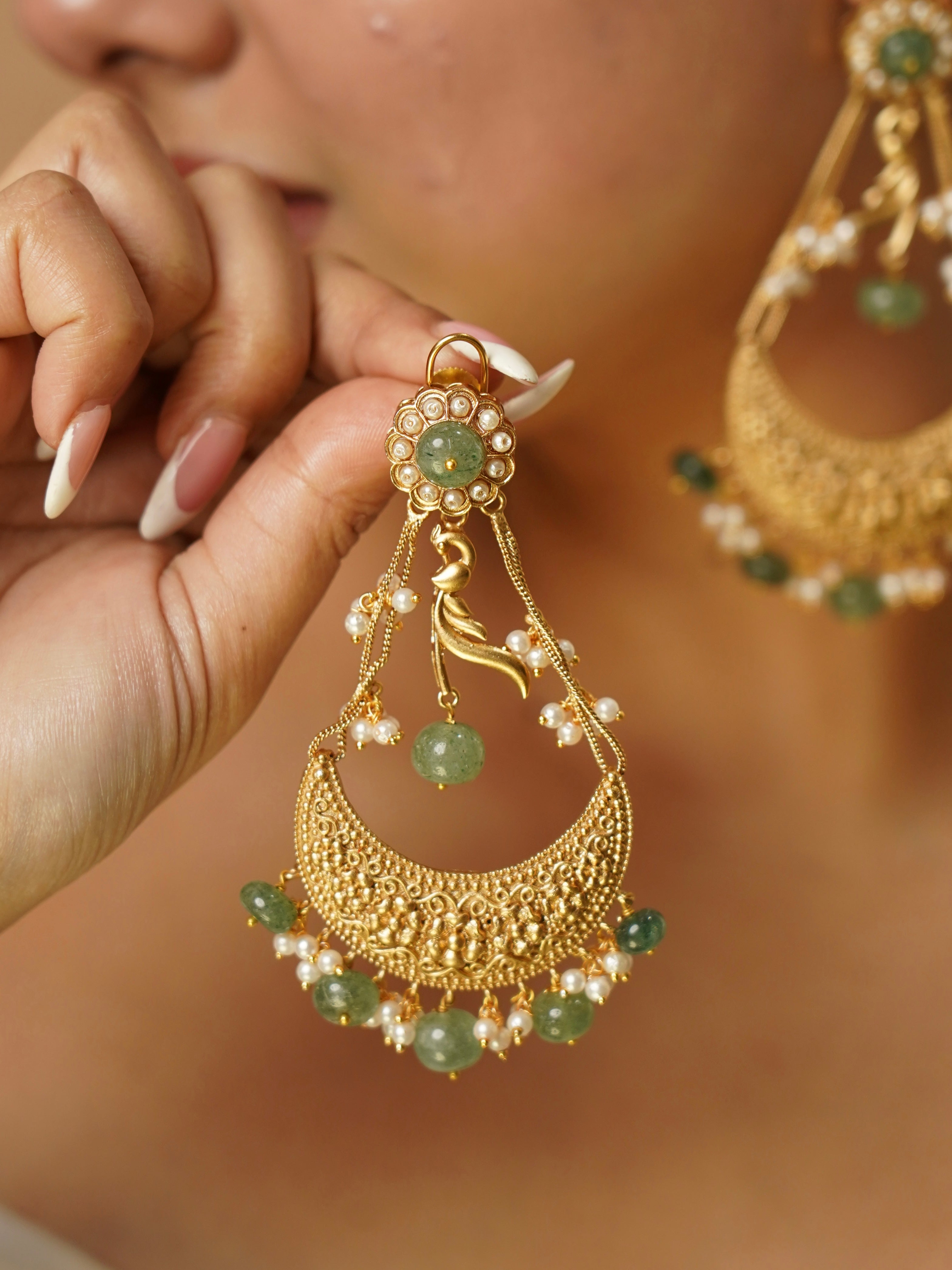 Emerald Green Kundan Chandbali Earrings with Pearls