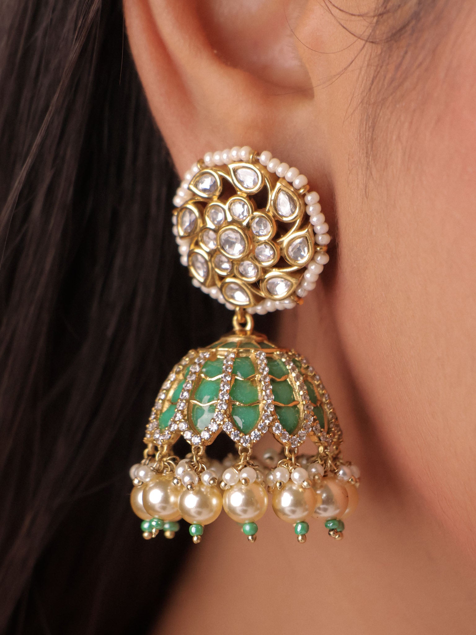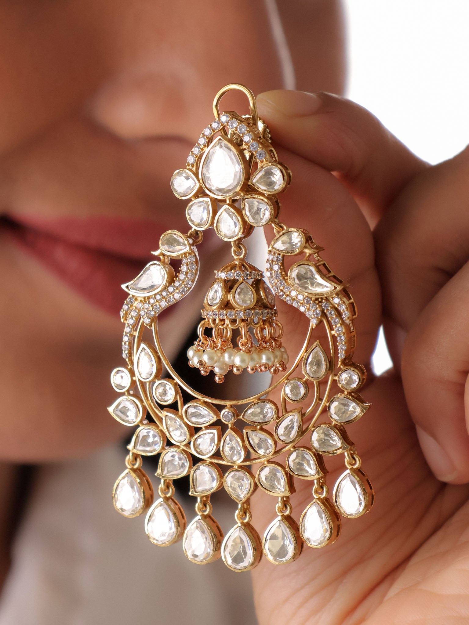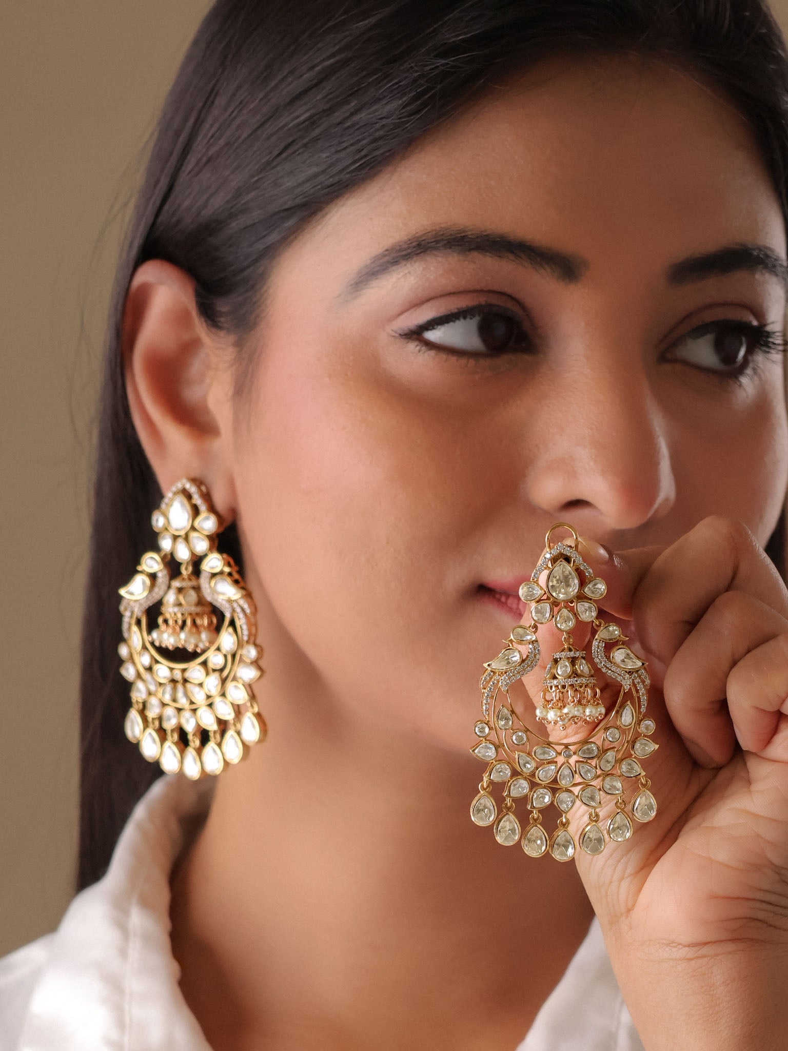 Long uncut polki earrings with pearl strands and gold-tone finish