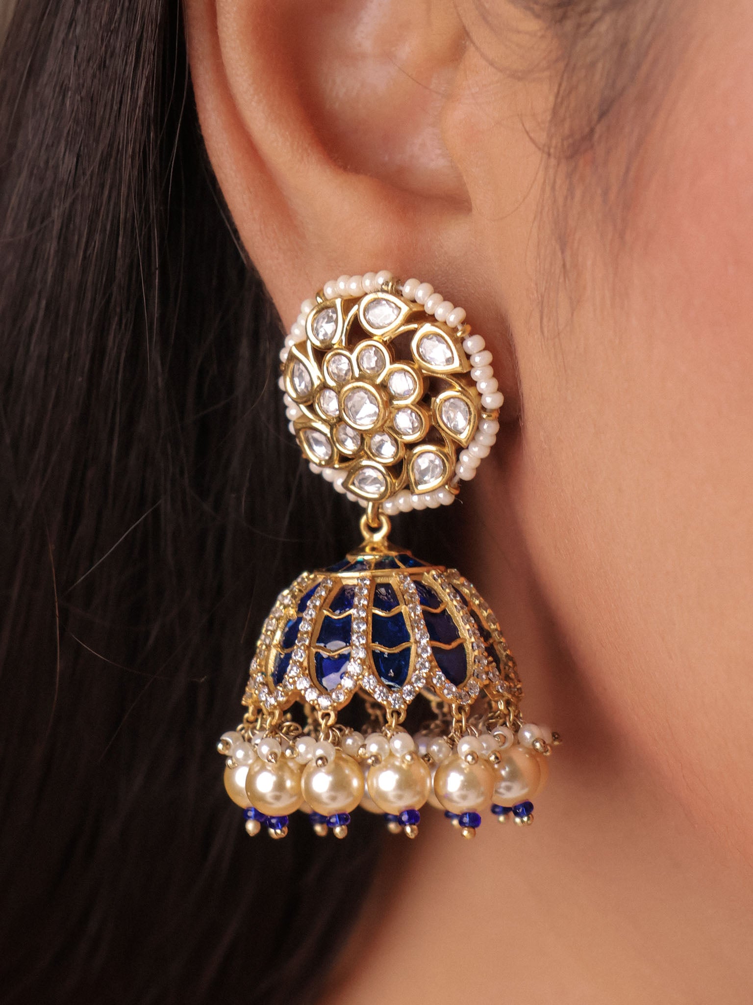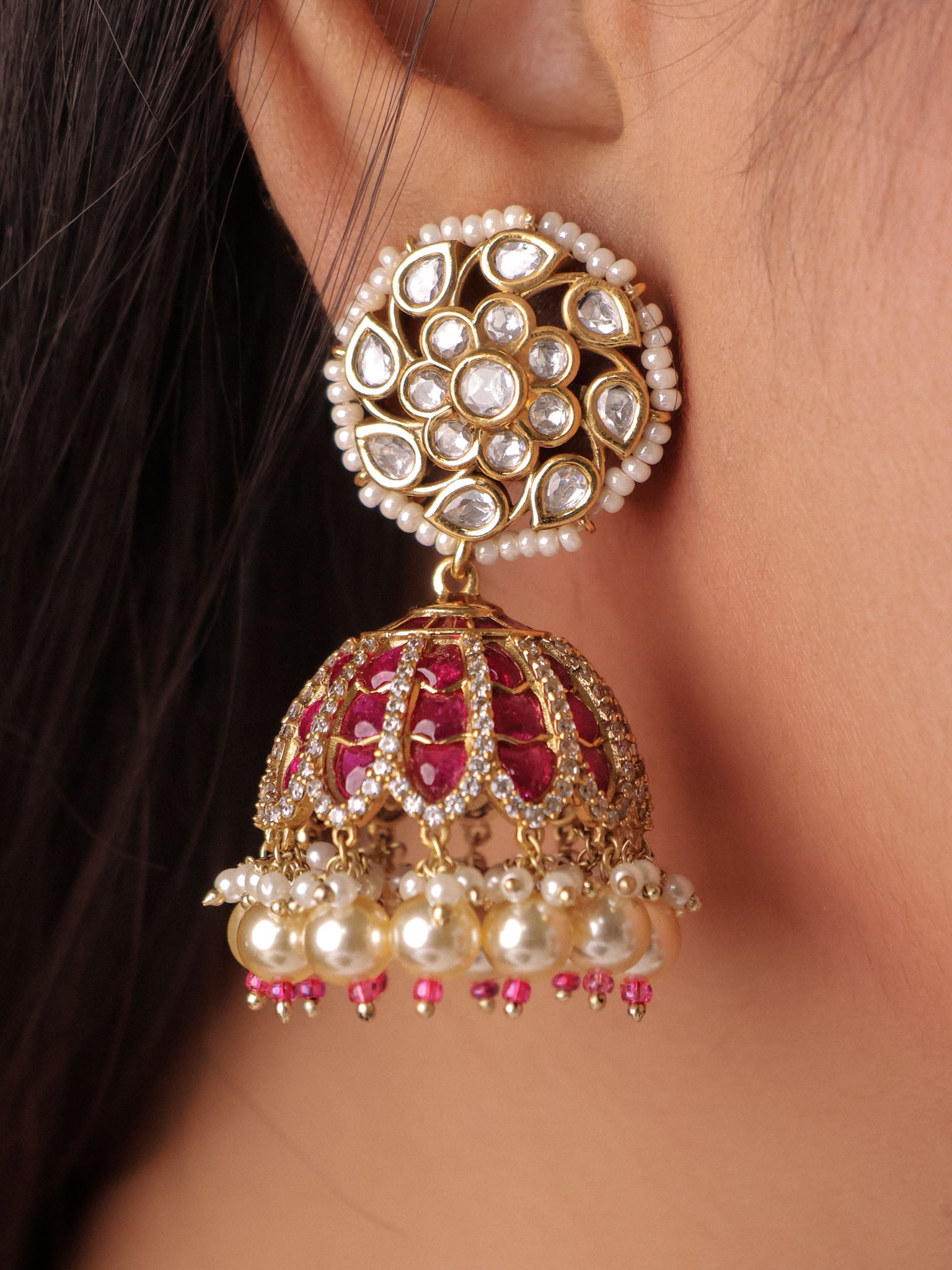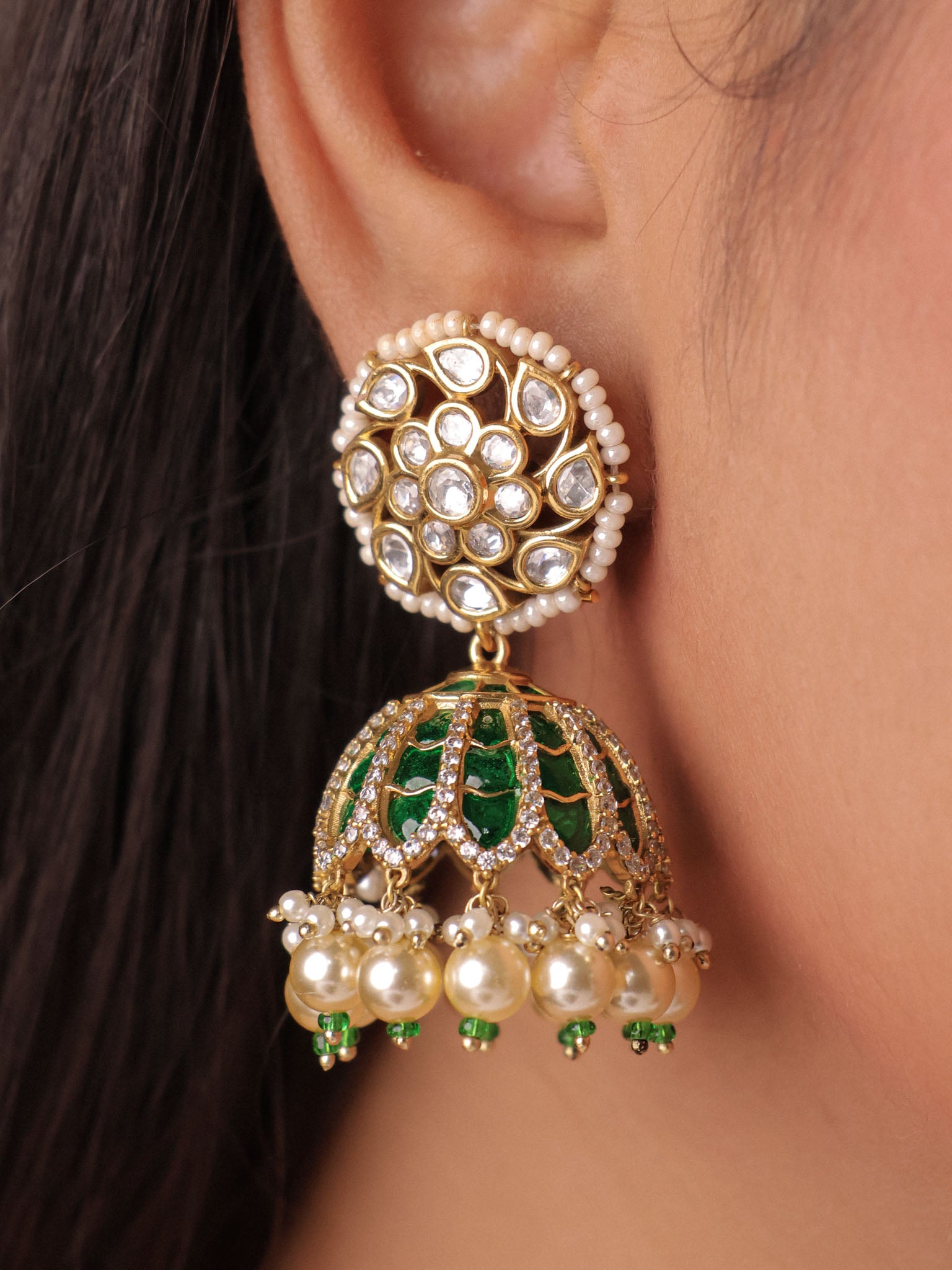 Long uncut polki earrings with pearl strands and gold-tone finish