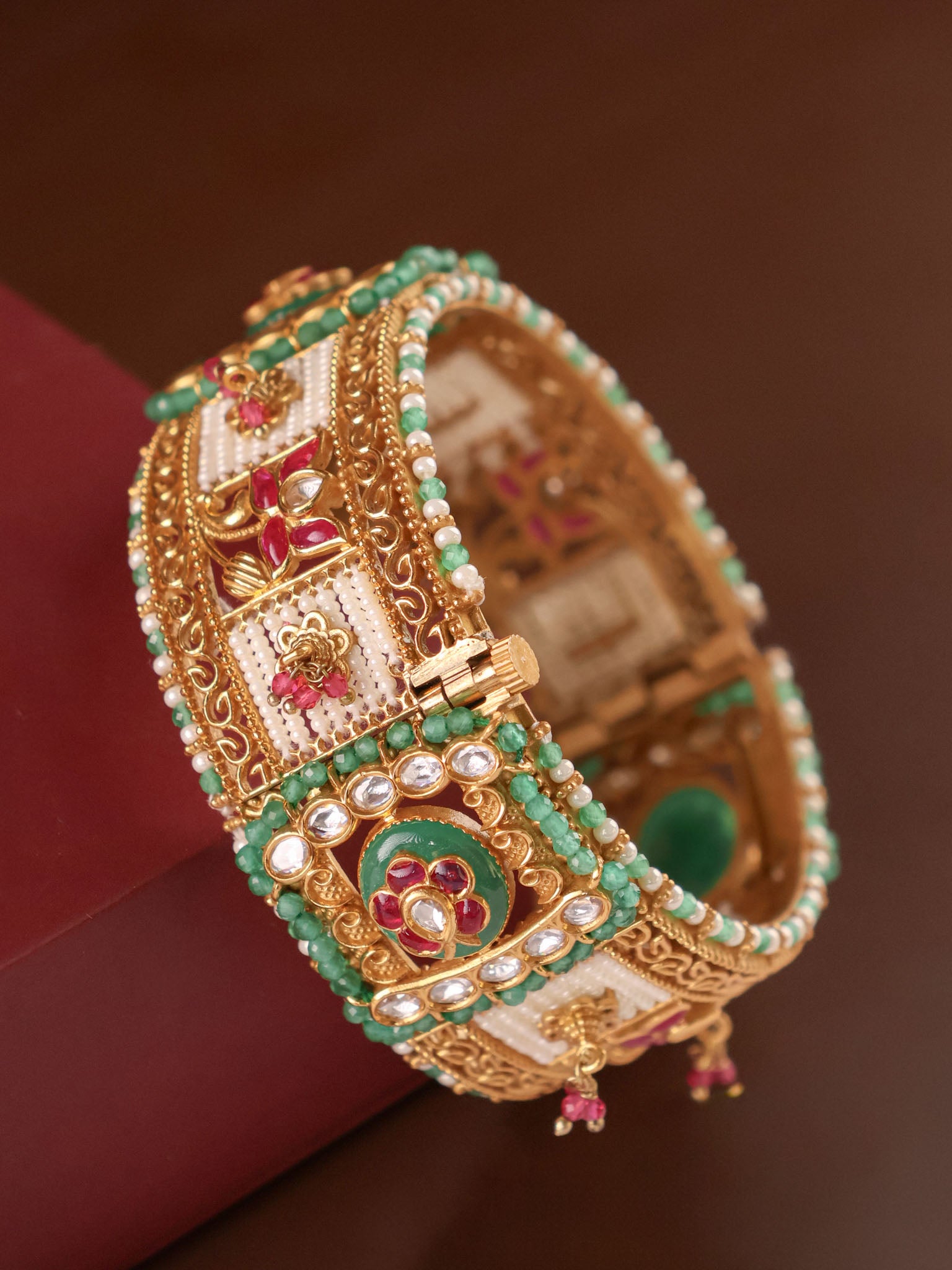 A kada is a thicker cuff that can be worn solo or as a pair. A bangle is a rigid circular band. A bracelet is usually flexible and fastens with a clasp. Each style offers a distinct look and feel.