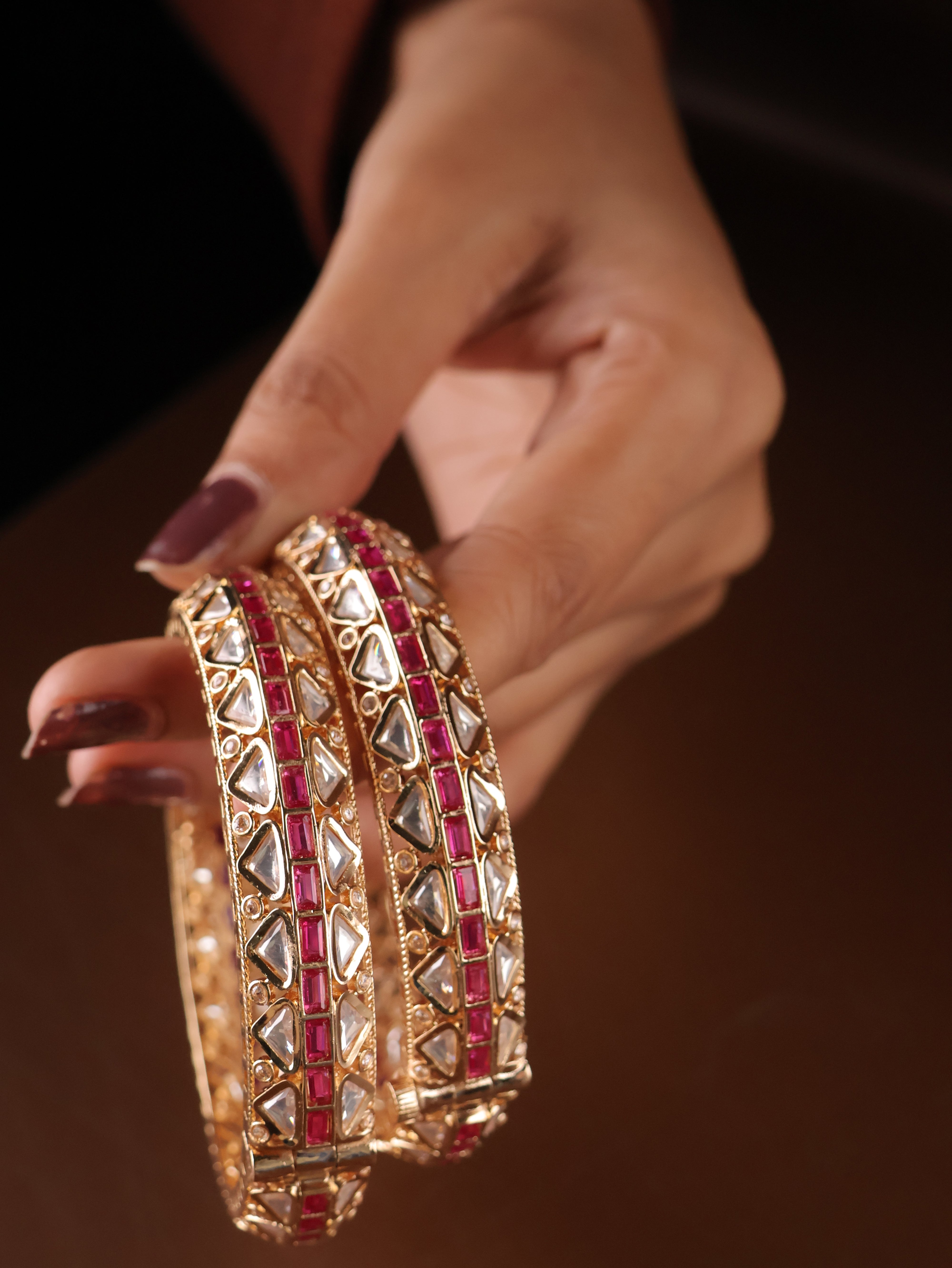 Hand-set triangle Polki with ruby baguette rows, finished in rich 22K micron gold. These designer statement kadas feature an open jaali inner for comfort and a secure box clasp with safety—perfect for weddings, sangeet, and luxe festive looks.