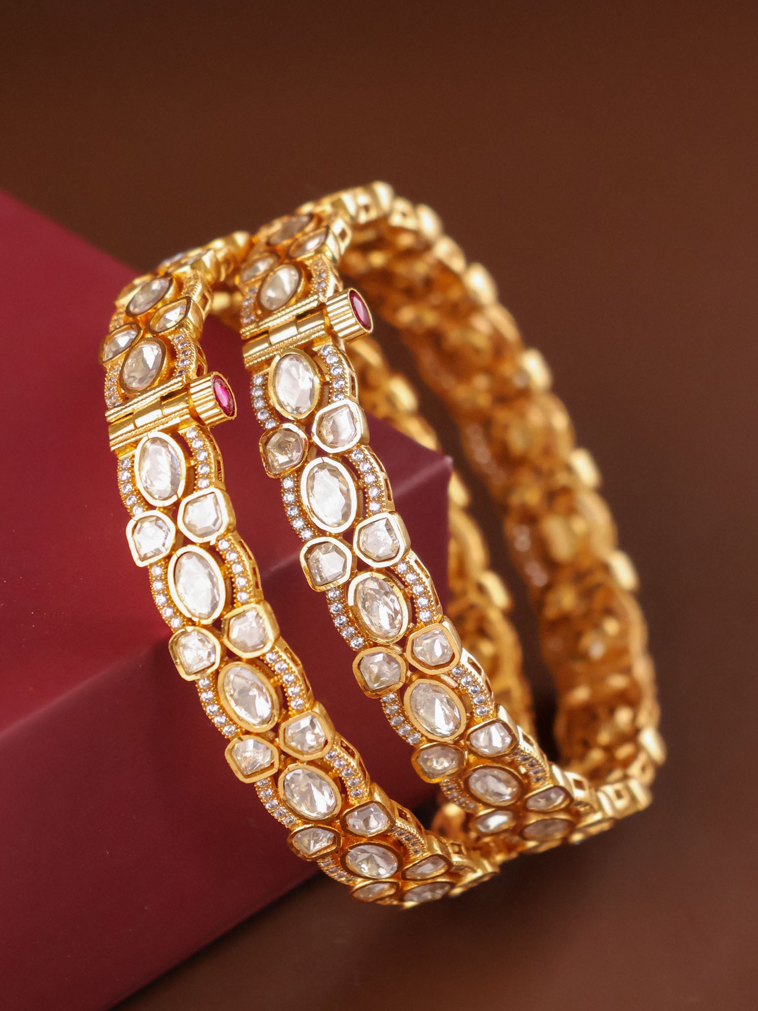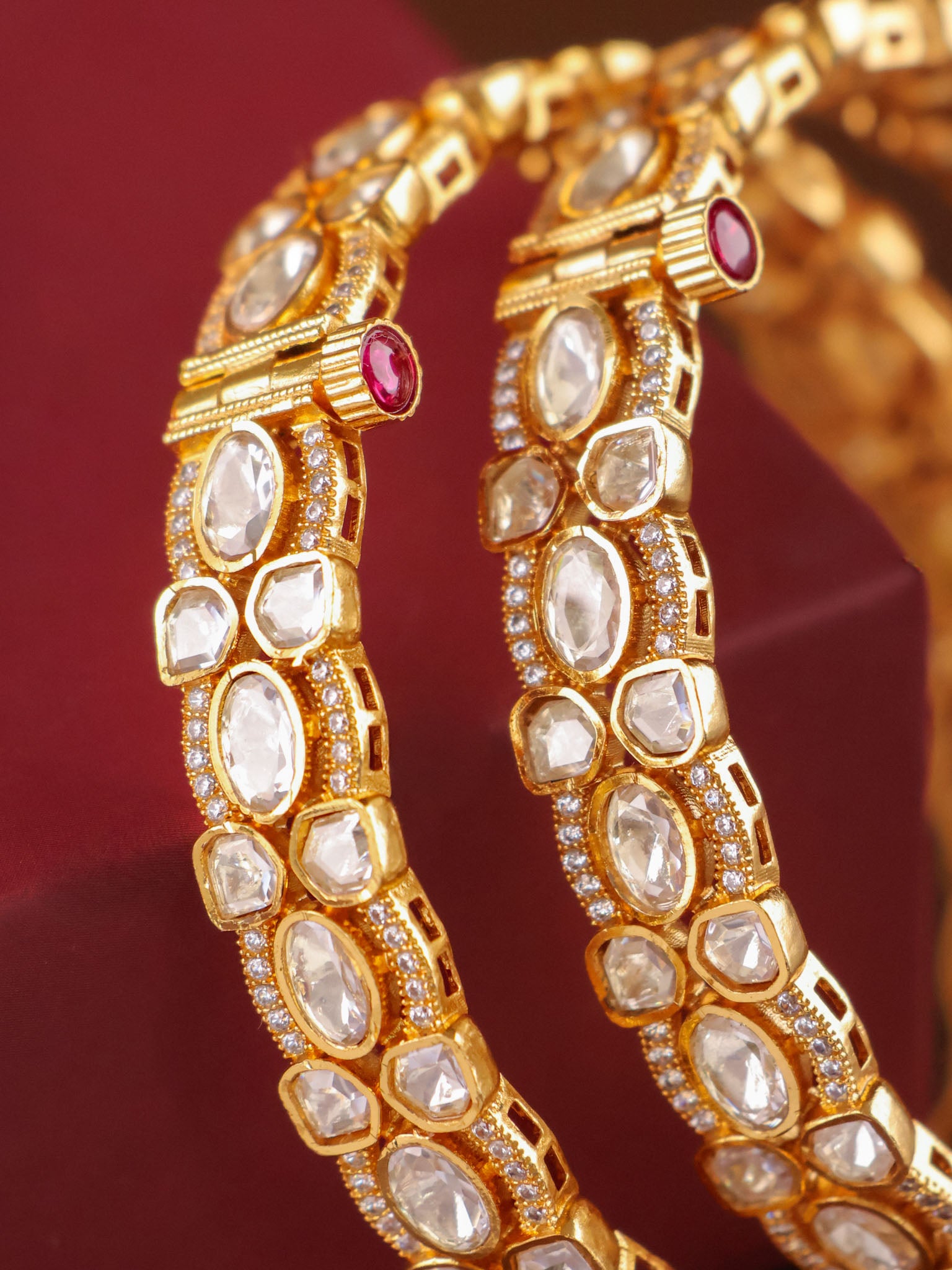 The elegant gold-toned frame is accented with intricate detailing, while the openable clasp ensures a seamless fit and effortless wear. Crafted as a matching pair, these bangles strike the perfect balance between statement luxury and classic elegance.