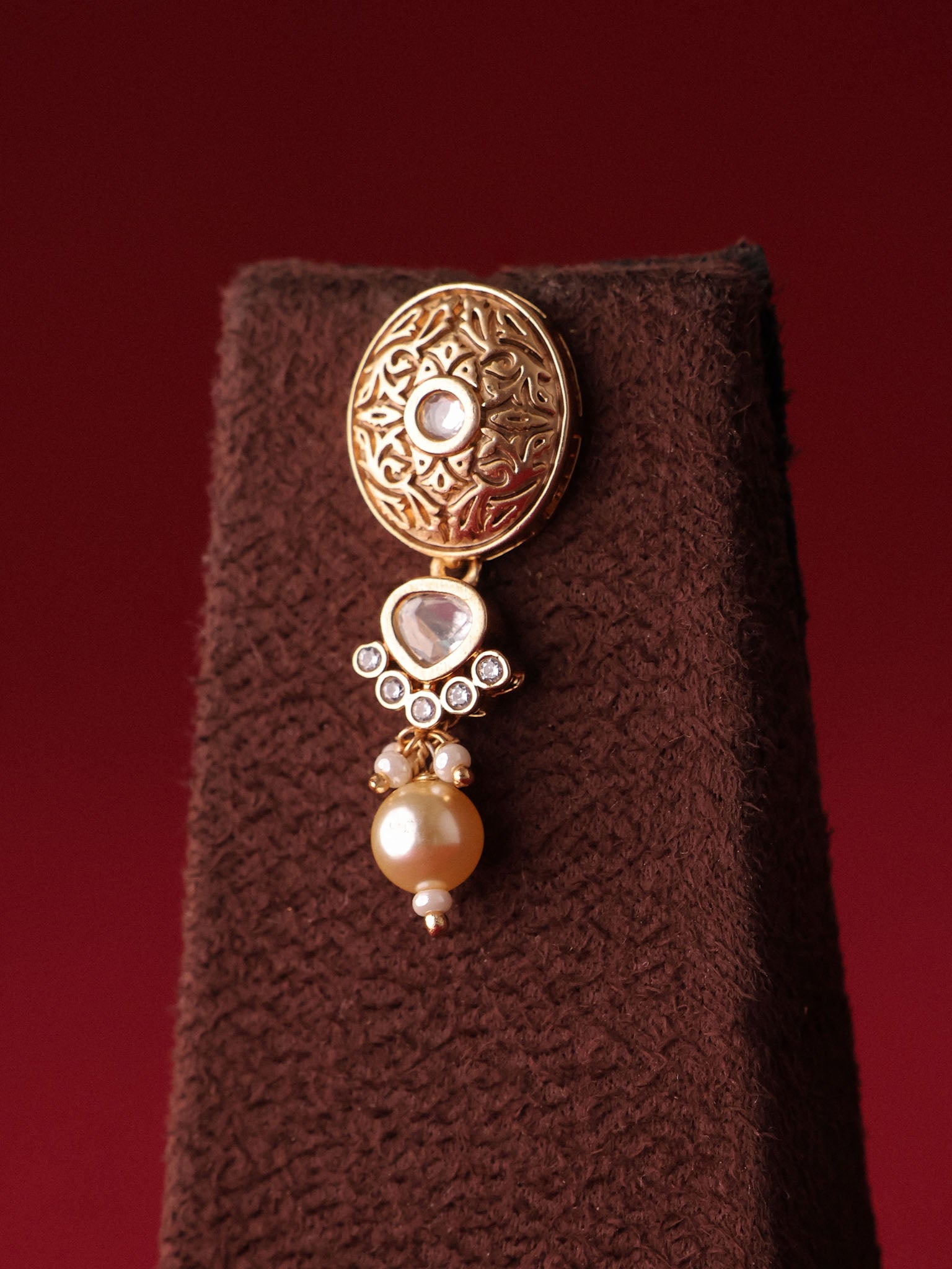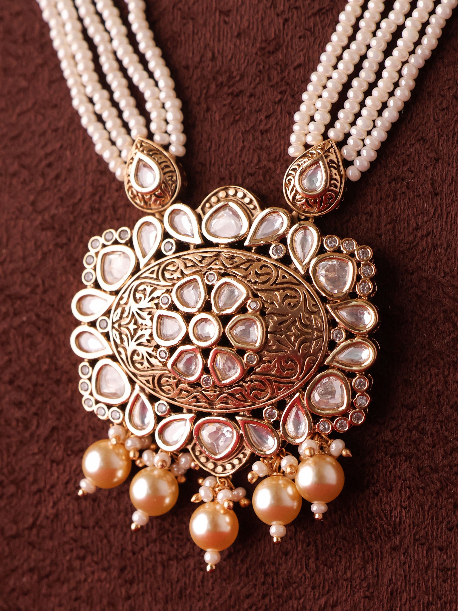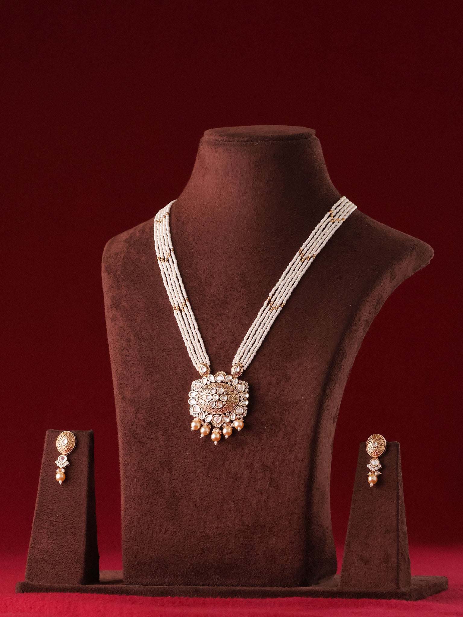 This exquisite pearl polki necklace set features multiple strands of fine ivory beads, anchored by a statement heritage pendant adorned with intricate filigree work and delicate polki detailing. The soft pearl drops add movement and old-world charm, making it a perfect blend of subtlety and grandeur.