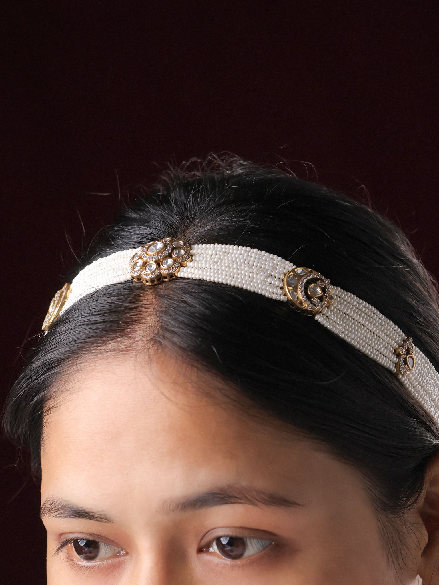 A regal pearl-studded headband crafted with multiple layers of fine ivory pearls and intricate Kundan floral motifs. This piece beautifully blends tradition with modern elegance, making it perfect for brides, bridesmaids, and festive styling.