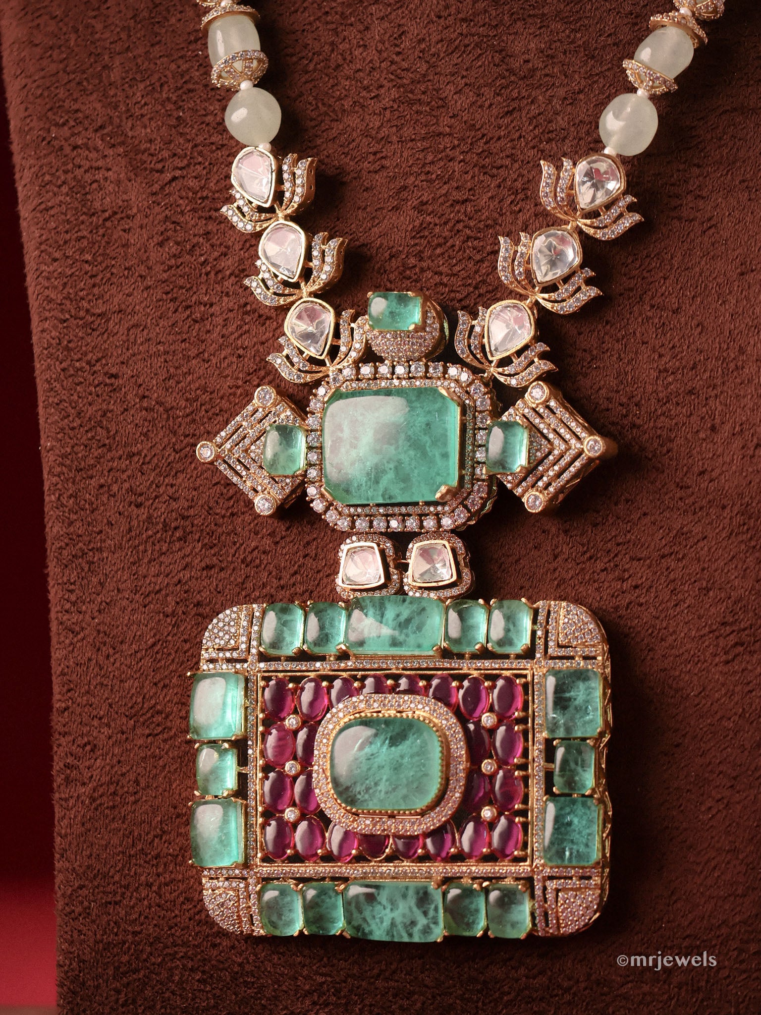 Elegant Emerald and Ruby Jewelry Set with Artistic Gold Detailing - Discover the Charm of Regal Greens and Vivid Reds with this Exquisite Necklace and Earring Set. Perfect for Traditional Ceremonies and Luxurious Evenings.