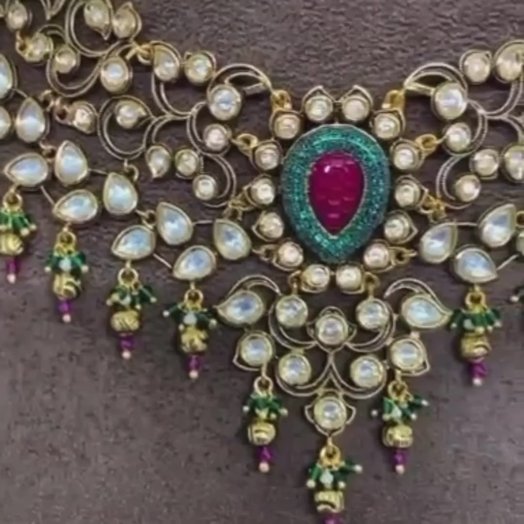 Featuring intricately crafted Polki stones and vibrant ruby accents, this necklace and earrings set is perfect for brides and special occasions. Elevate your look with the exquisite craftsmanship and luxurious design of this statement piece. Shop now and experience the beauty of traditional elegance.