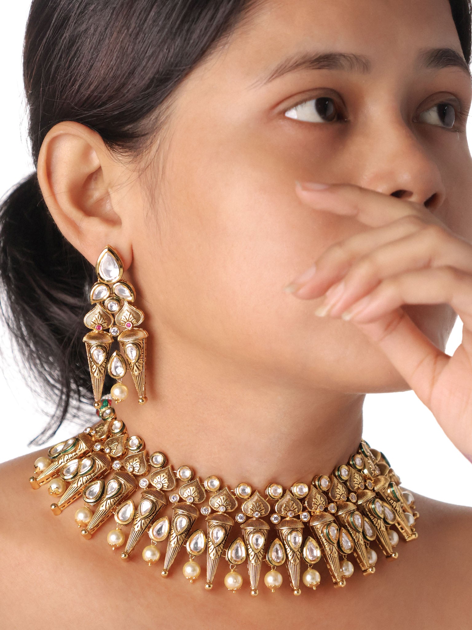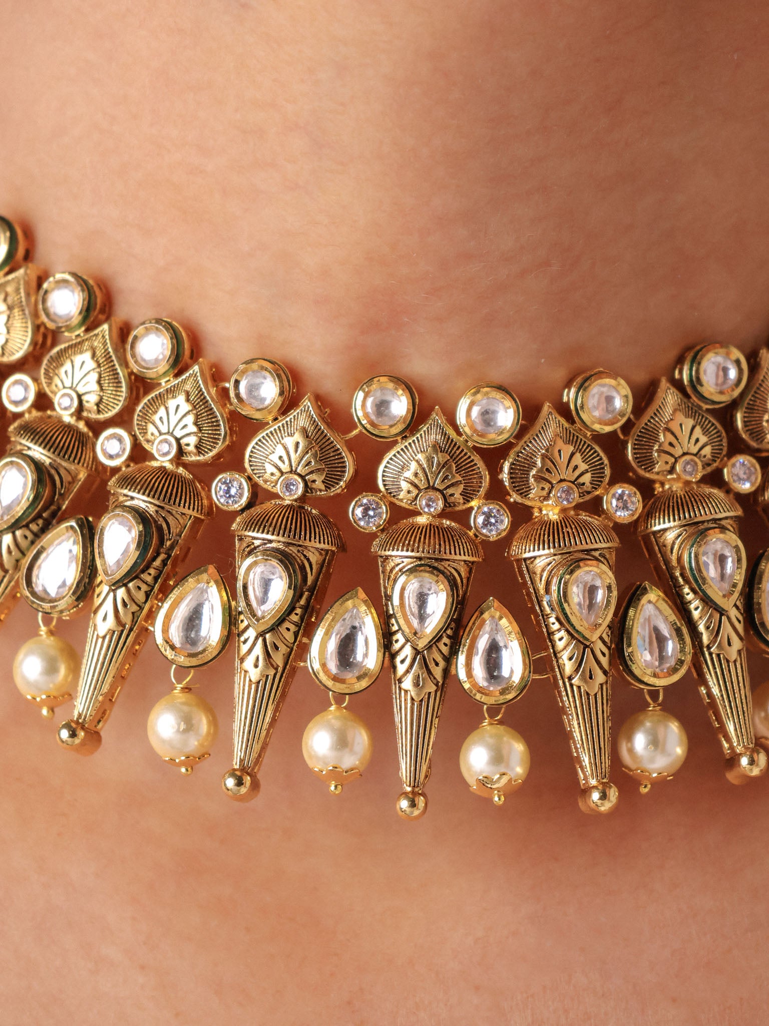 Gold-Plated Kundan Polki Choker Set Pearl & Enamel Detailing