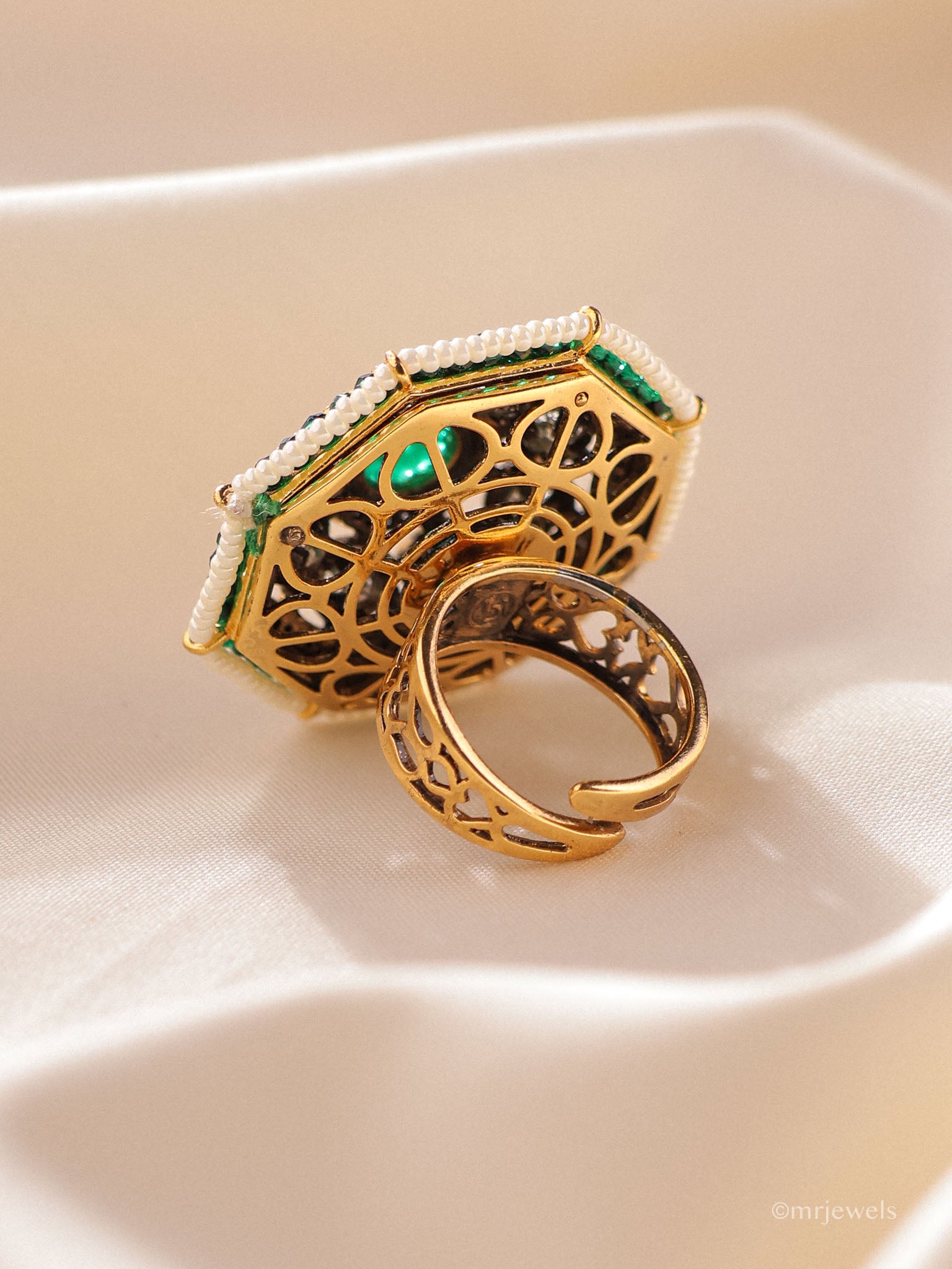 A true statement of regal elegance, the Emerald Noor Kundan Cocktail Ring features a striking emerald centre surrounded by shimmering kundan stones and delicate crystal accents. The intricate geometric design is finished with fine pearl detailing, creating a luxurious heritage aesthetic.