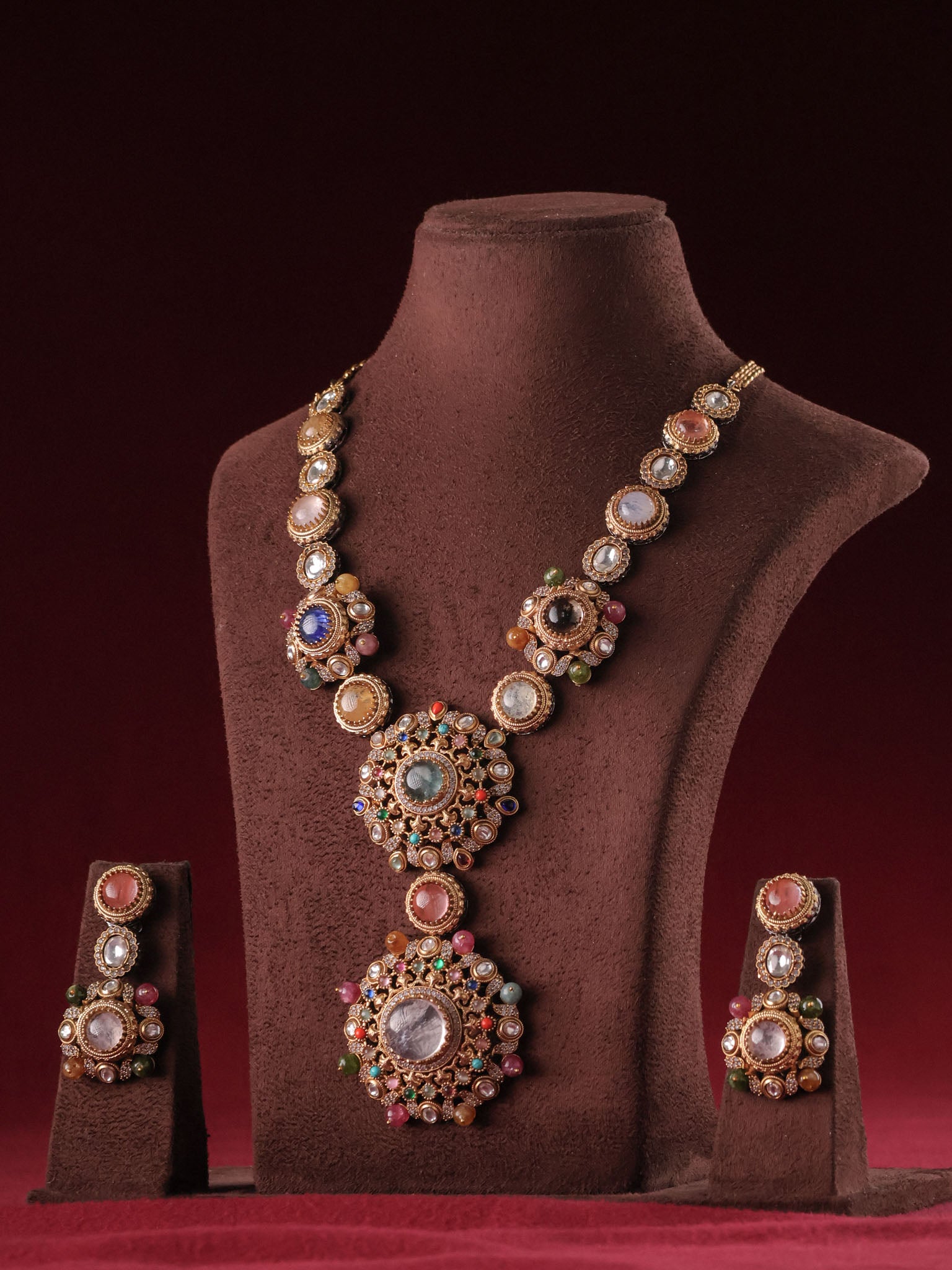 Paired with statement earrings mirroring the same intricate craftsmanship, this set radiates unmatched regal charm.
