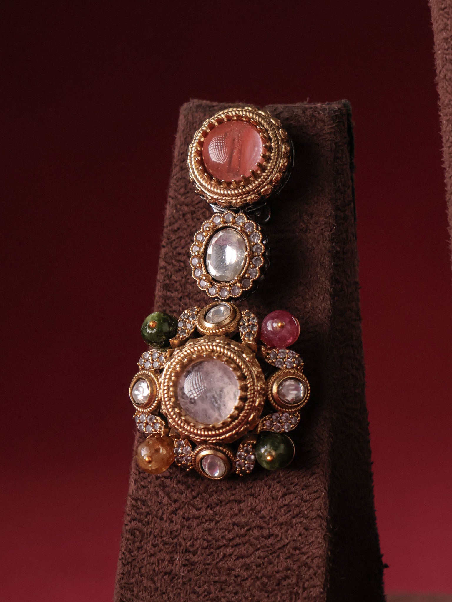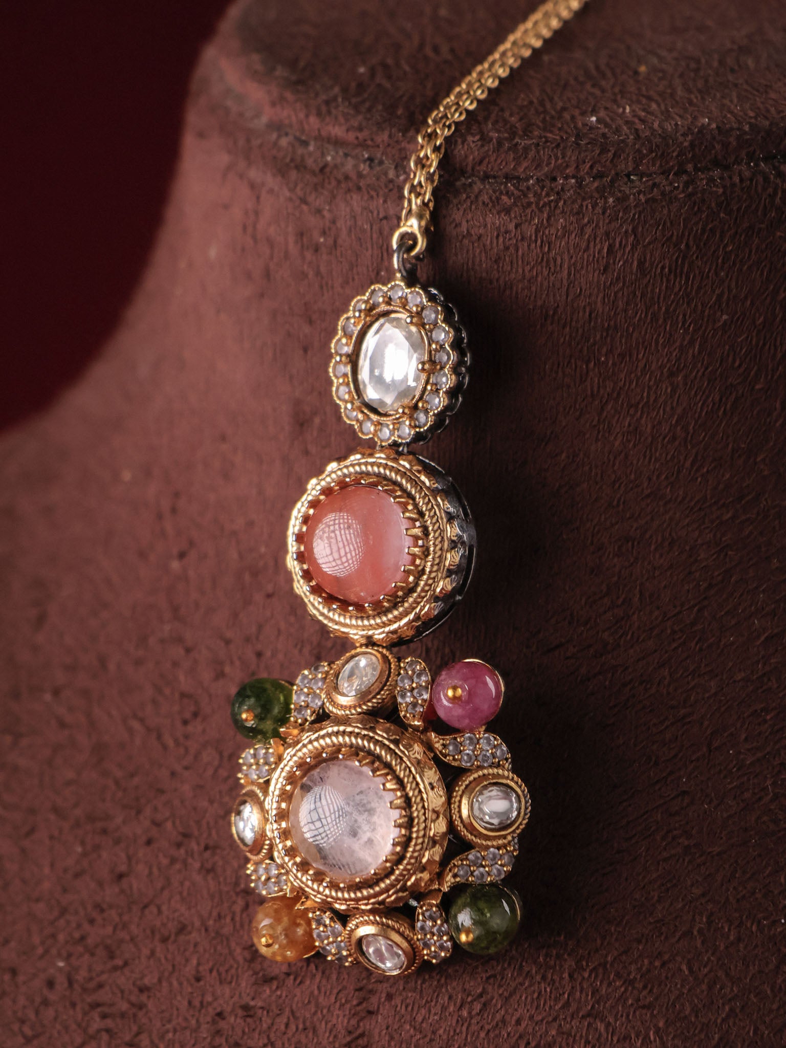 Crafted with meticulously hand-set Polki stones, carved gems and vibrant navratna beads, this long haar showcases three majestic circular pendants—each reflecting the richness of temple artistry. The blend of nine auspicious colours symbolizes prosperity, balance and divine protection, making it an heirloom-worthy piece for every grand celebration.