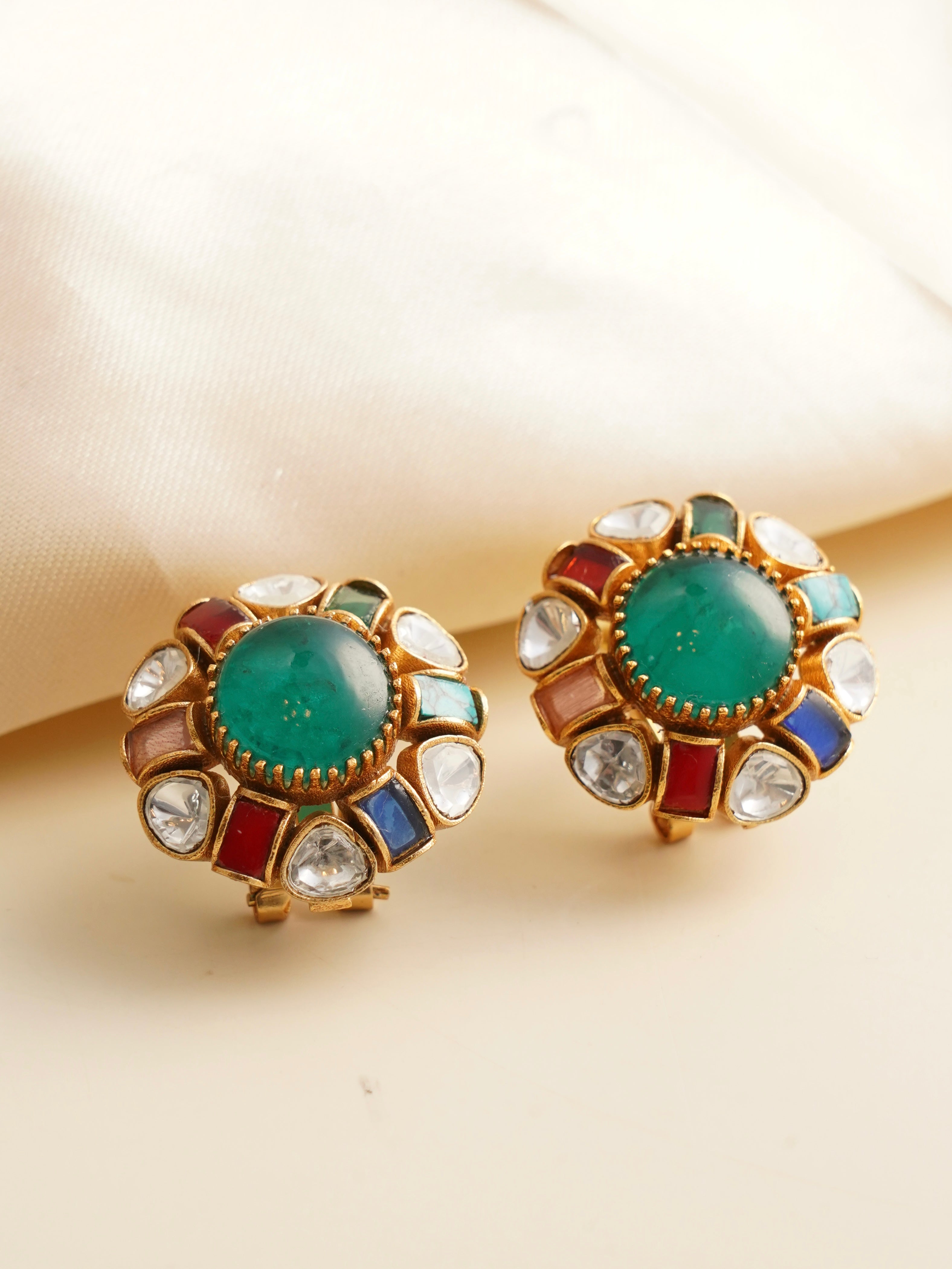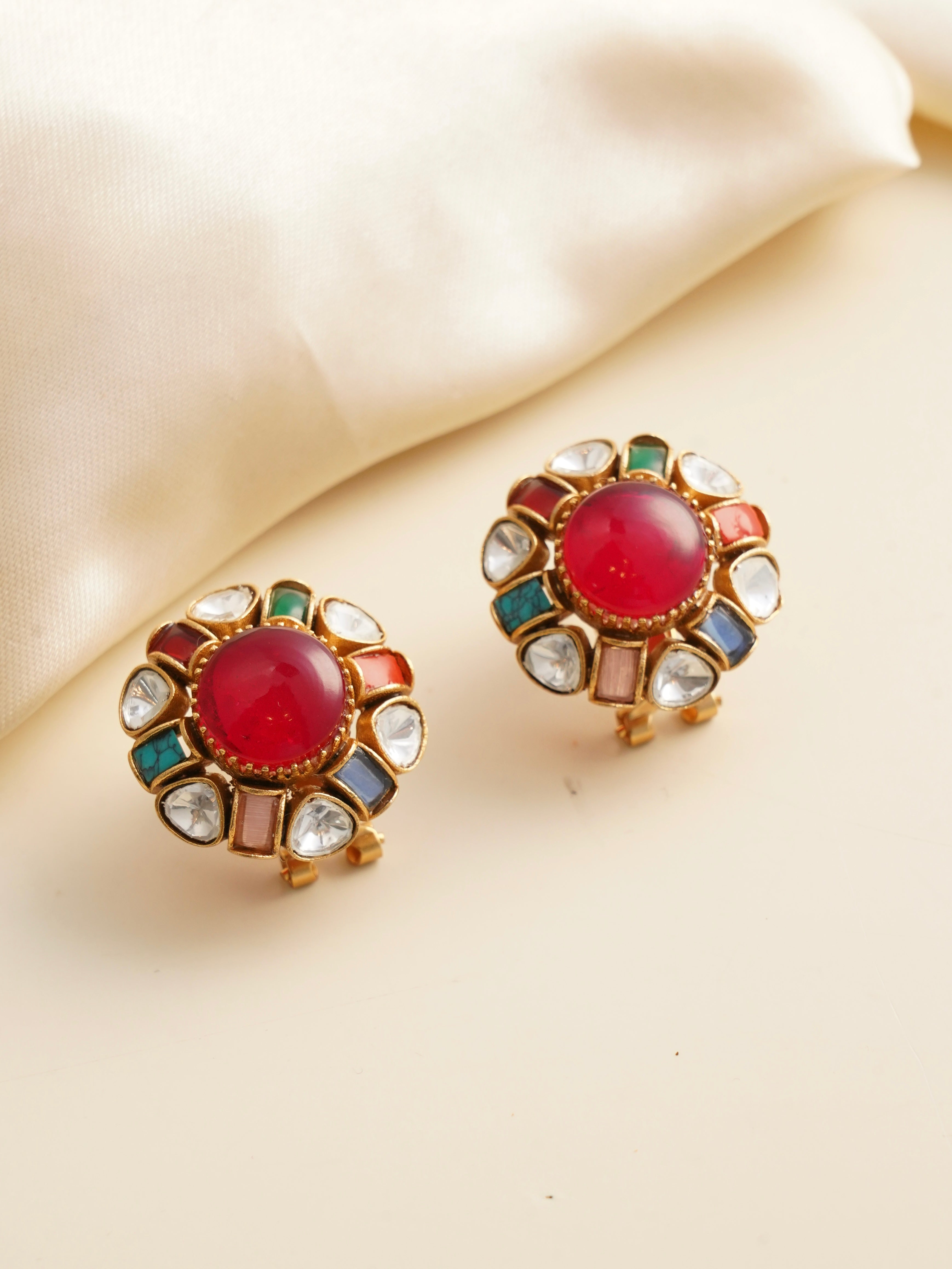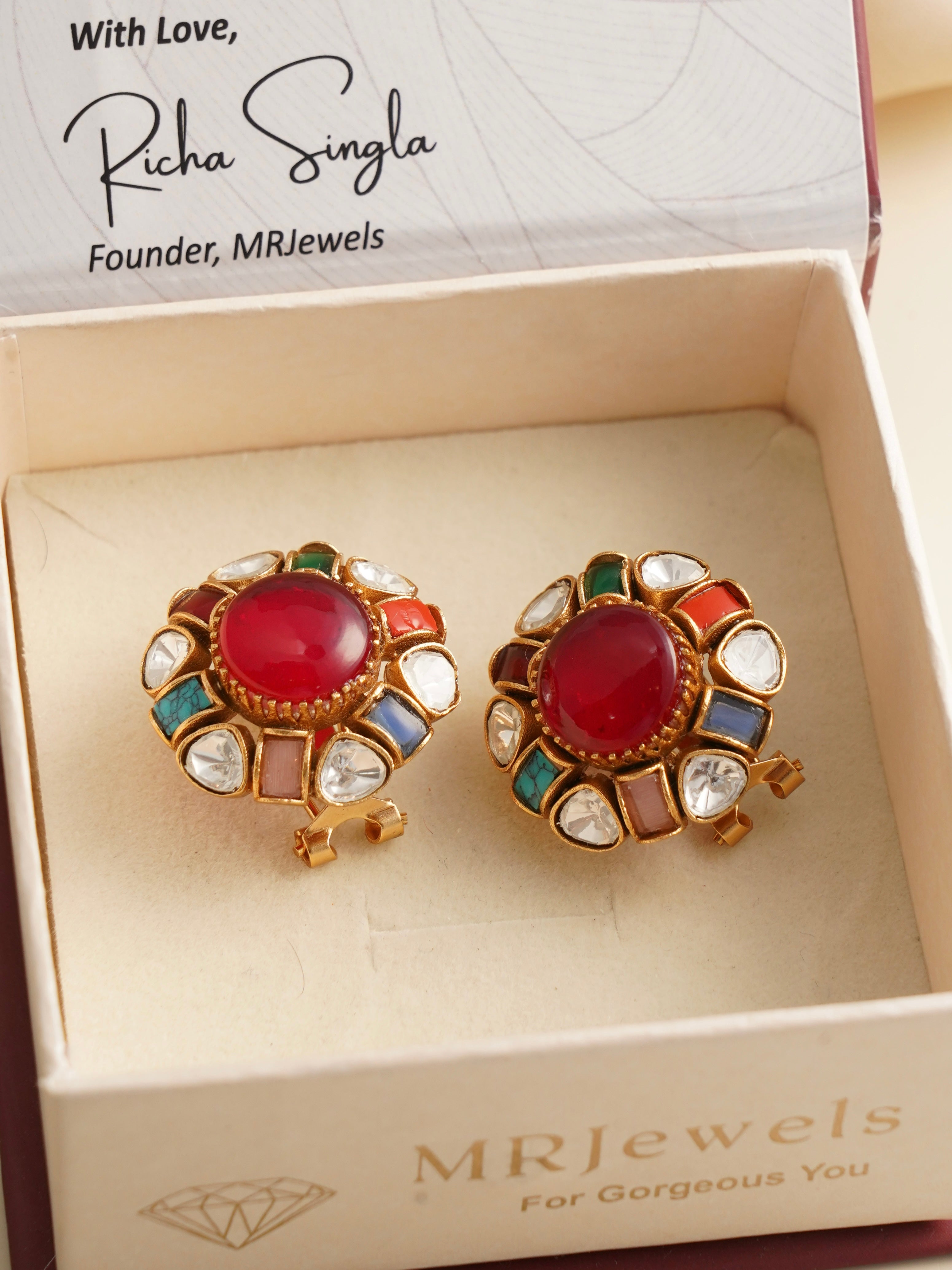 These statement earrings highlight a colorful fusion of enamel work with a classic floral design. Centered with a radiant gemstone, they’re embellished with traditional Kundan-style detailing, adding charm and heritage to any outfit.
