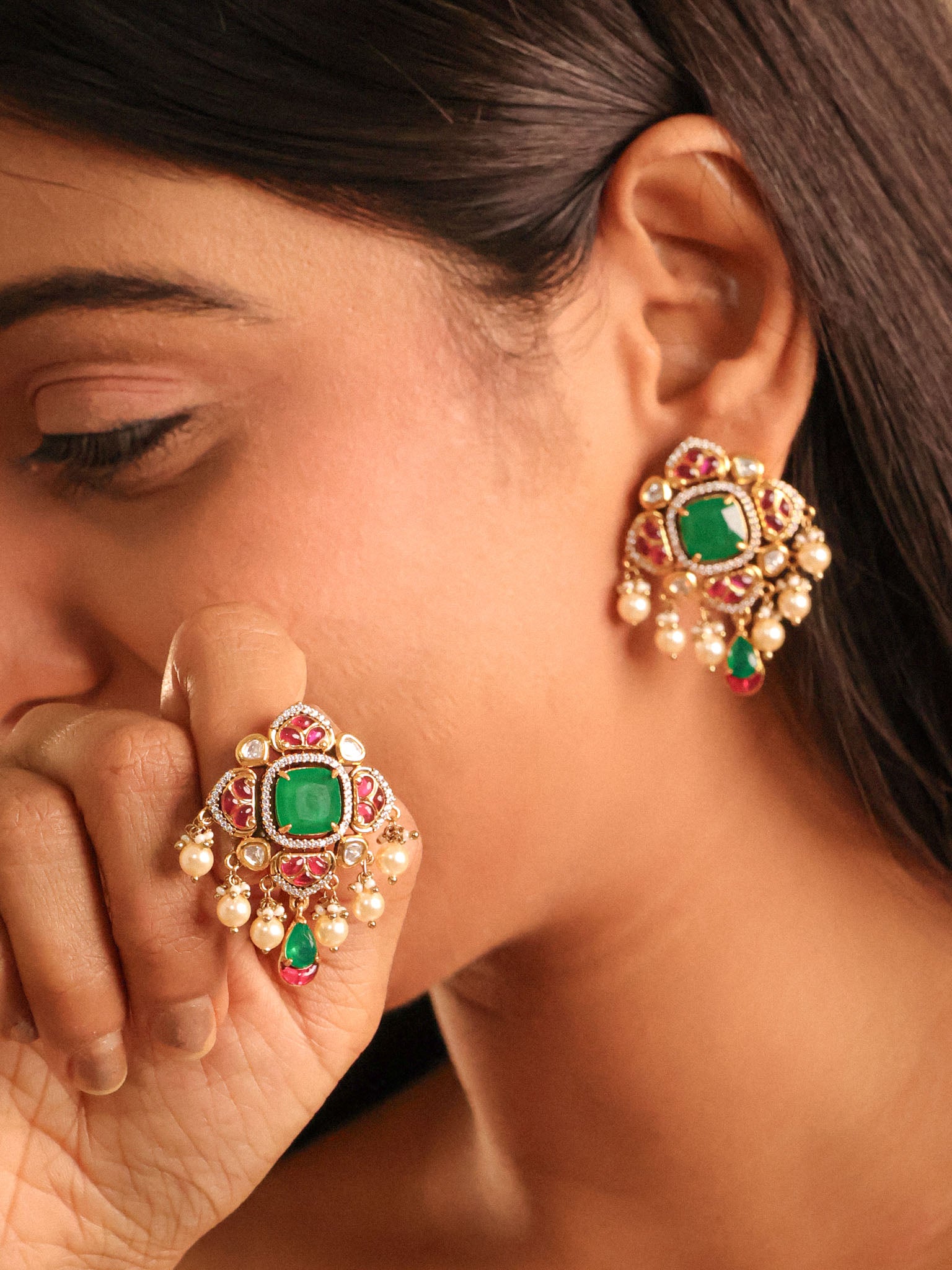 Polki Moissanite Emerald Designer Studs