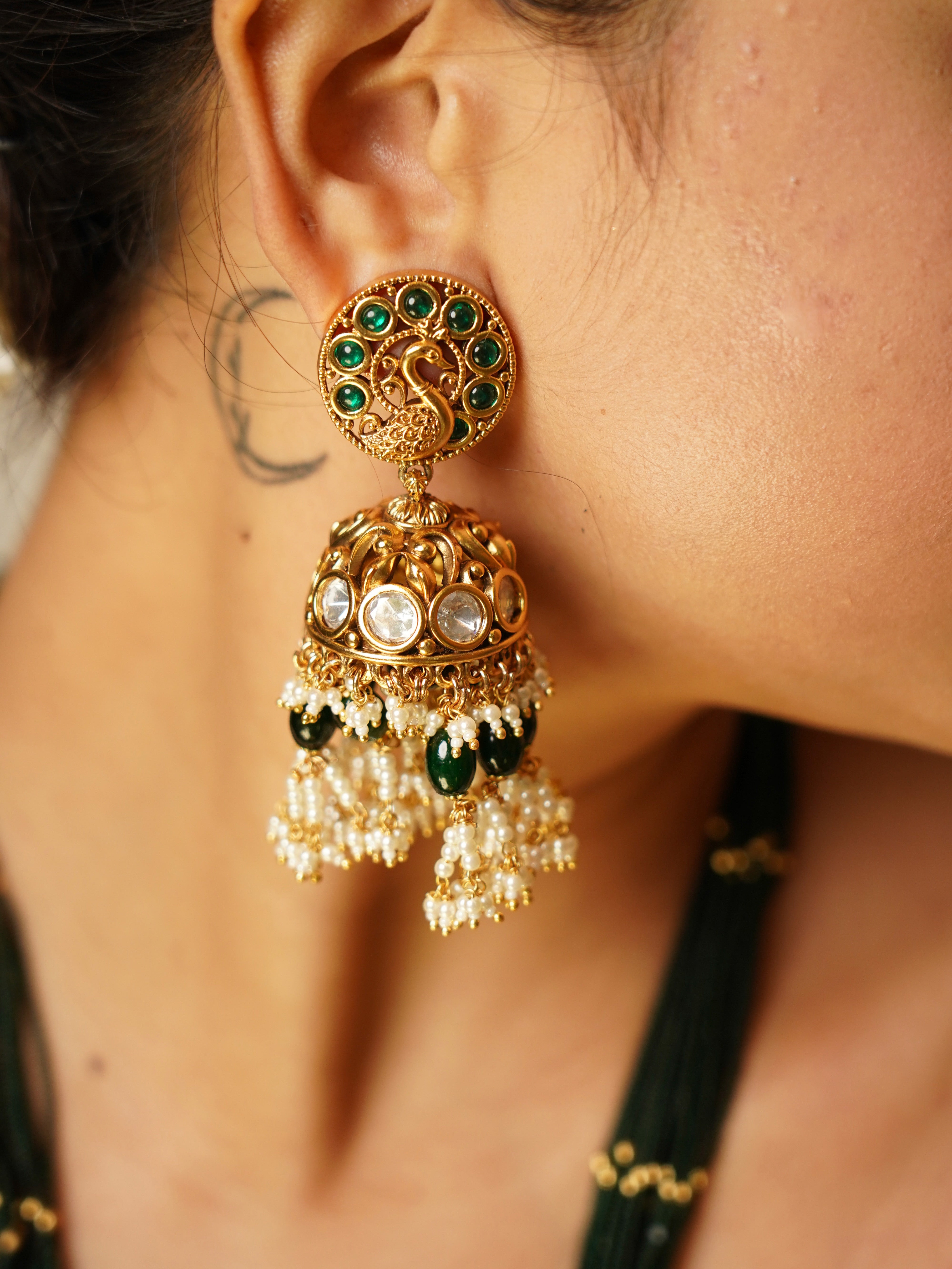The Divine Charioteer Krishna Necklace Set beautifully captures Lord Krishna as the sacred guide of Arjuna, seated on a majestic chariot drawn by seven horses. Embellished with kundan, emeralds, and pearls, this temple-style necklace radiates wisdom and devotionâl perfect for cultural celebrations and heritage jewellery collections.