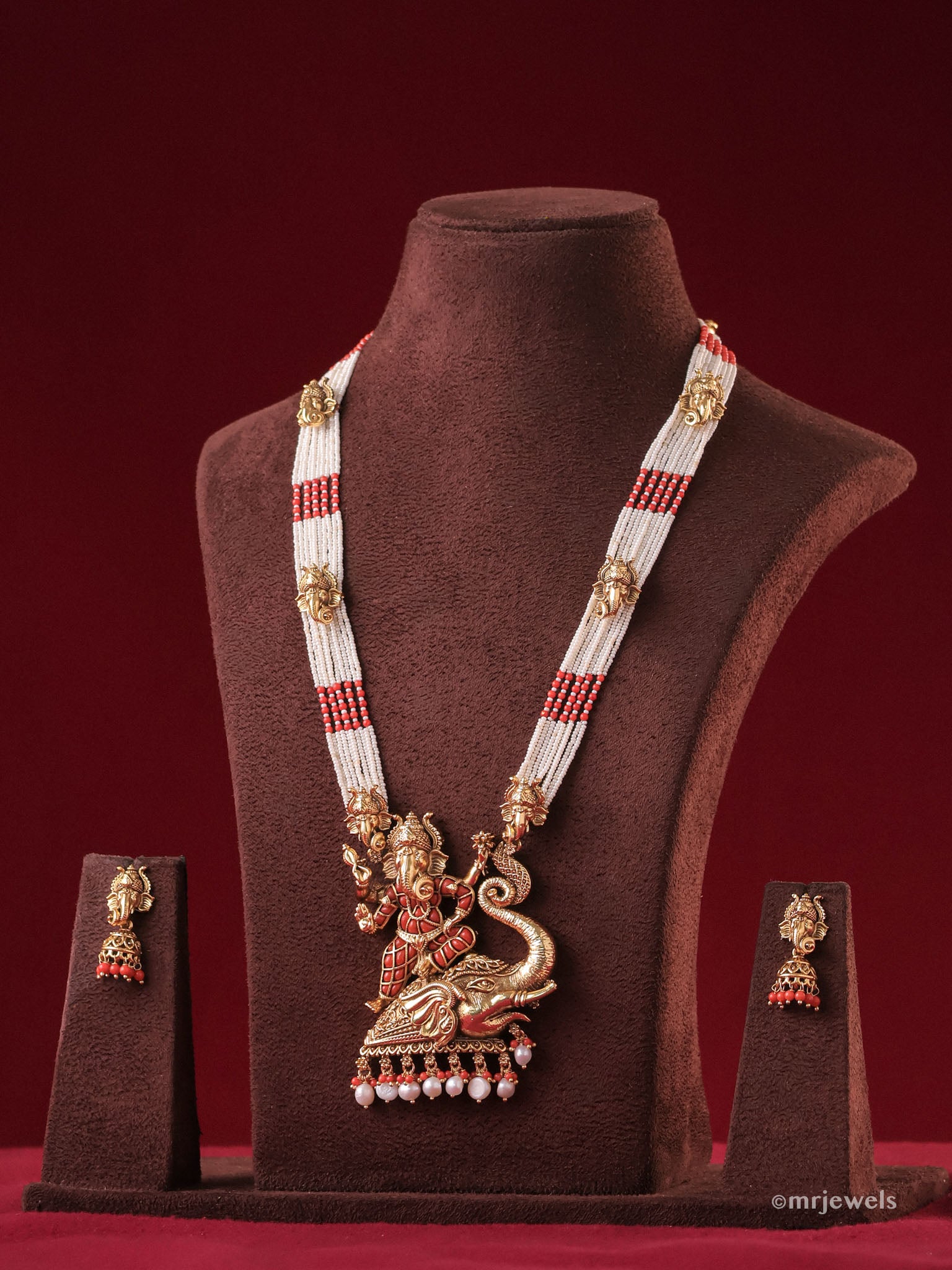 The Royal Ganpati Blessings Necklace Set beautifully blends devotion with artistry, featuring an intricately sculpted Ganesha idol seated on a richly carved elephant. Embellished with pearls, gemstones, and temple-inspired goldwork, this necklace is a symbol of prosperity and protection—ideal for cultural celebrations and special occasions.