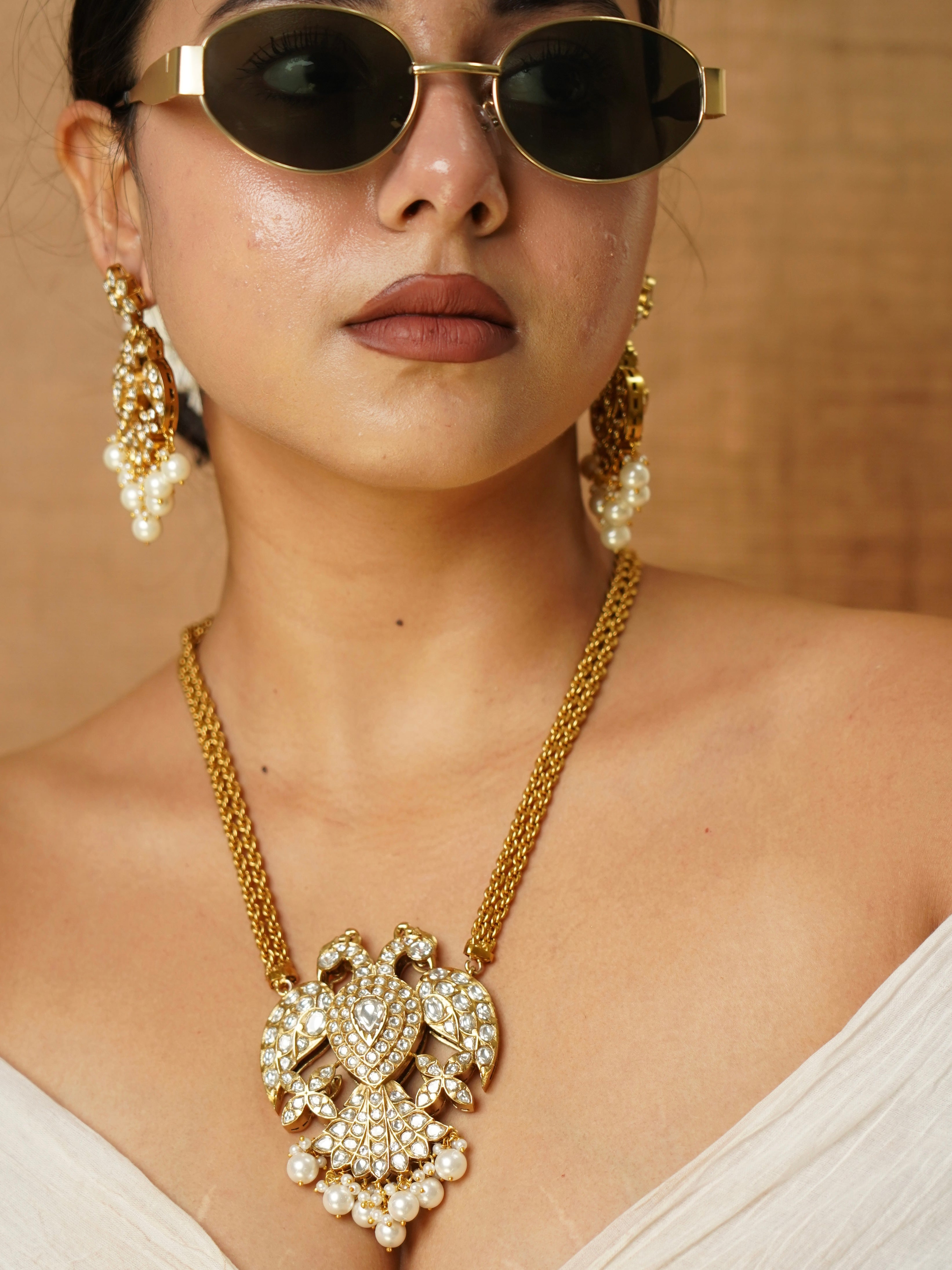 Bold. Majestic. Unapologetically Royal.Inspired by the divine symbol of strength and sovereignty, the Garud Pearl Polki Set is a striking expression of power blended with artistry. Featuring a handcrafted eagle-shaped pendant encrusted with high-shine Kundan Polki stones and framed with classic pearls, this statement necklace with matching earrings is a modern heirloom. The antique gold finish and fierce elegance make it ideal for women who command attention — from festive galas to bridal couture.