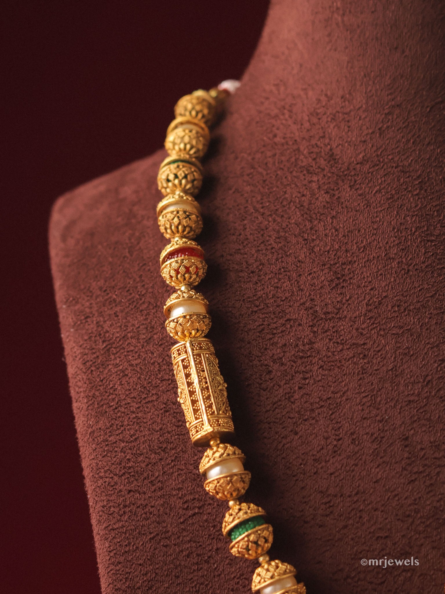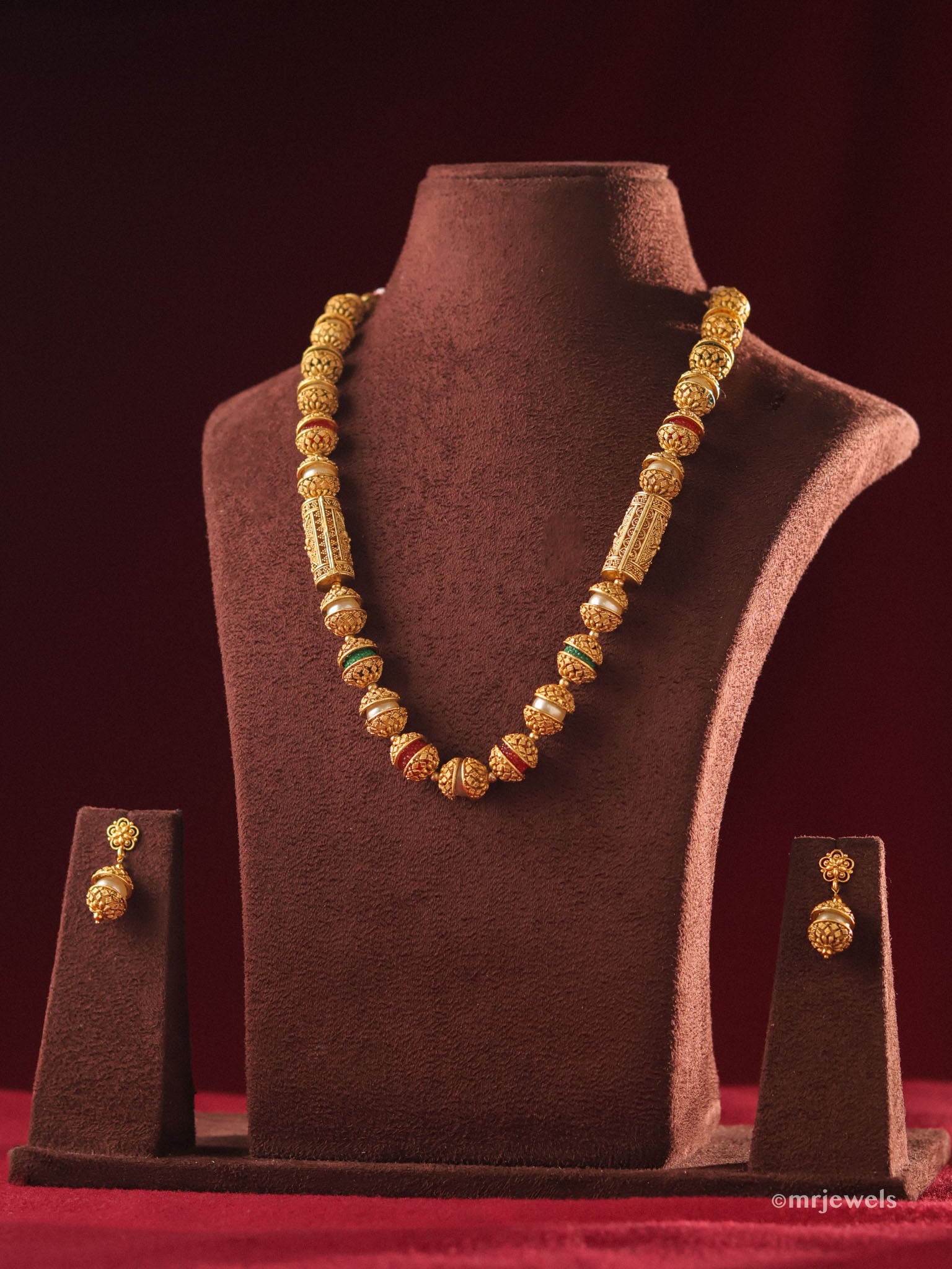 An ode to timeless tradition, this Heritage Nakshi Gold Beaded Mala Set embodies elegance in its purest form. Crafted with intricate filigree gold beads and detailed Nakshi artistry, the mala exudes a royal aura. The design is accentuated with hints of red, green, and pearl detailing, adding a subtle play of color to the regal gold tones.