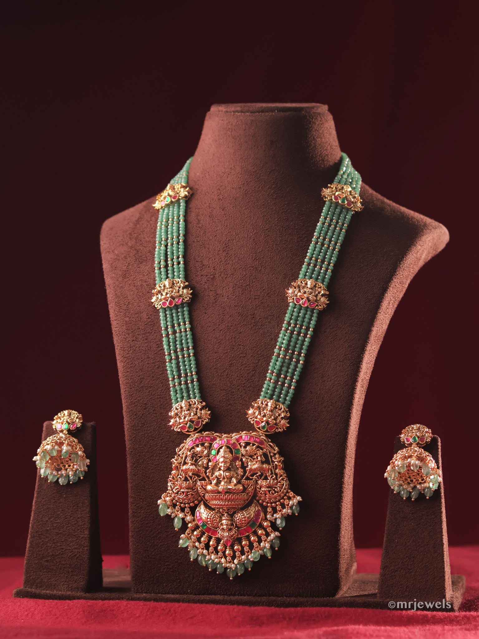 A divine blend of tradition and luxury, this Lakshmi Emerald Beaded Antique Necklace Set is a true work of temple artistry. The pendant showcases Goddess Lakshmi seated gracefully on a lotus, flanked by intricate temple motifs symbolizing prosperity and blessings. Strung with multiple strands of glowing emerald green beads, the necklace radiates opulence and grace.