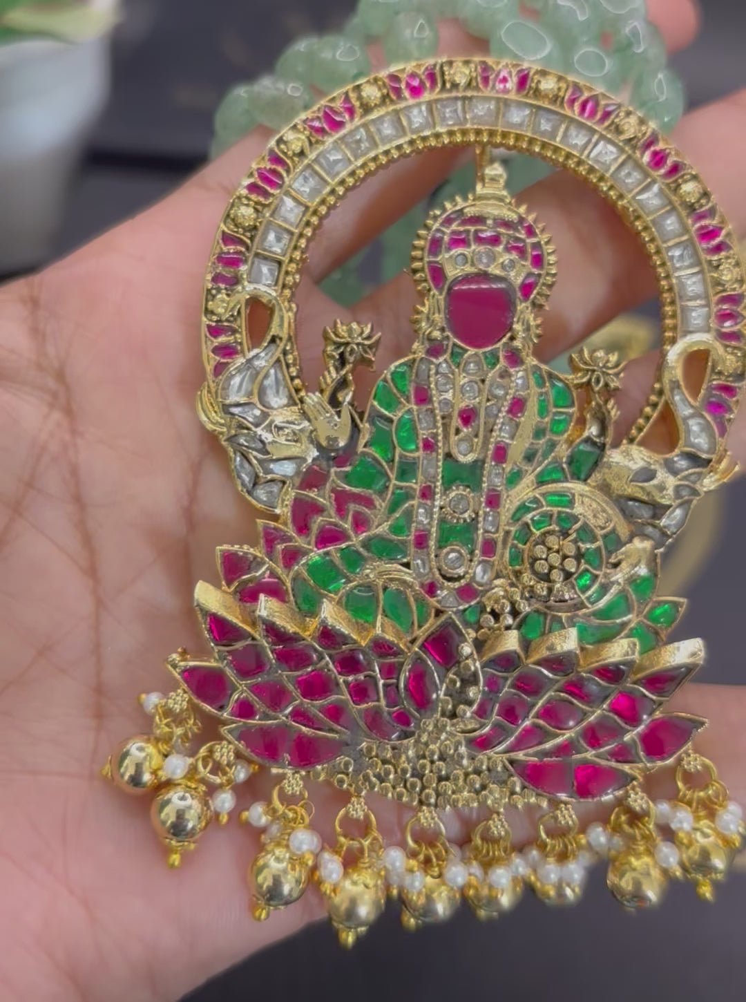 Embrace prosperity and elegance with the Lotus Grace Lakshmi Emerald Necklace. Featuring a radiant Lakshmi pendant seated on a vibrant lotus, adorned with ruby, emerald, and diamond details, paired with a triple emerald bead chain. A divine addition to your collection.