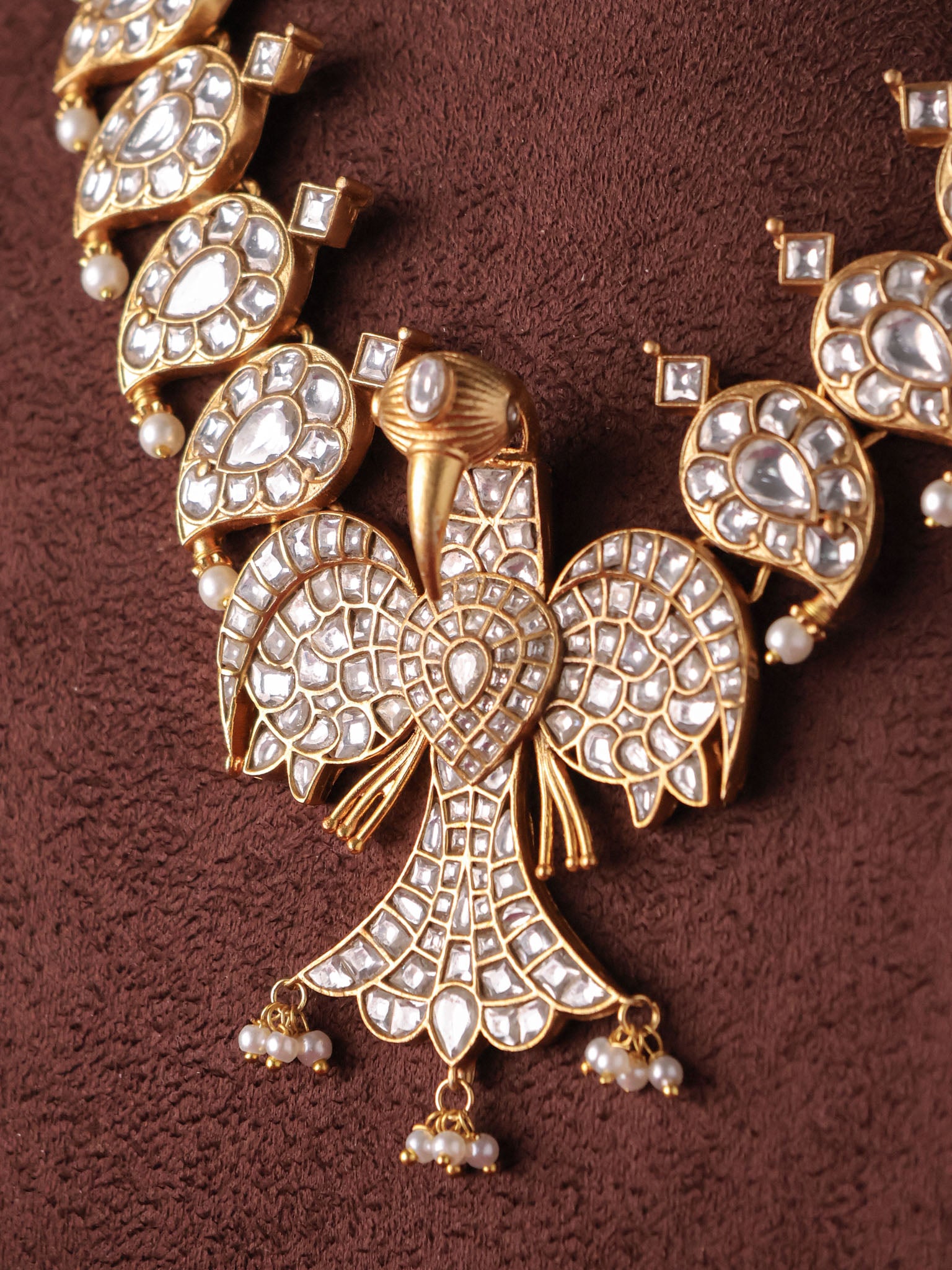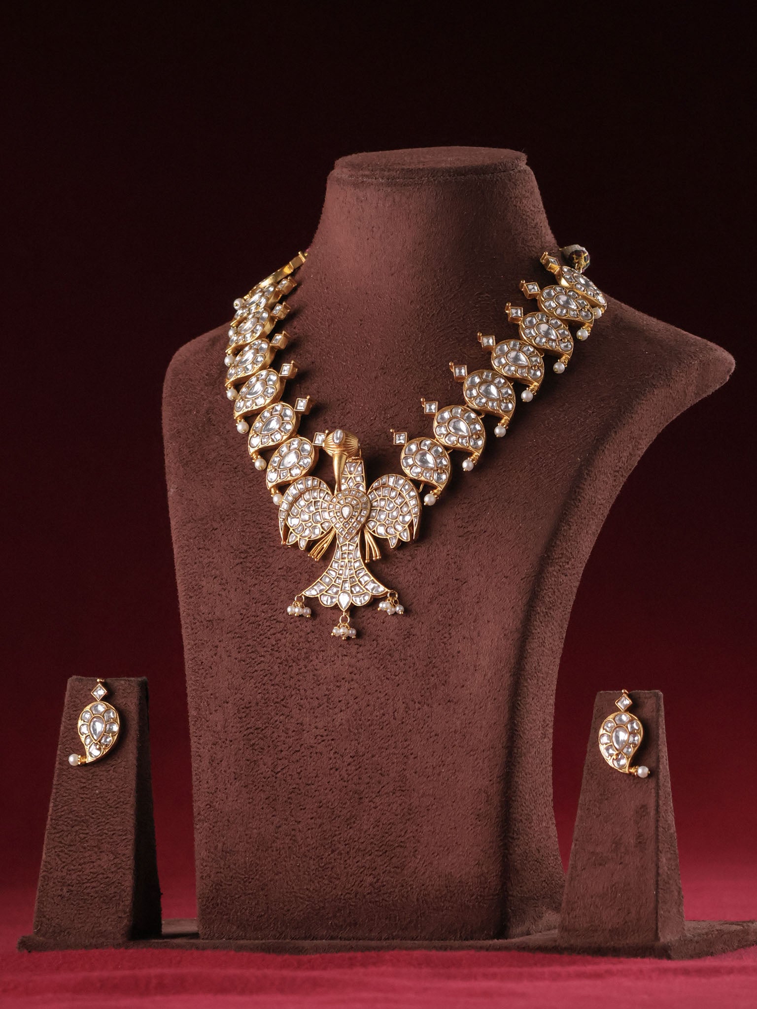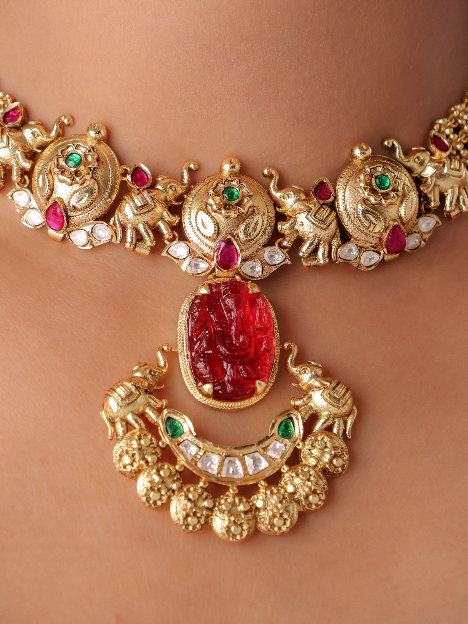 Temple jewellery is inspired by South Indian temple art and often features motifs such as Lakshmi, peacocks, and floral vines for a traditional heirloom look.