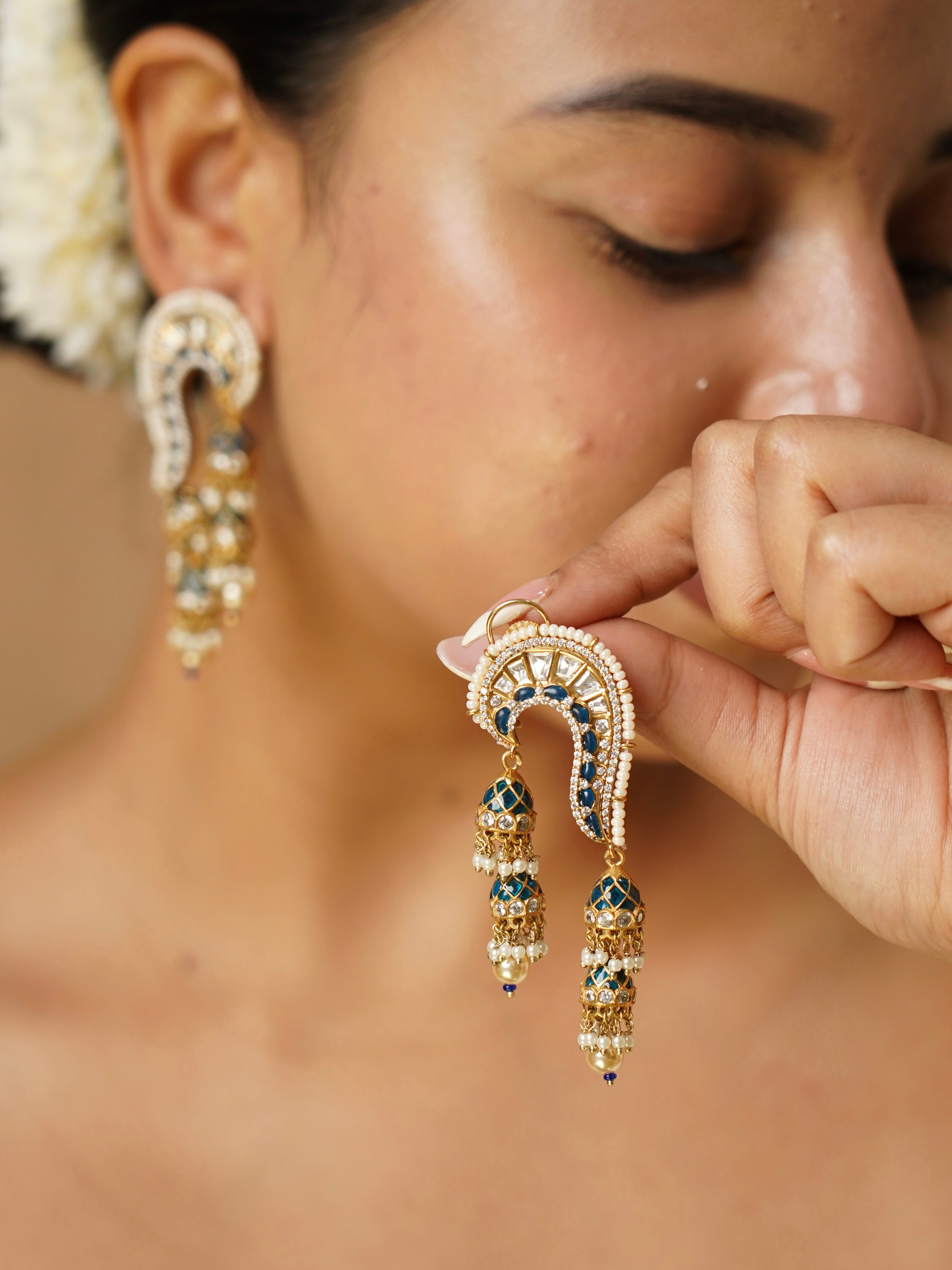 Elevate your style with these captivating double-jhumka earrings featuring sparkling Polki stones, emerald-green enamel, and pearl detailing. Crafted for traditional elegance, these earrings are ideal for bridal wear or special celebrations, adding a touch of royalty to your look.