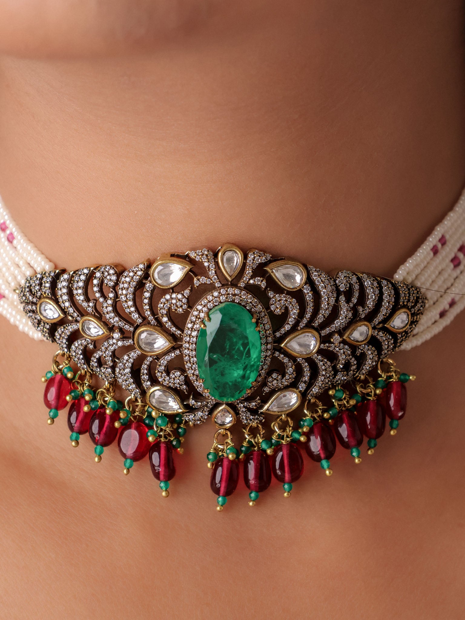 timeless statement of elegance, the a Victorian Emerald Choker Set is designed to captivate with its bold emerald centre framed by delicate diamond-inspired detailing. The multi-strand pearl base adds classic refinement, while ruby-toned drops lend a soft touch of drama and movement.